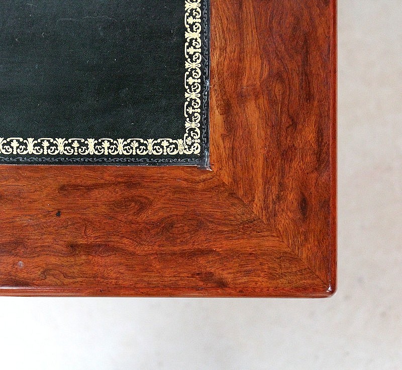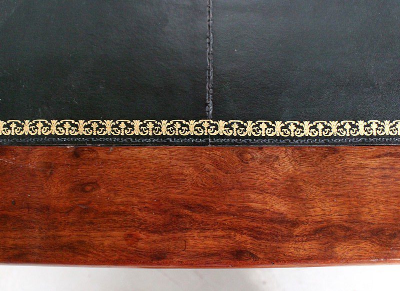 Le Plateau est garni sur sa partie intérieure d’un Cuir de Mouton Vert Forêt en Trois Éléments, dont les jonctions sont dissimulées et enjolivées par des motifs à froid. Ce revêtement est rehaussé dans son pourtour par une double Frises, et au centre par un Motif Doré en Palmette qui attire le regard. Cet espace de travail est intégré dans un encadrement en Acajou Moucheté et à coupe d’onglets.