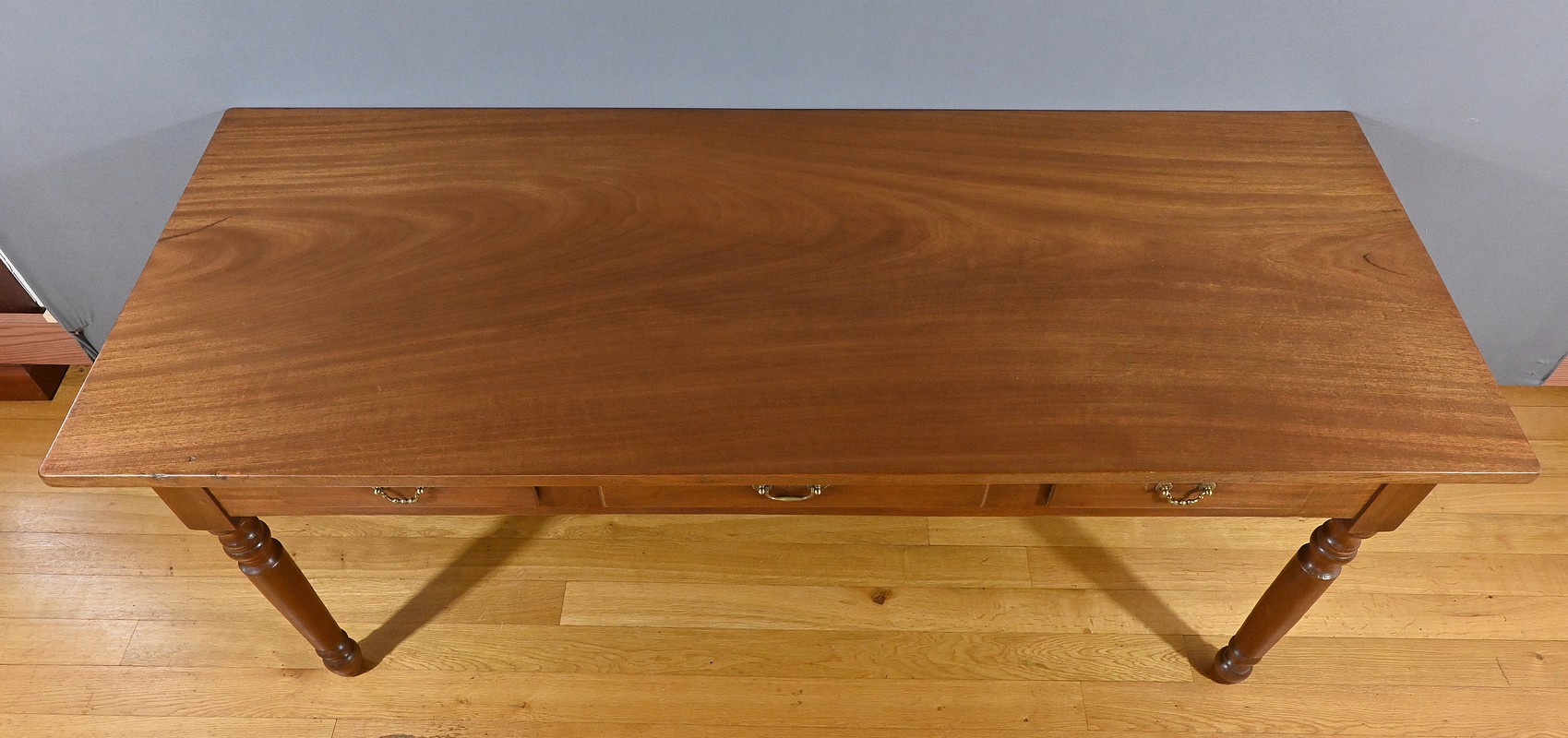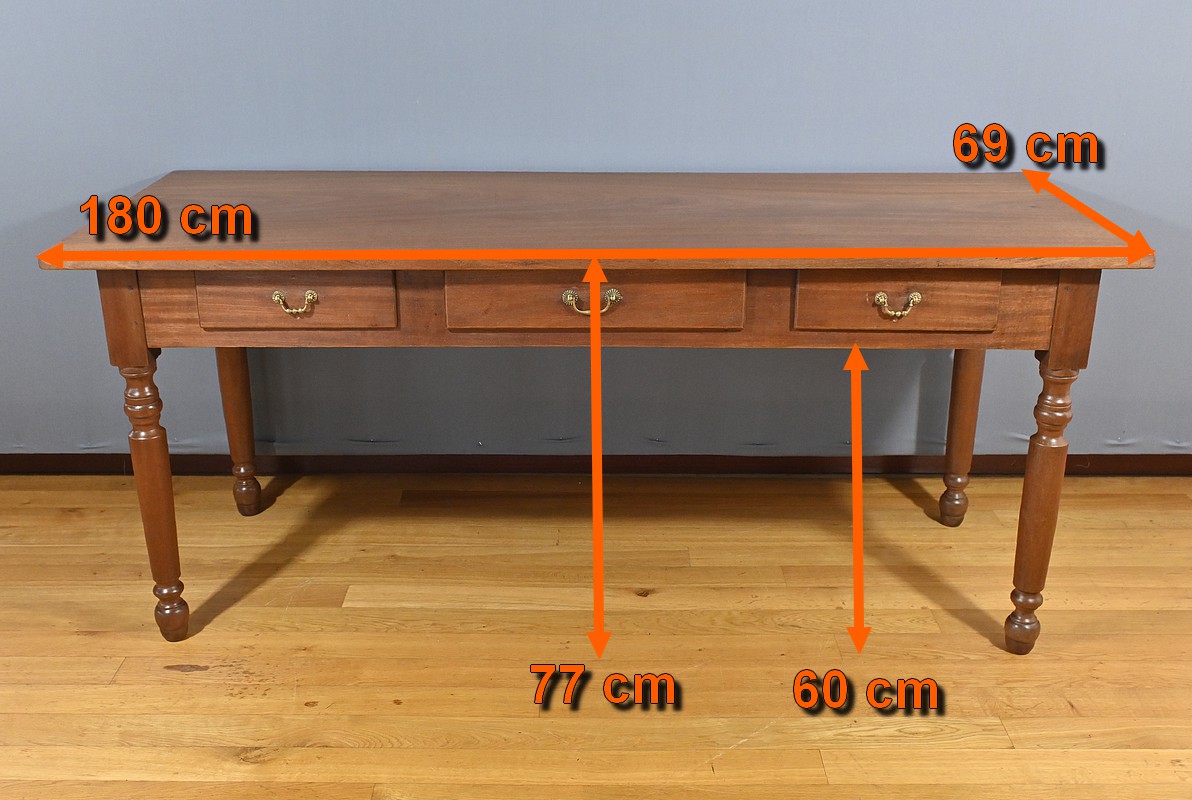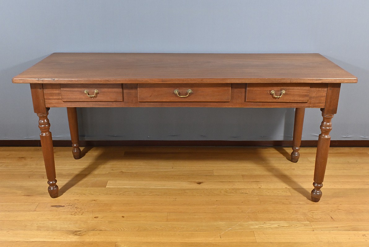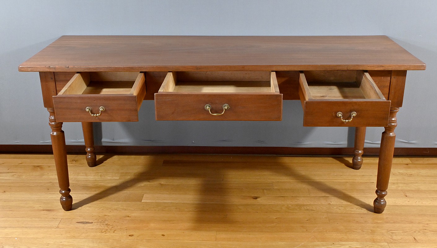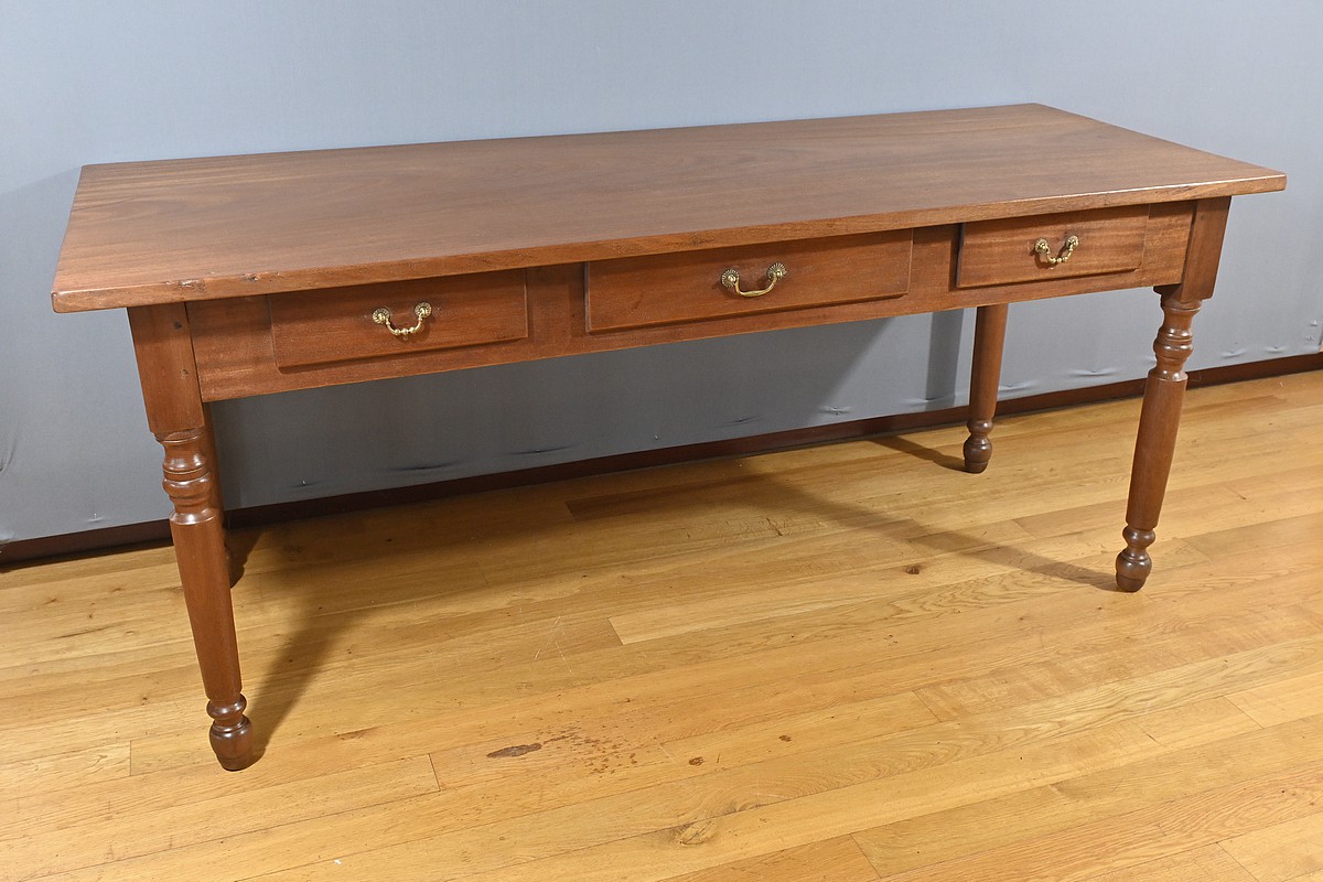 Bureau en Acajou massif muni de trois tiroirs en ceinture de taille différente, se tirant à l’aide de poignées tombantes en bronze. Ces dernières sont accompagnées de rosaces ciselées. Le dessus de ce bureau est constitué d’une seule planche d’acajou au veines nuancées. Cette table repose sur 4 pieds tournés à la forme élégante. La couleur riche et chaleureuse du bois d’acajou confère à la table un charme unique et en fait une pièce maîtresse idéale pour un bureau ou une pièce de travail. Cette table bureau est non seulement fonctionnelle, offrant un espace de travail confortable, mais aussi une pièce décorative qui rehaussera l’esthétique de tout intérieur.