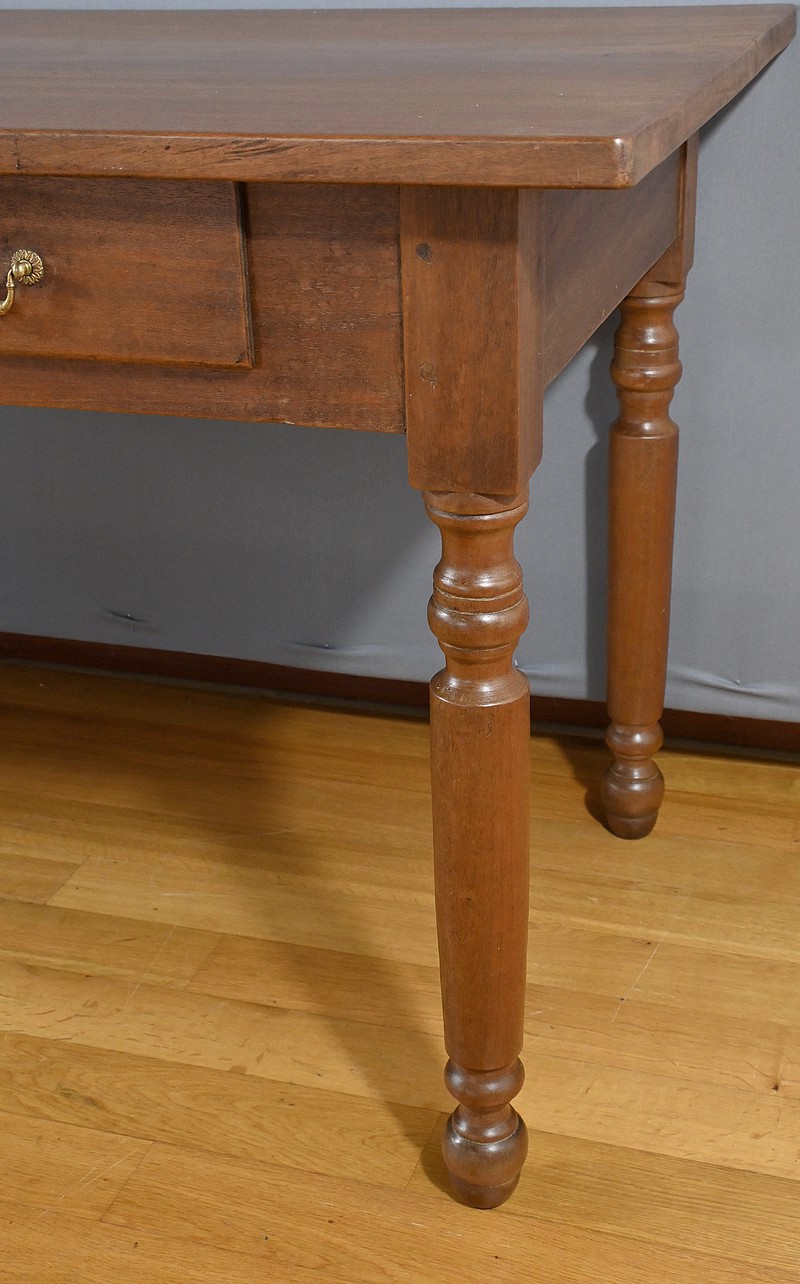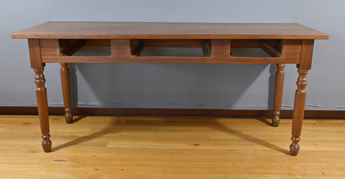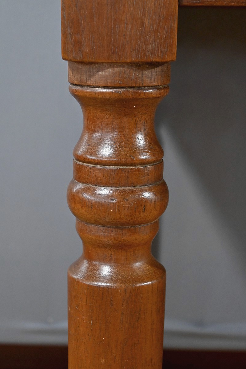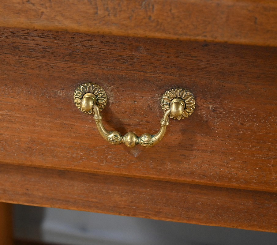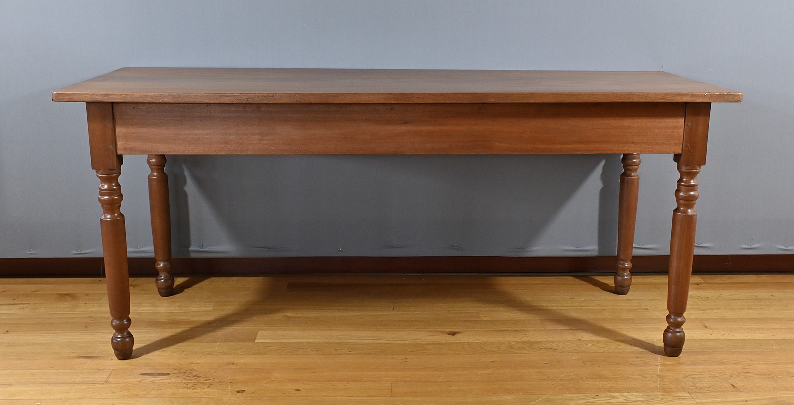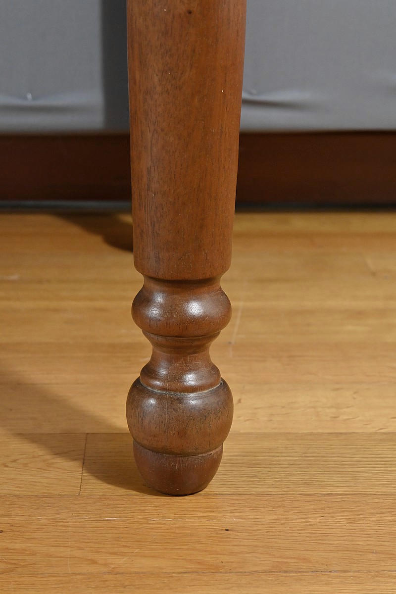 Bureau en Acajou massif muni de trois tiroirs en ceinture de taille différente, se tirant à l’aide de poignées tombantes en bronze. Ces dernières sont accompagnées de rosaces ciselées. Le dessus de ce bureau est constitué d’une seule planche d’acajou au veines nuancées. Cette table repose sur 4 pieds tournés à la forme élégante. La couleur riche et chaleureuse du bois d’acajou confère à la table un charme unique et en fait une pièce maîtresse idéale pour un bureau ou une pièce de travail. Cette table bureau est non seulement fonctionnelle, offrant un espace de travail confortable, mais aussi une pièce décorative qui rehaussera l’esthétique de tout intérieur.