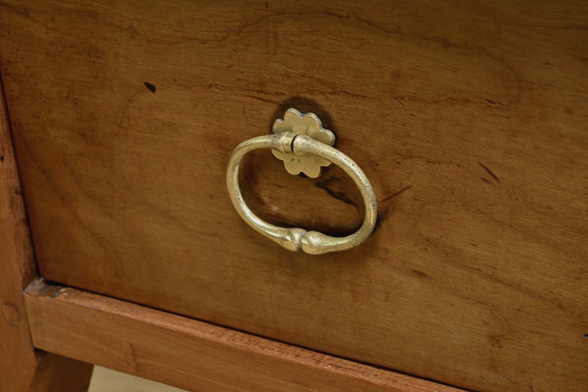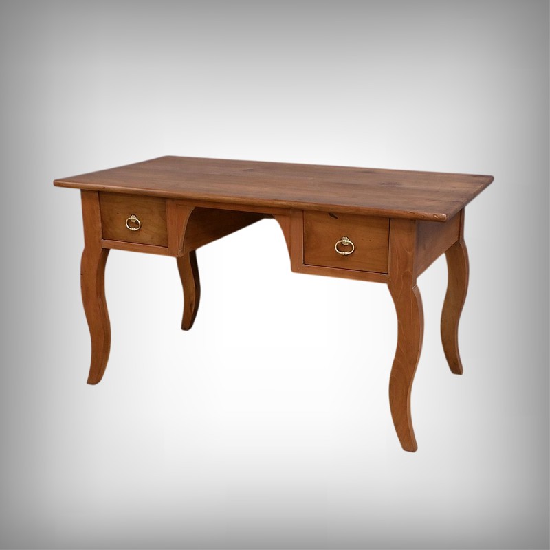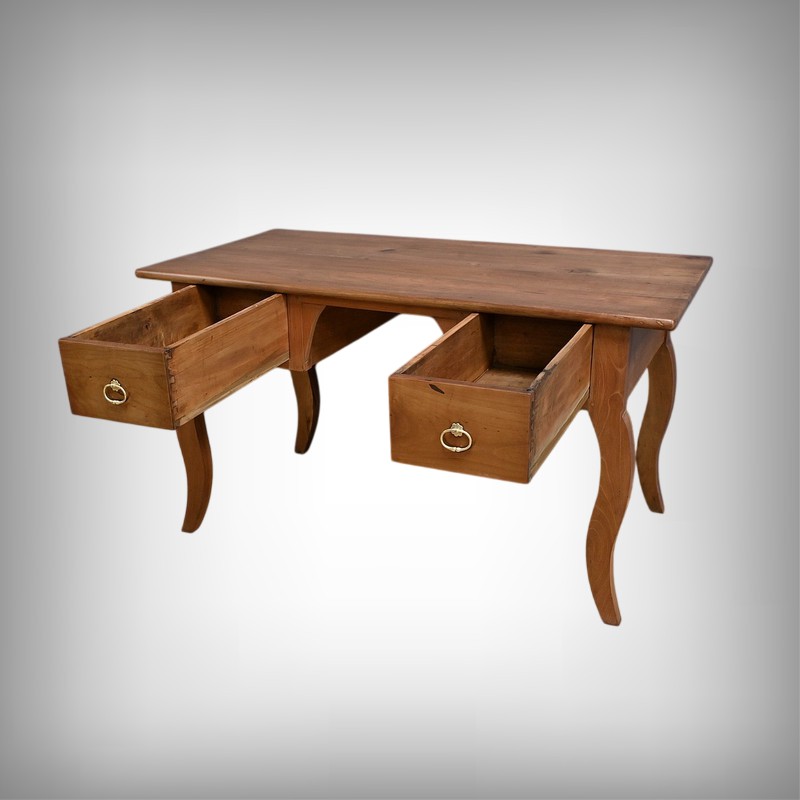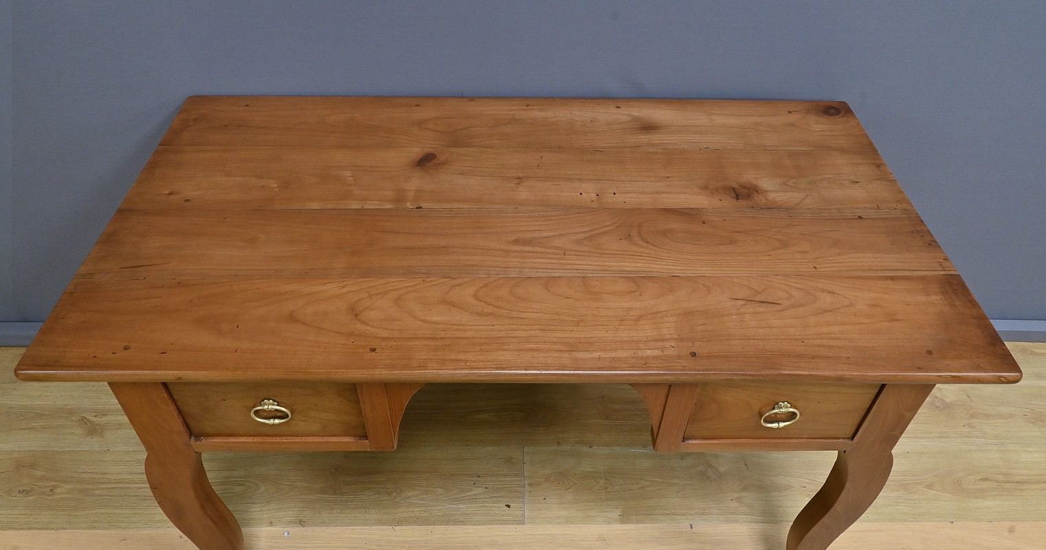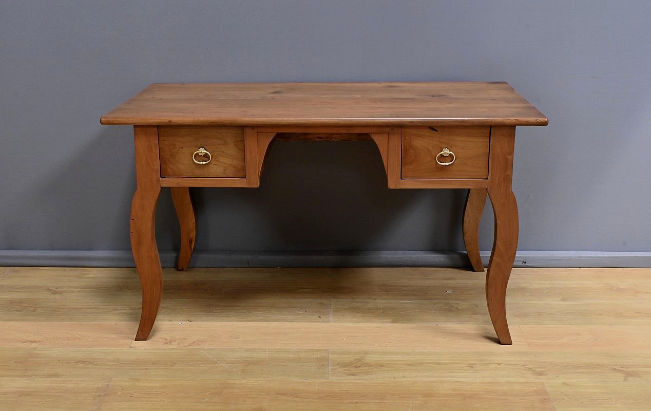 Cette table bureau en merisier massif datant de la seconde moitié du XIXe siècle, présente un plateau rectangulaire constitué de larges planches bien jointives. Ce mobilier possède deux tiroirs profonds, ornés de poignées en laiton en forme d’anneaux. Les pieds galbés, typiques du style Louis XV, ajoutent une touche de raffinement. Le bois de merisier, avec sa finition cirée et sa teinte chaleureuse, met en valeur la richesse de sa texture naturelle. Un meuble intemporel qui allie fonctionnalité et esthétique.