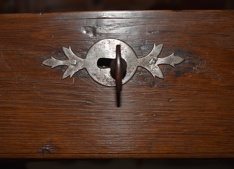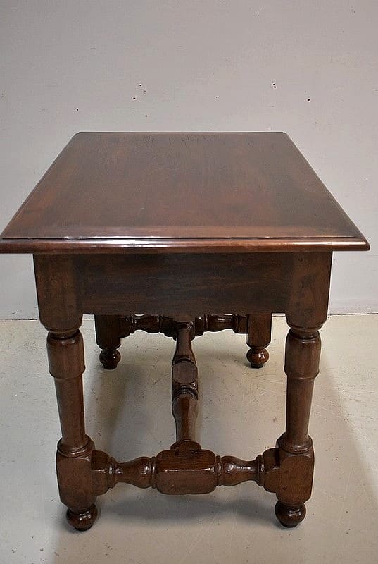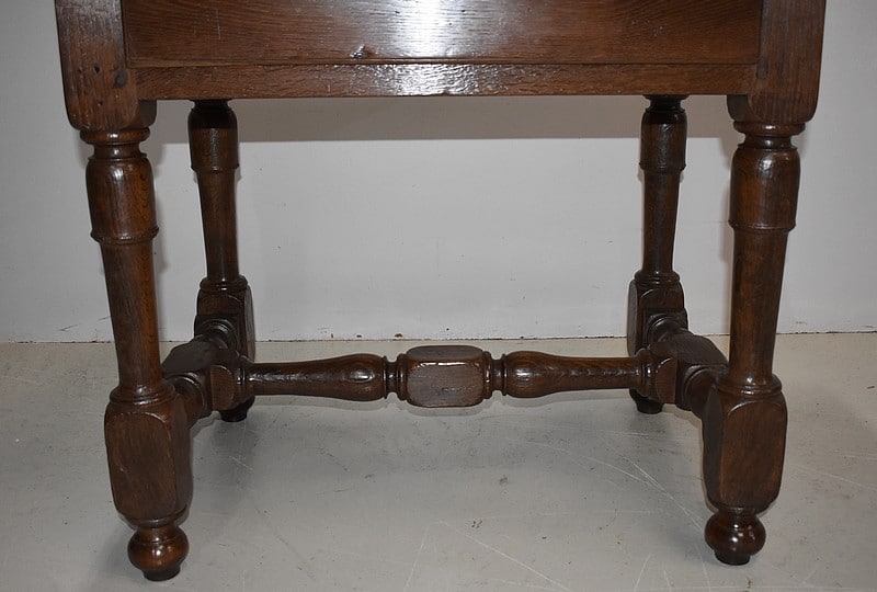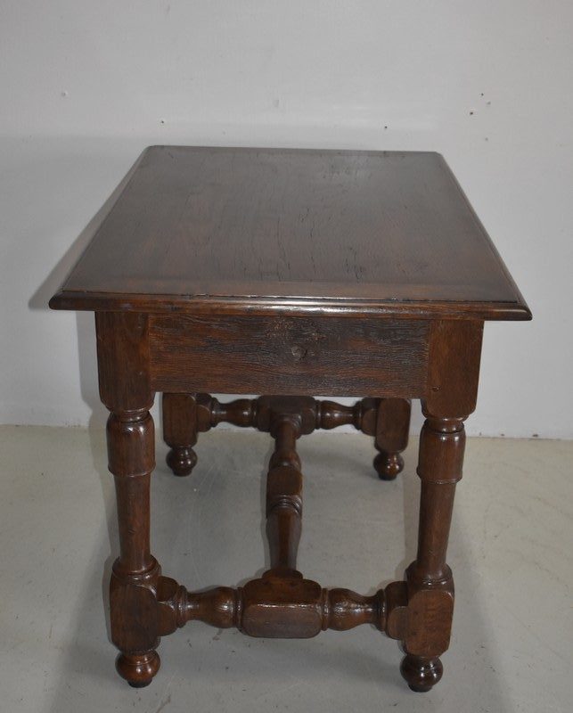 Petite table-bureau Louis XIV en chêne, ouvrant par un tiroir en ceinture, fermant à clé , l’entrée de serrure est en fer à décor de fleur de lys, la serrure d’origine est en état de fonctionnement.