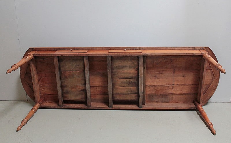 Elle ouvre par 2 tiroirs dans la ceinture et repose sur 4 pieds tournés.