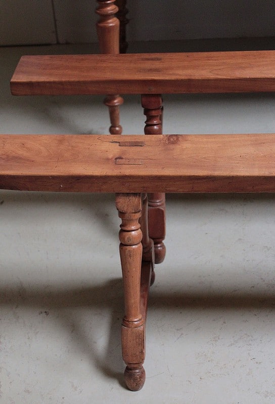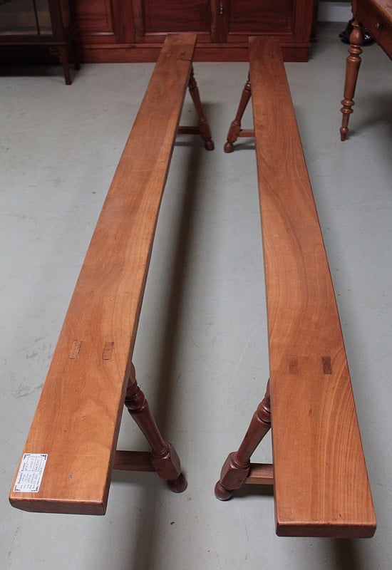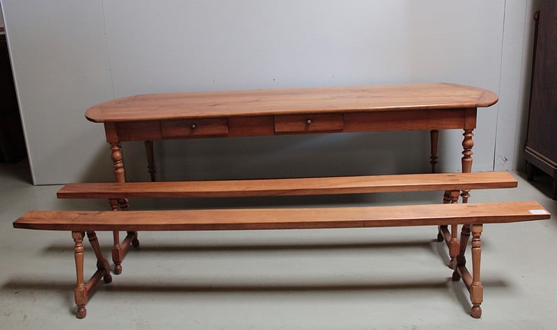 Parfait état après restauration, décapage et patine cirée dans notre atelier. On propose une paire de bancs qui peut convenir autour de cette table.