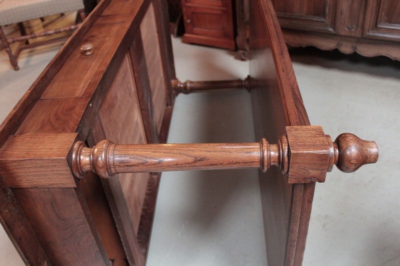 Table de drapier en chêne à double plateau, ouvrant par 2 tiroirs et reposant sur 4 pieds ronds tournés. Sa hauteur sous le bandeau est de 60cm.