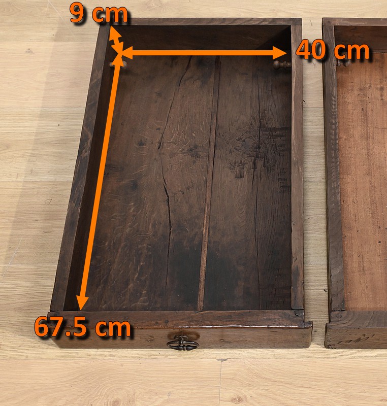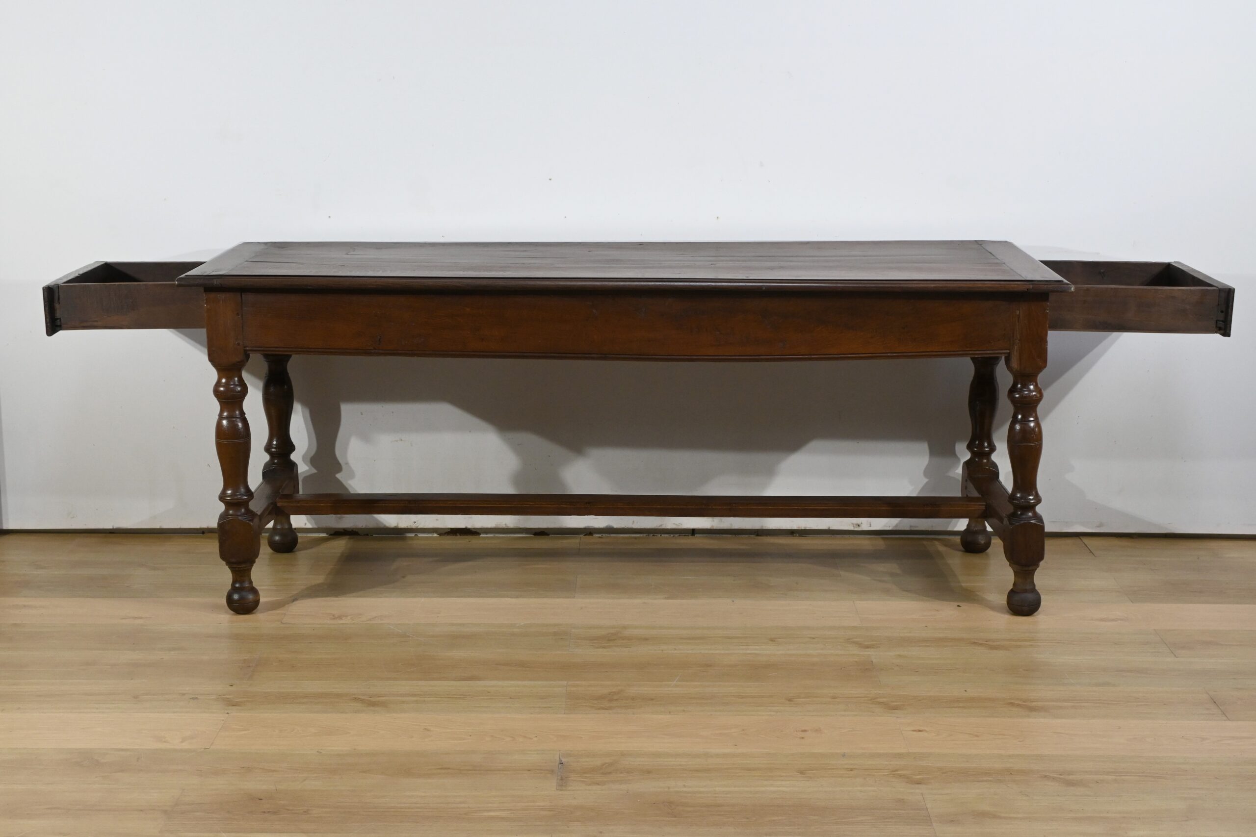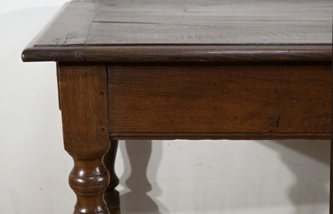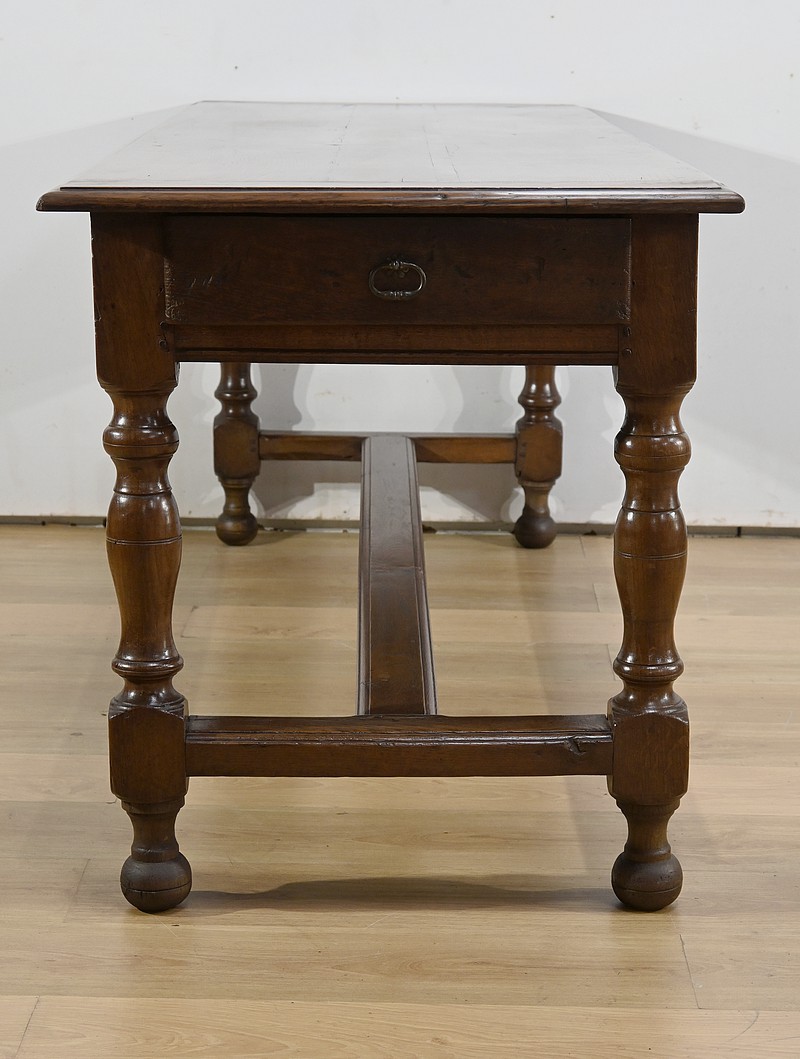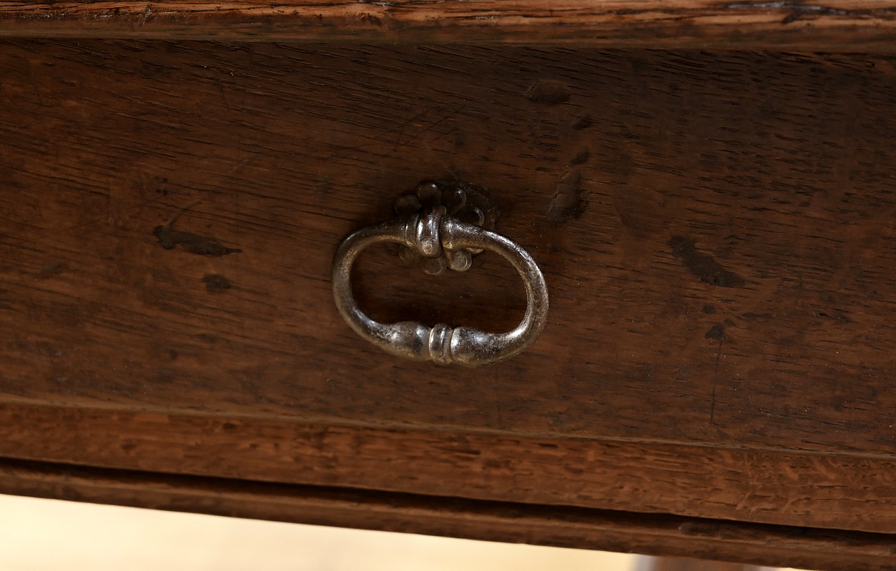 Cette grande table de ferme en chêne ouvre en ceinture par deux tiroirs latéraux avec poignées tombantes en fer.