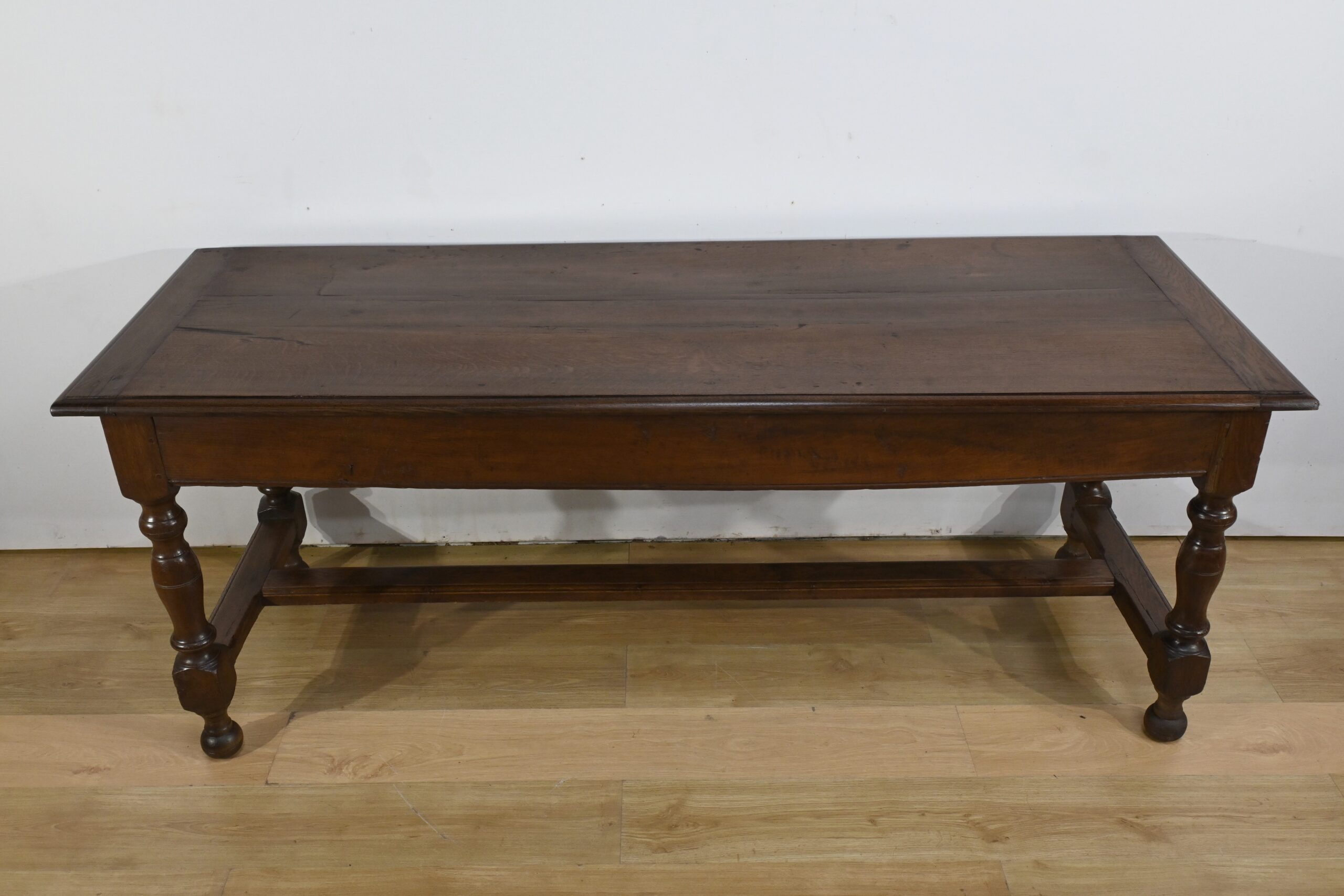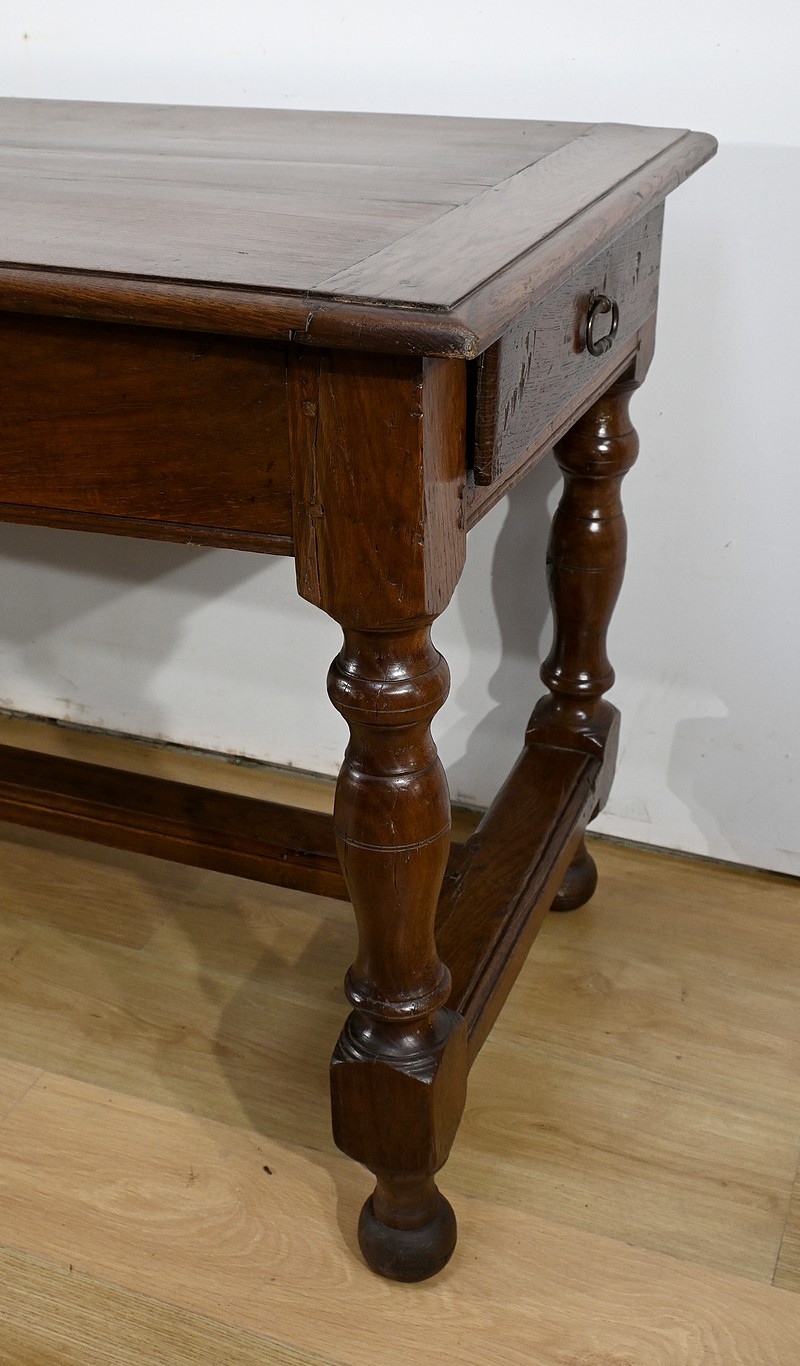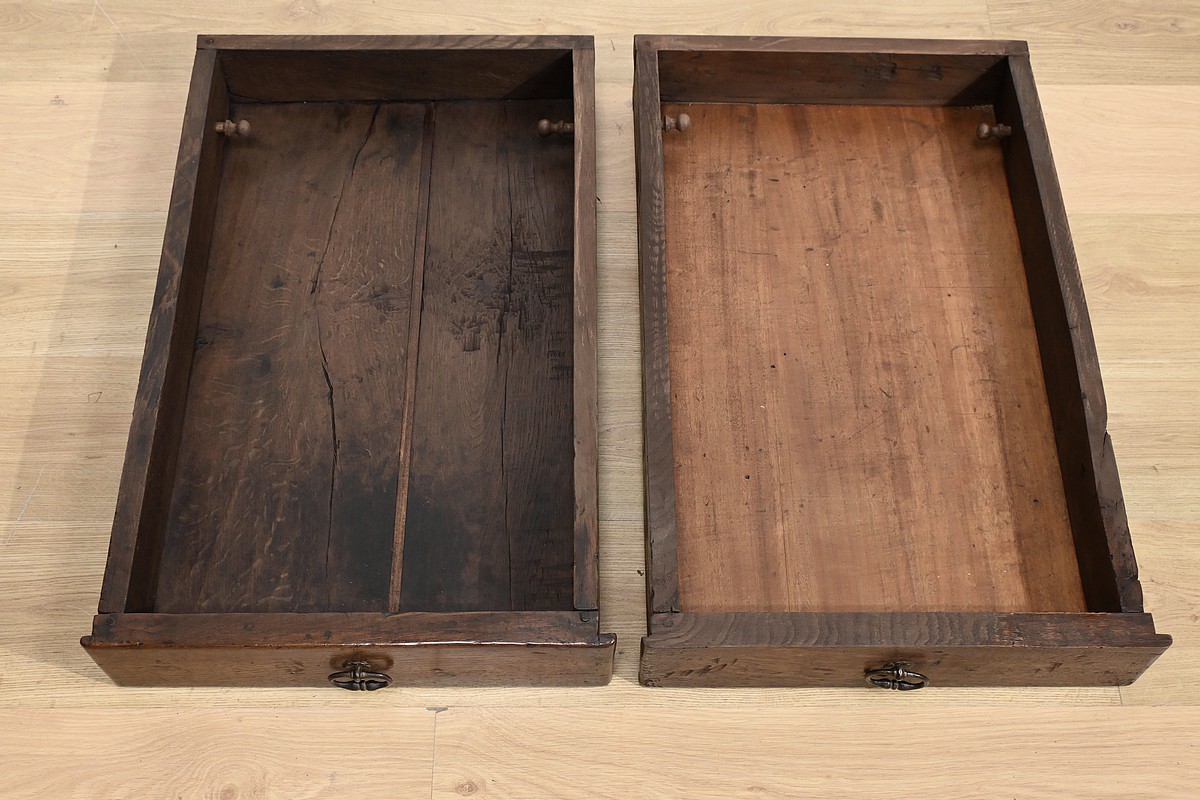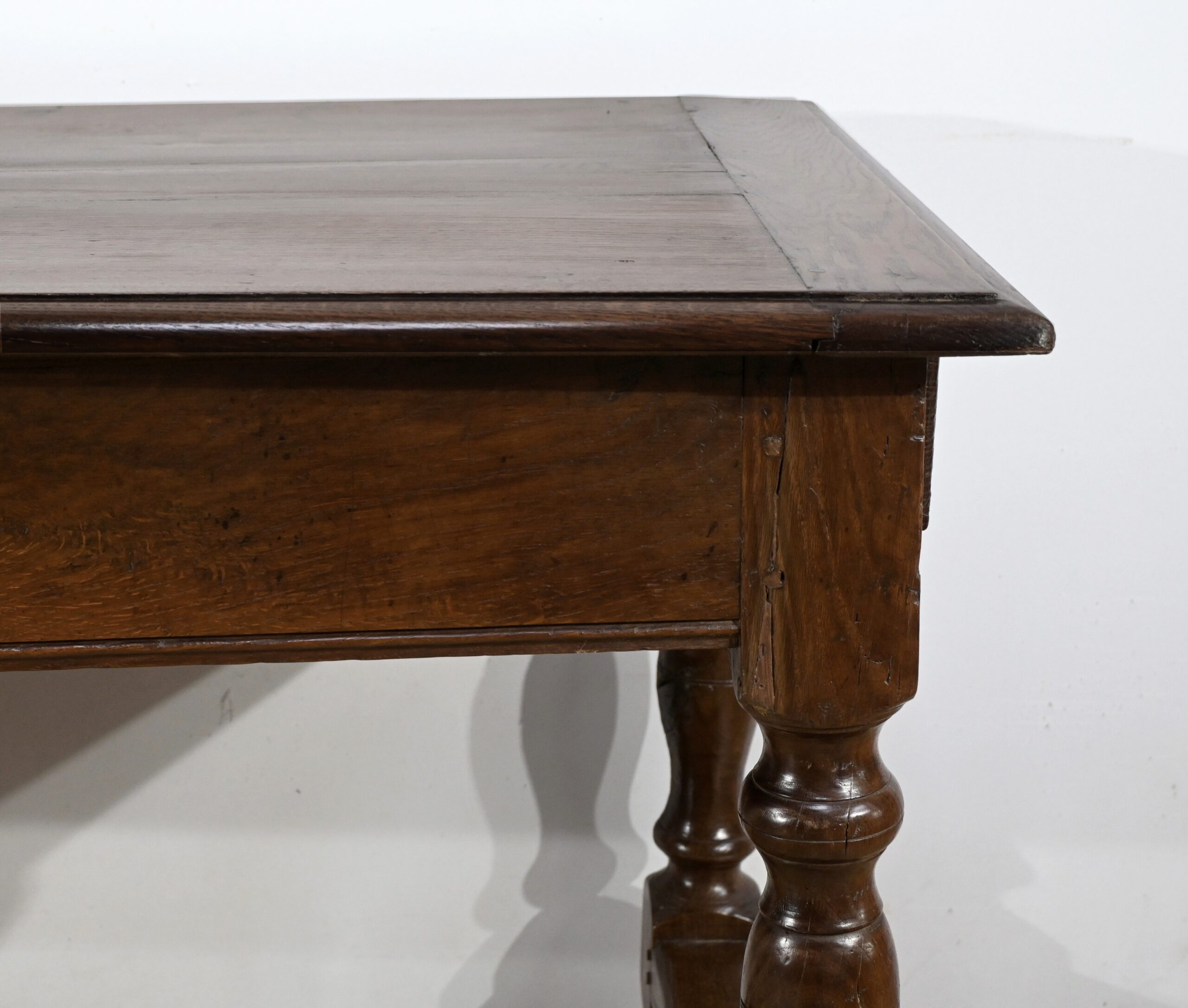Cette grande table de ferme en chêne ouvre en ceinture par deux tiroirs latéraux avec poignées tombantes en fer.