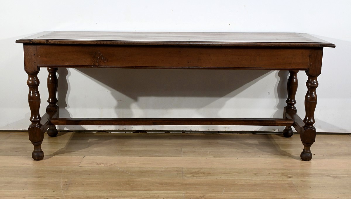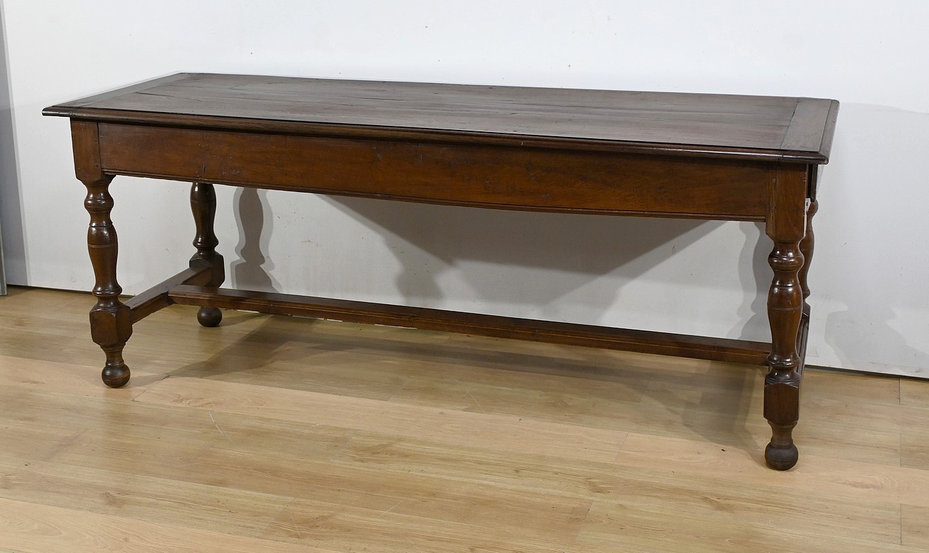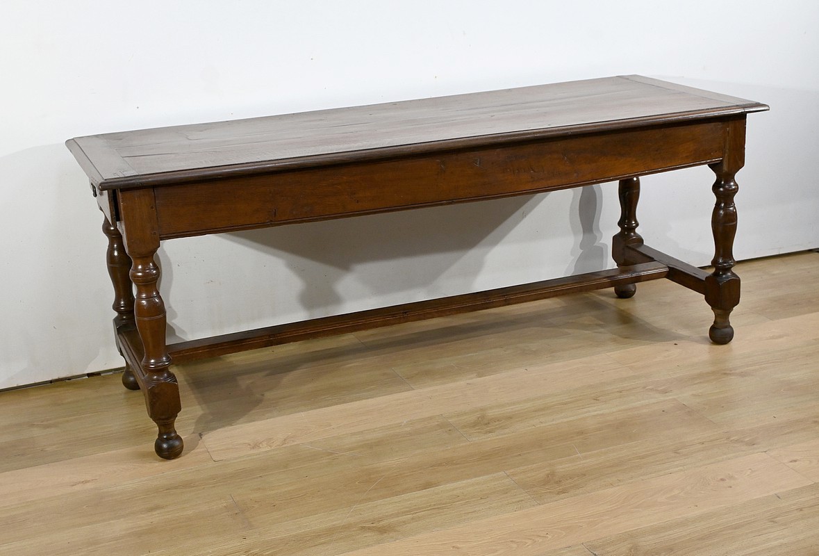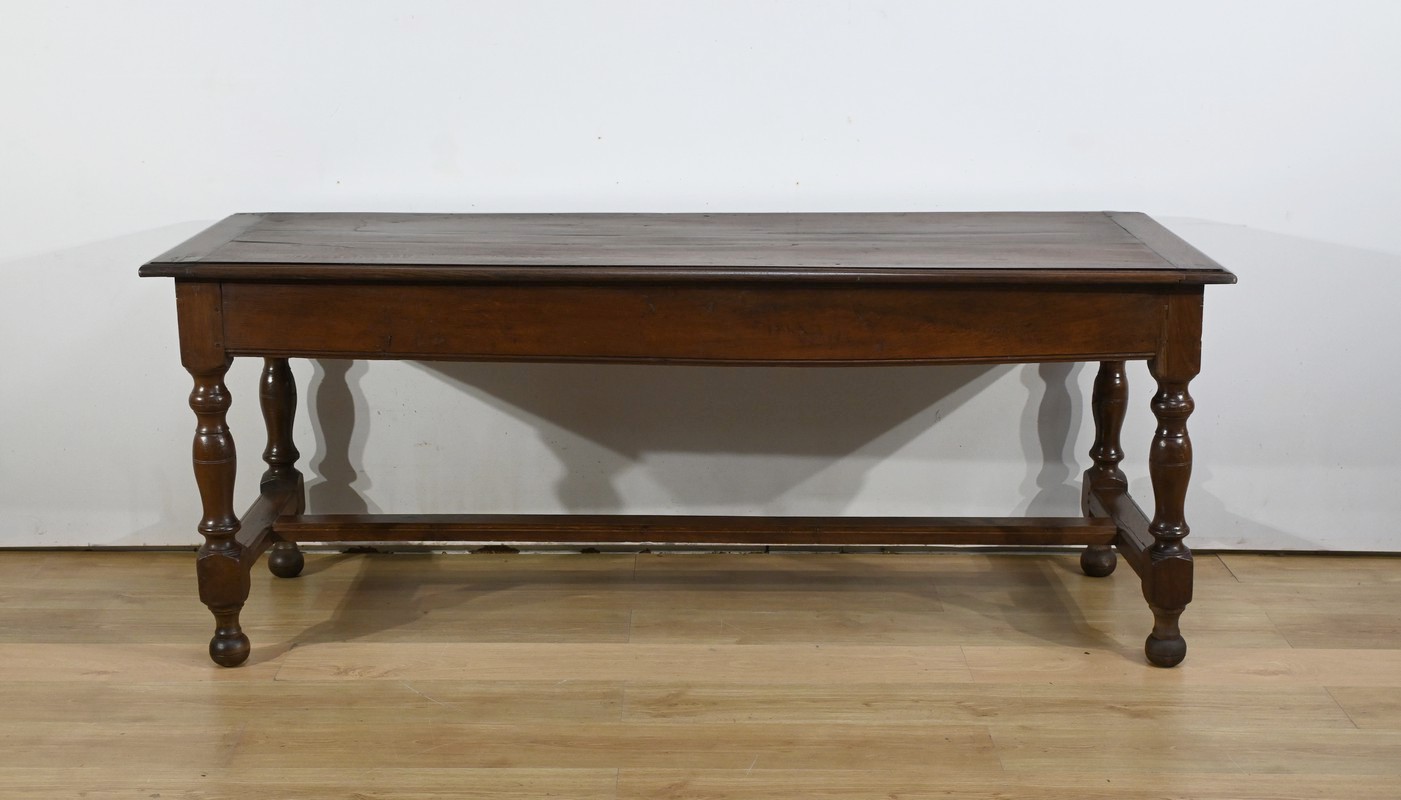 Cette grande table de ferme en chêne ouvre en ceinture par deux tiroirs latéraux avec poignées tombantes en fer.