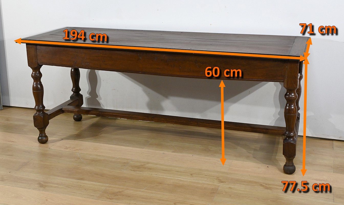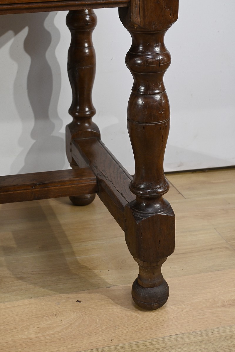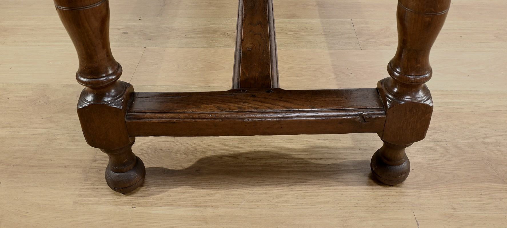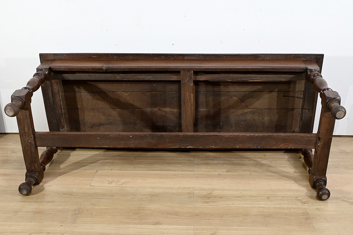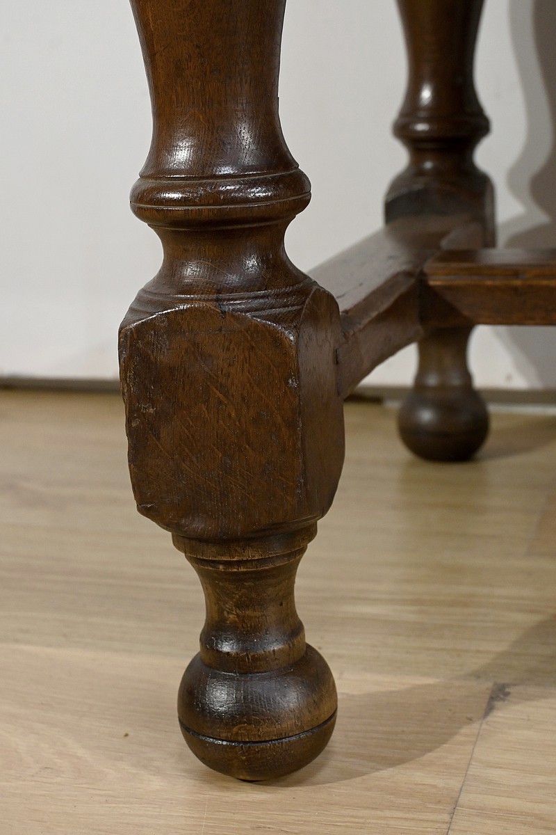 L’ensemble repose sur des pieds tournés, avec moulures annelées, se terminant en boule.