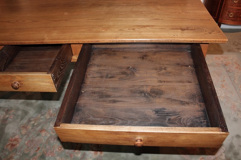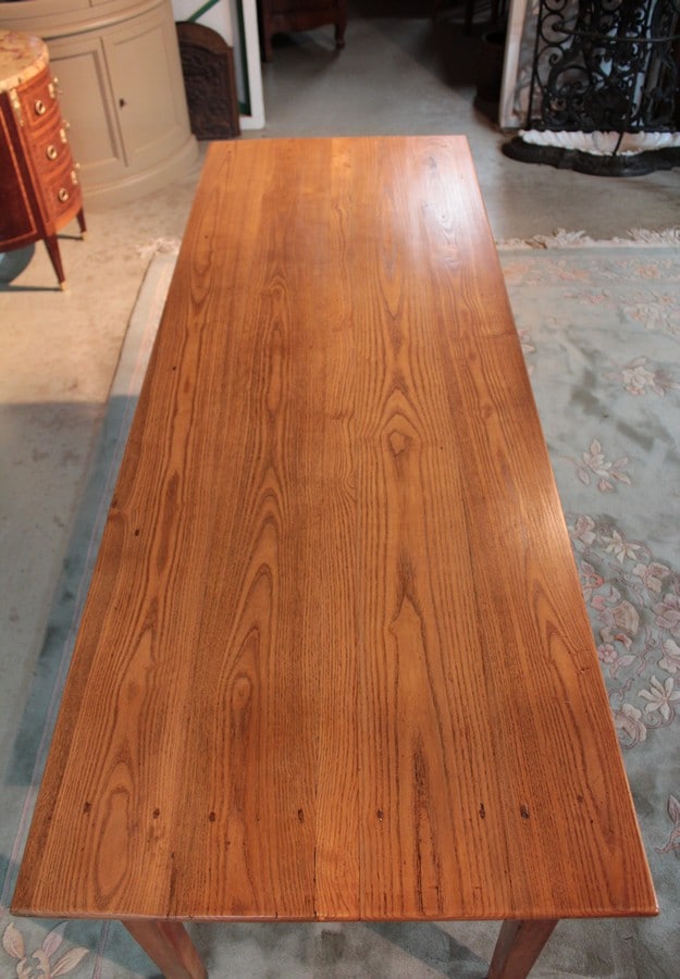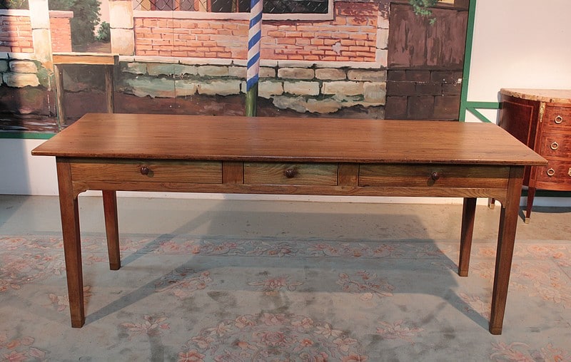 Table de ferme en frêne reposant sur 4 pieds droits dont les bas ont été refaits sur 3 cm. Elle ouvre par 3 tiroirs dans la ceinture. La hauteur sous le bandeau, pour le passage des jambes, est de 61cm. Époque : fin XIXe
