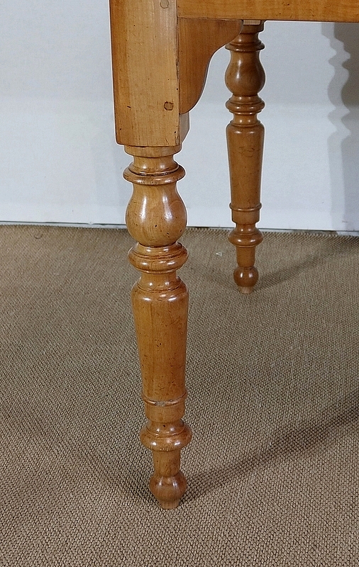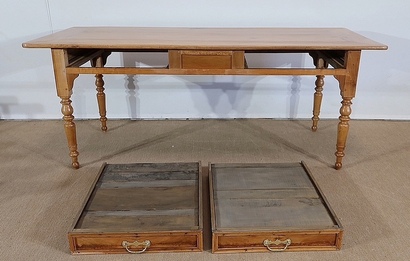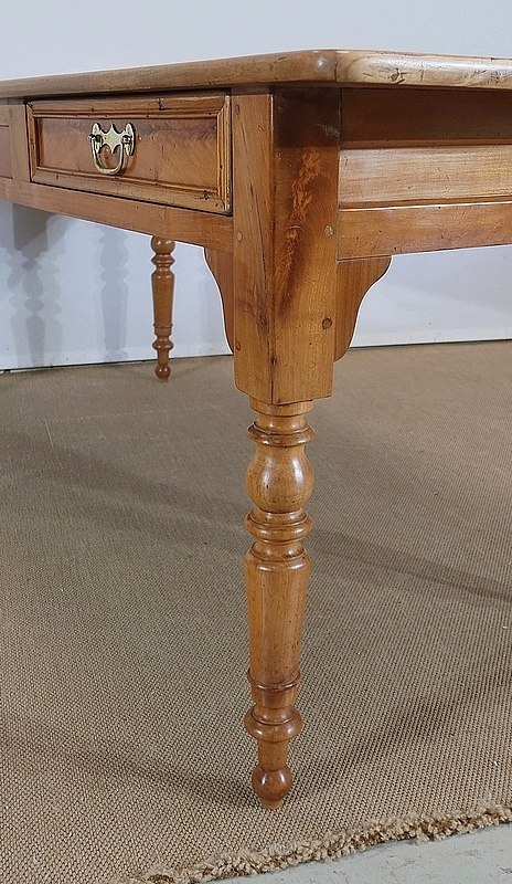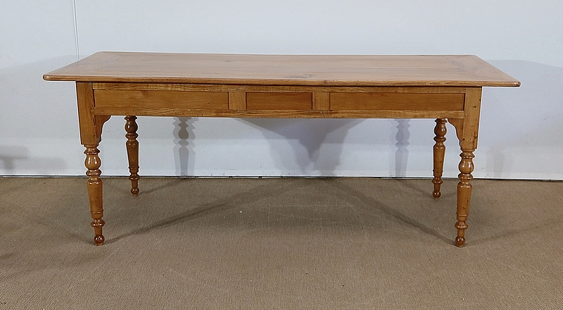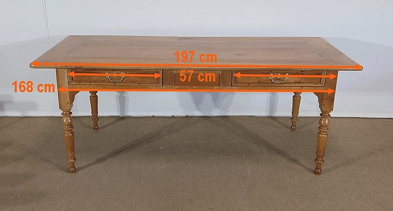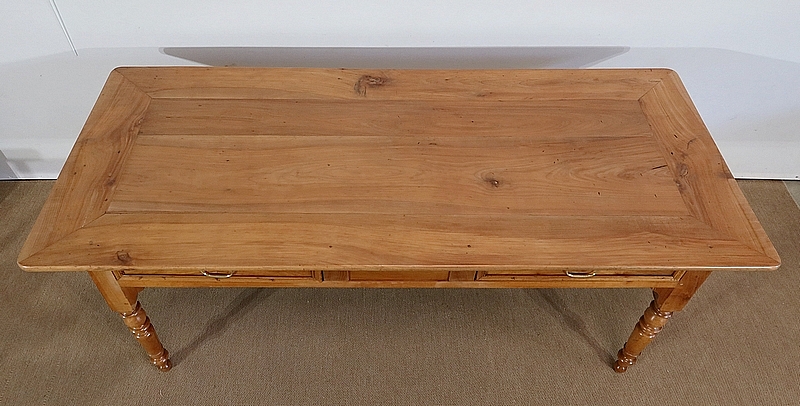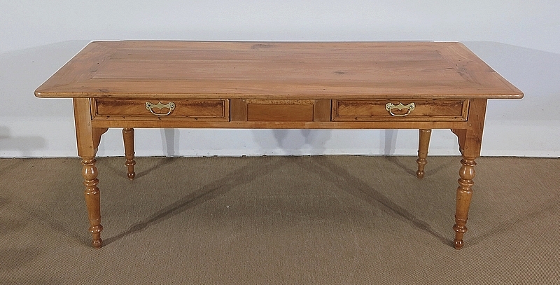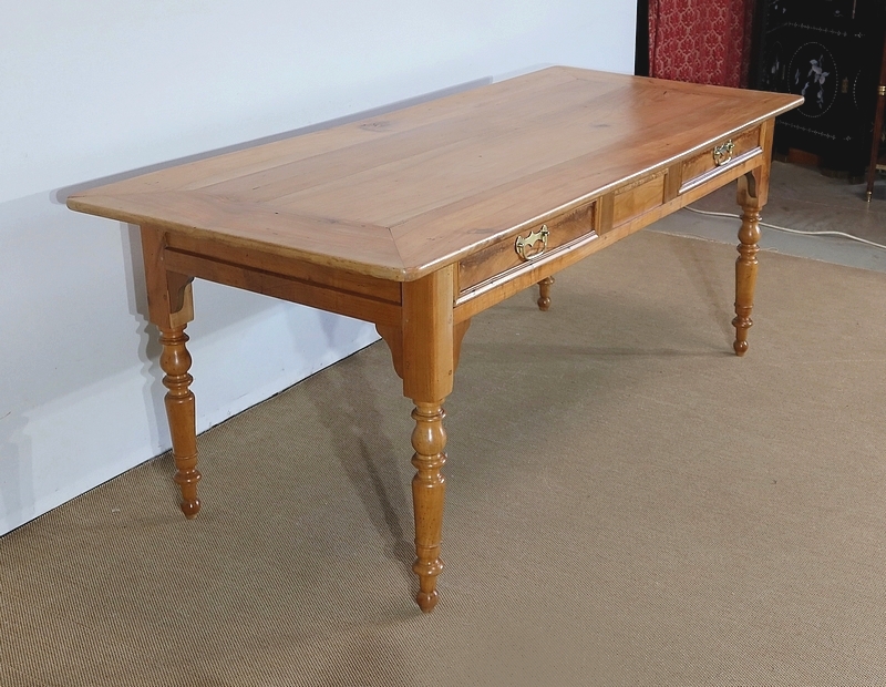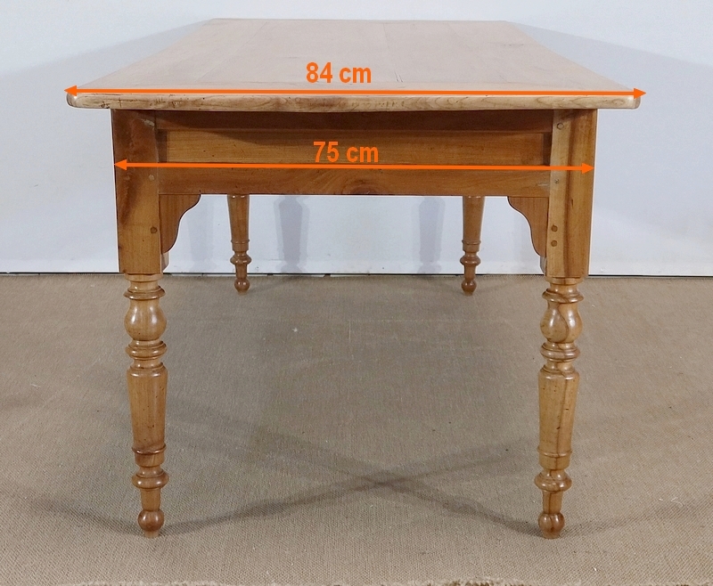 Grande table de ferme de la région de Rennes en merisier massif, dotée d’un dessus composé de 4 larges planches formant l’encadrement, se rejoignant aux angles à coupe d’onglet. Au centre, nous retrouvons 2 planches bien jointives (sans utilisation de matière composite). Les côtés de ce dessus sont à débordements.