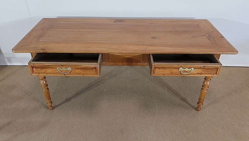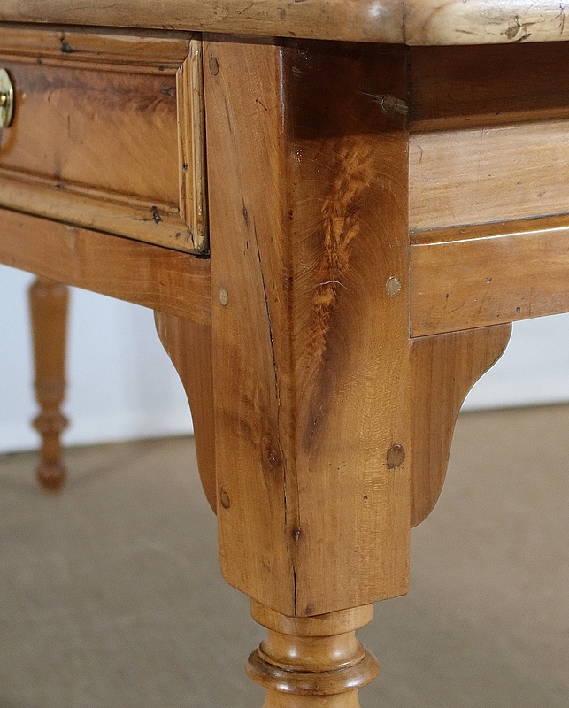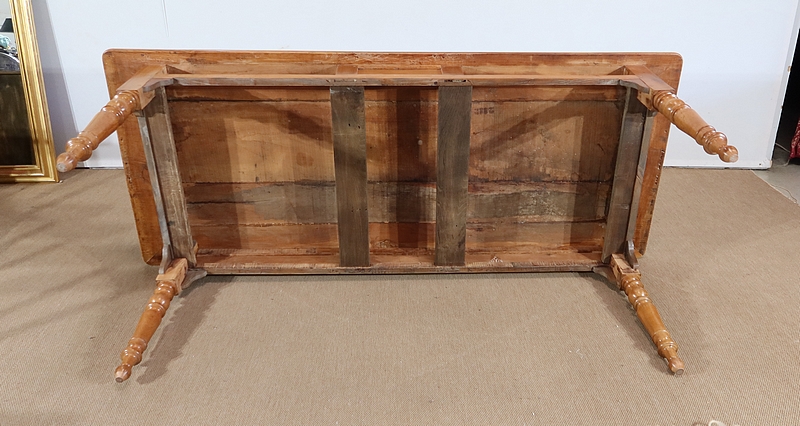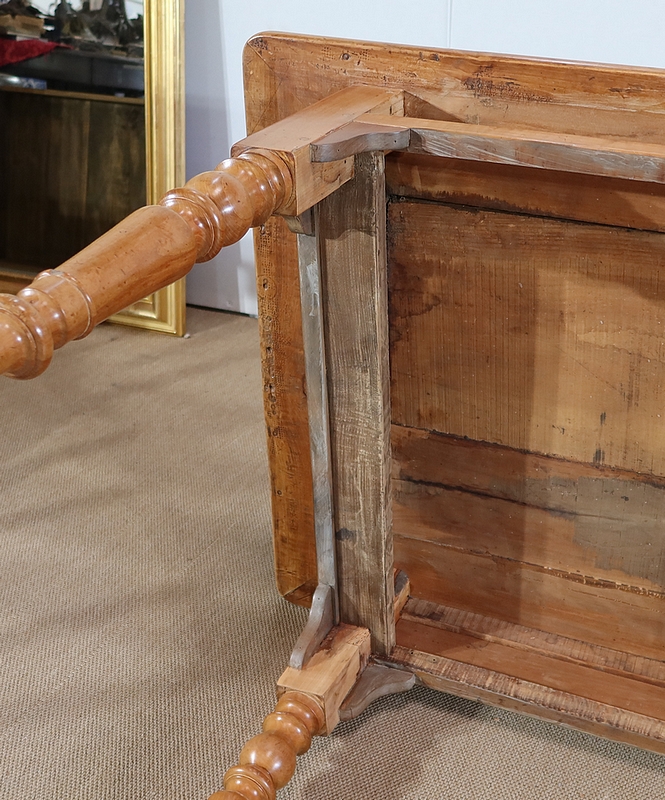 Les côtés et l’arrière de ce meuble authentique présentent de belles traverses et des panneaux à réserve. Dans son pourtour, cette table est garnie de console à chaque angle.