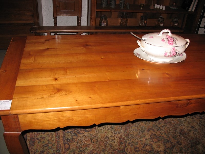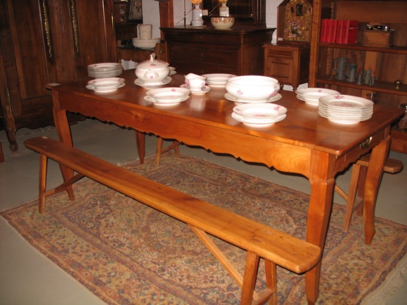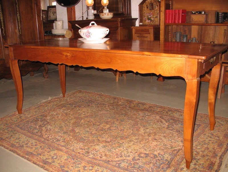 Belle table de ferme dite ‘à Gibier’ en merisier. 2 tablettes et 1 petit tiroir à l’une des extrémités , pieds galbés. Région de Rennes. Milieu XIXe (1850)