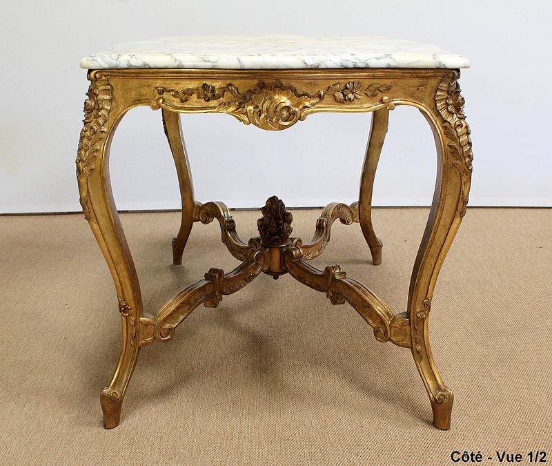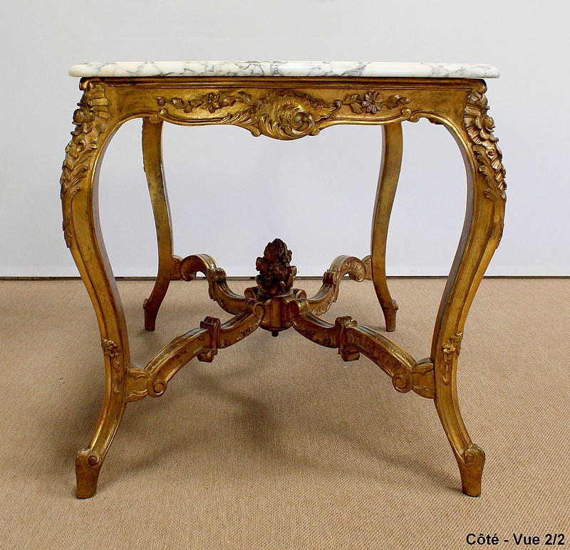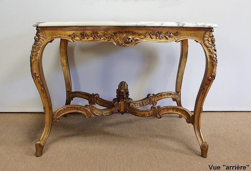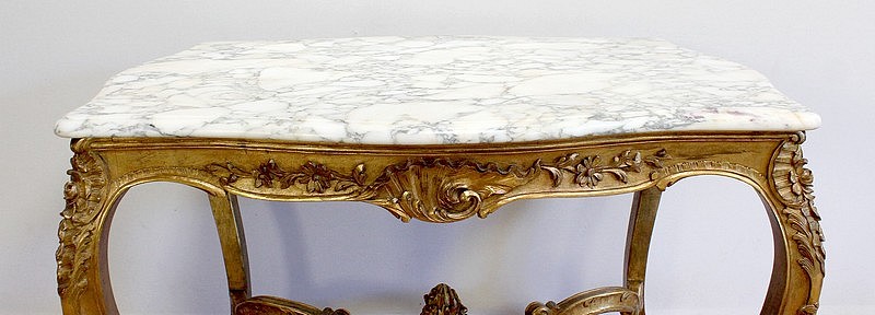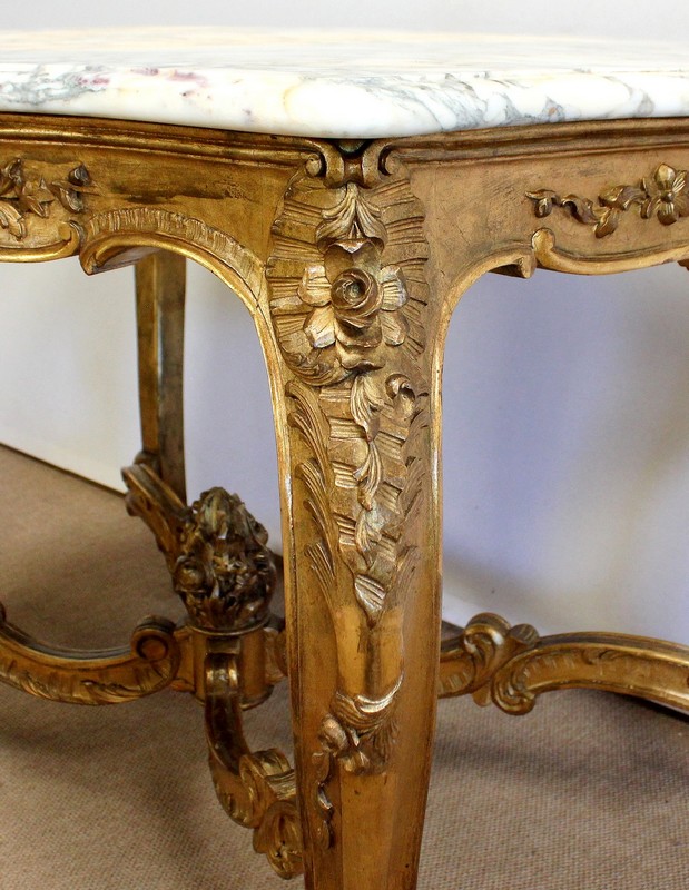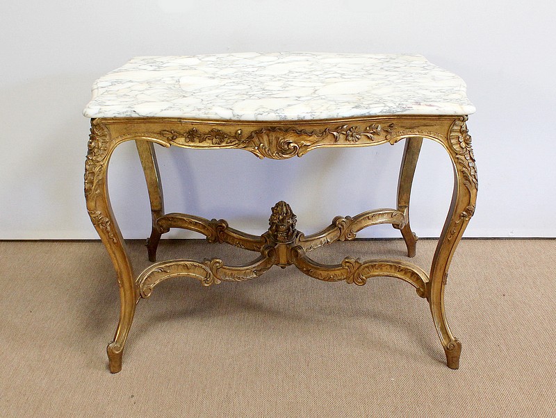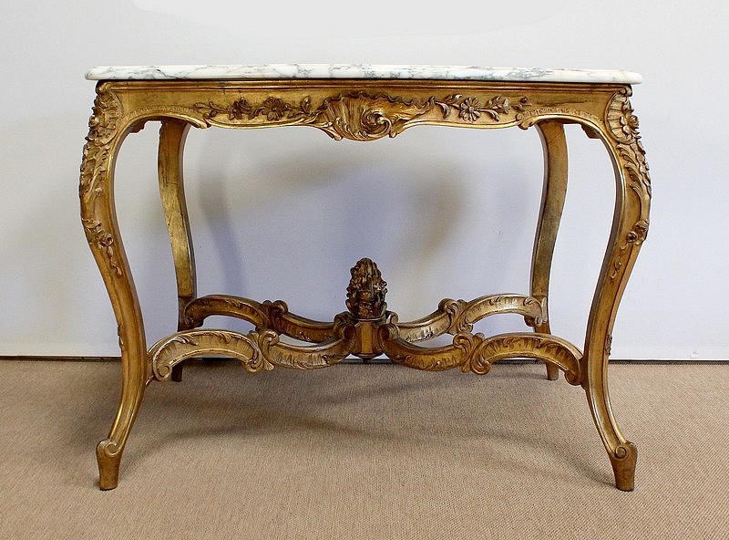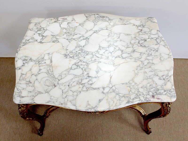 Table de milieu en bois doré composée d’un grand marbre brèche blanc lumineux et d’une ceinture sinueuse sculptée de rocailles et de fleurs délicates.