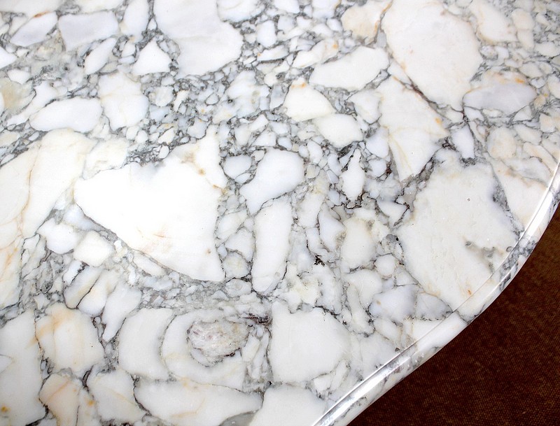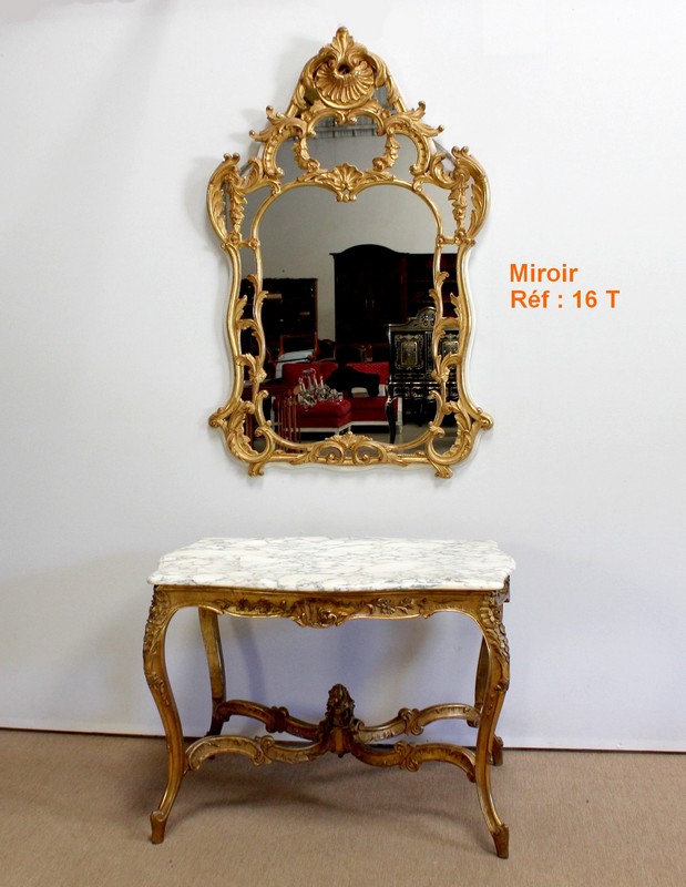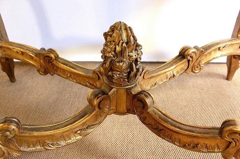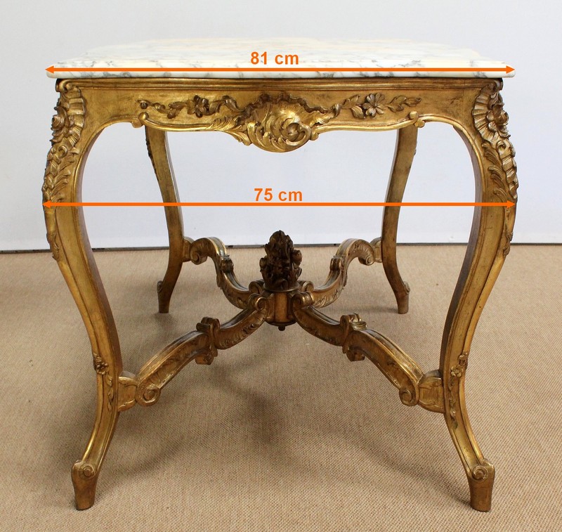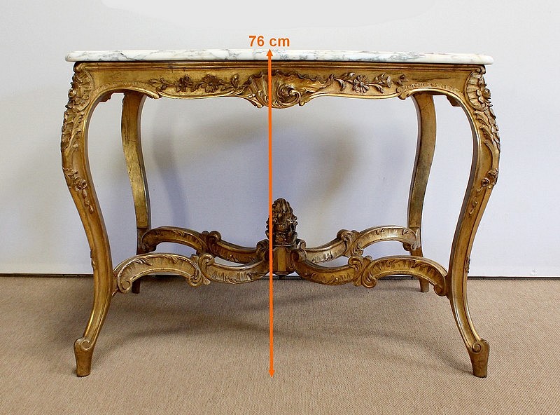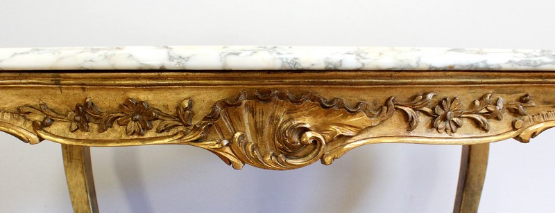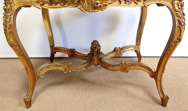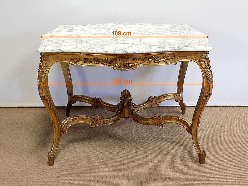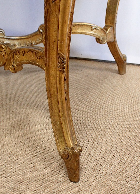 Table de milieu en bois doré composée d’un grand marbre brèche blanc lumineux et d’une ceinture sinueuse sculptée de rocailles et de fleurs délicates.