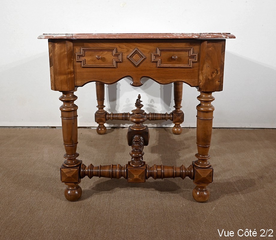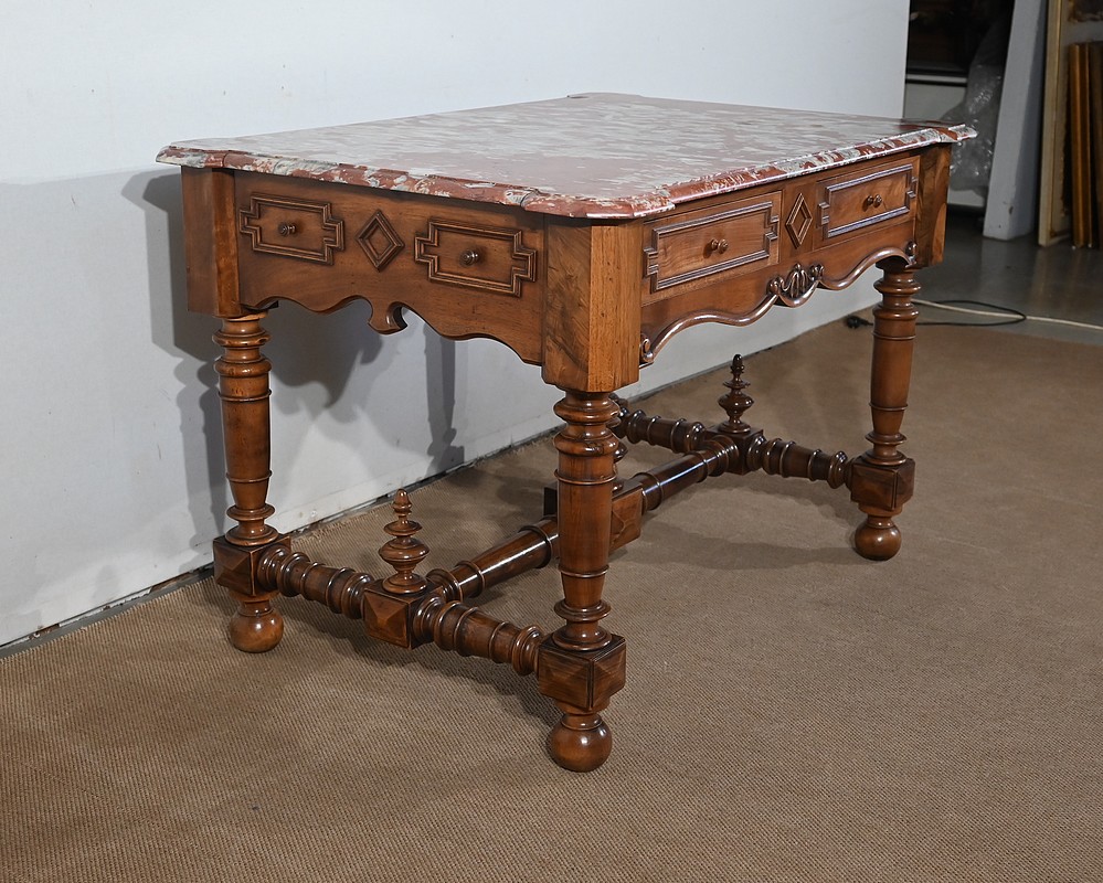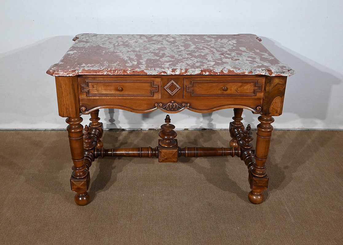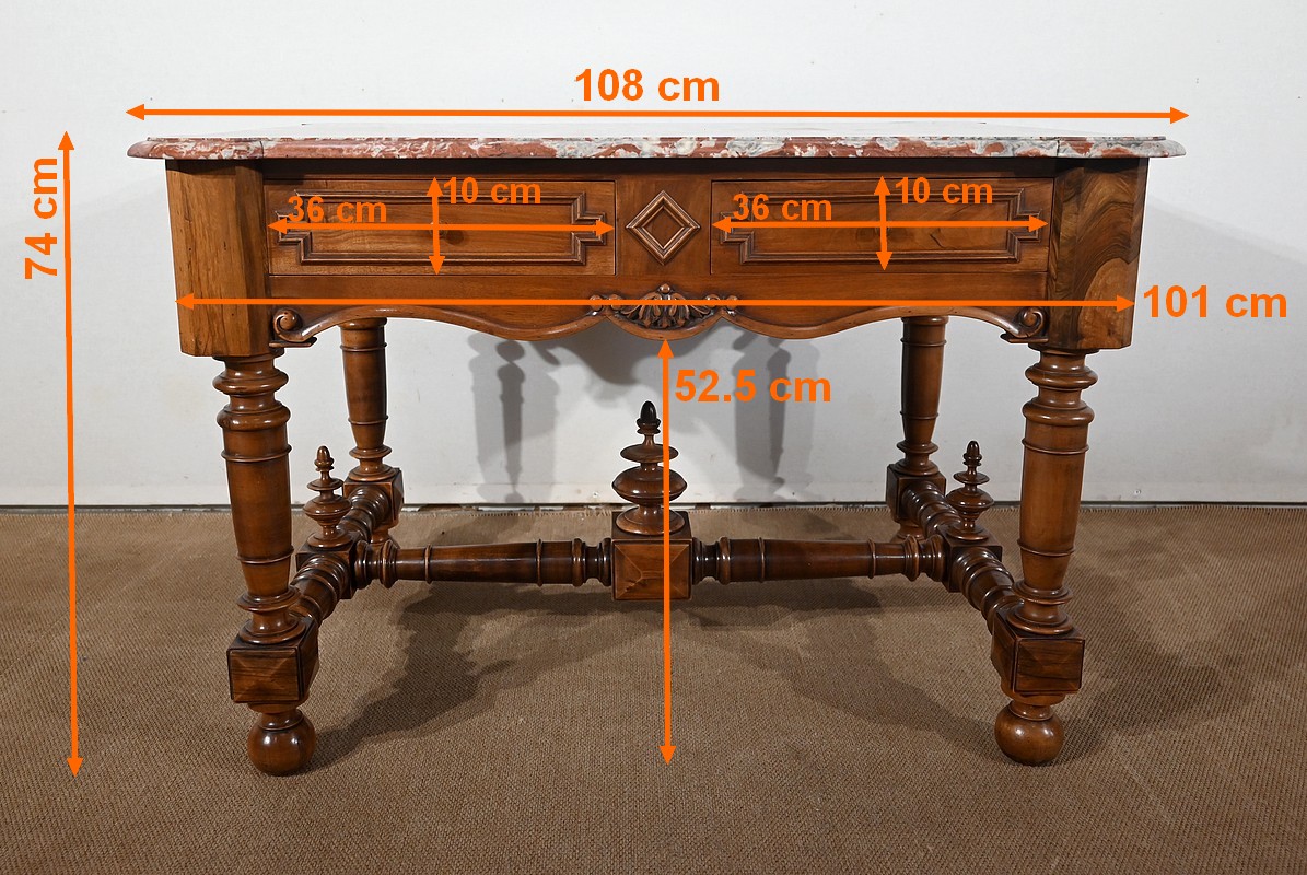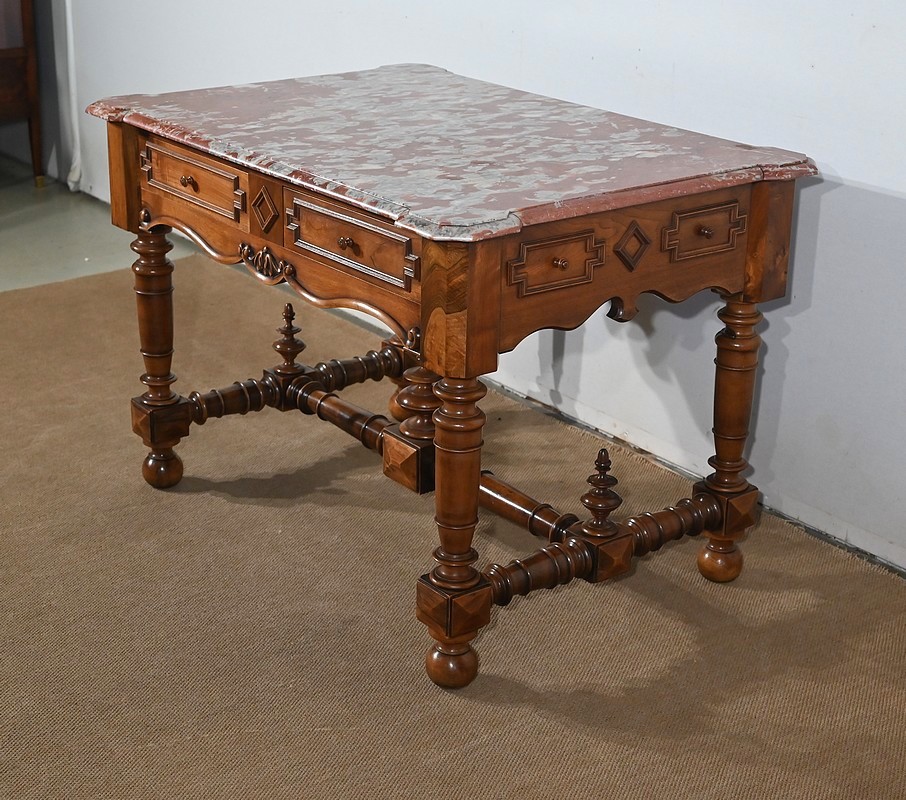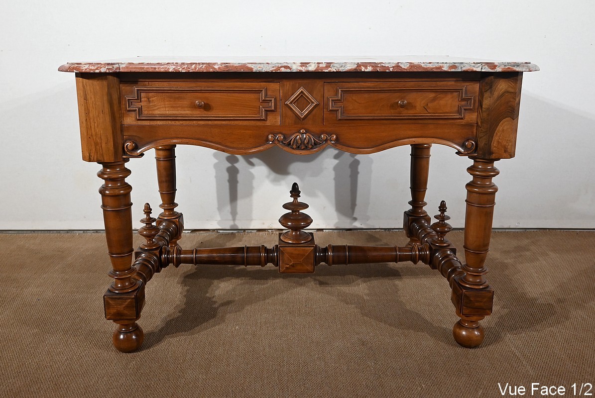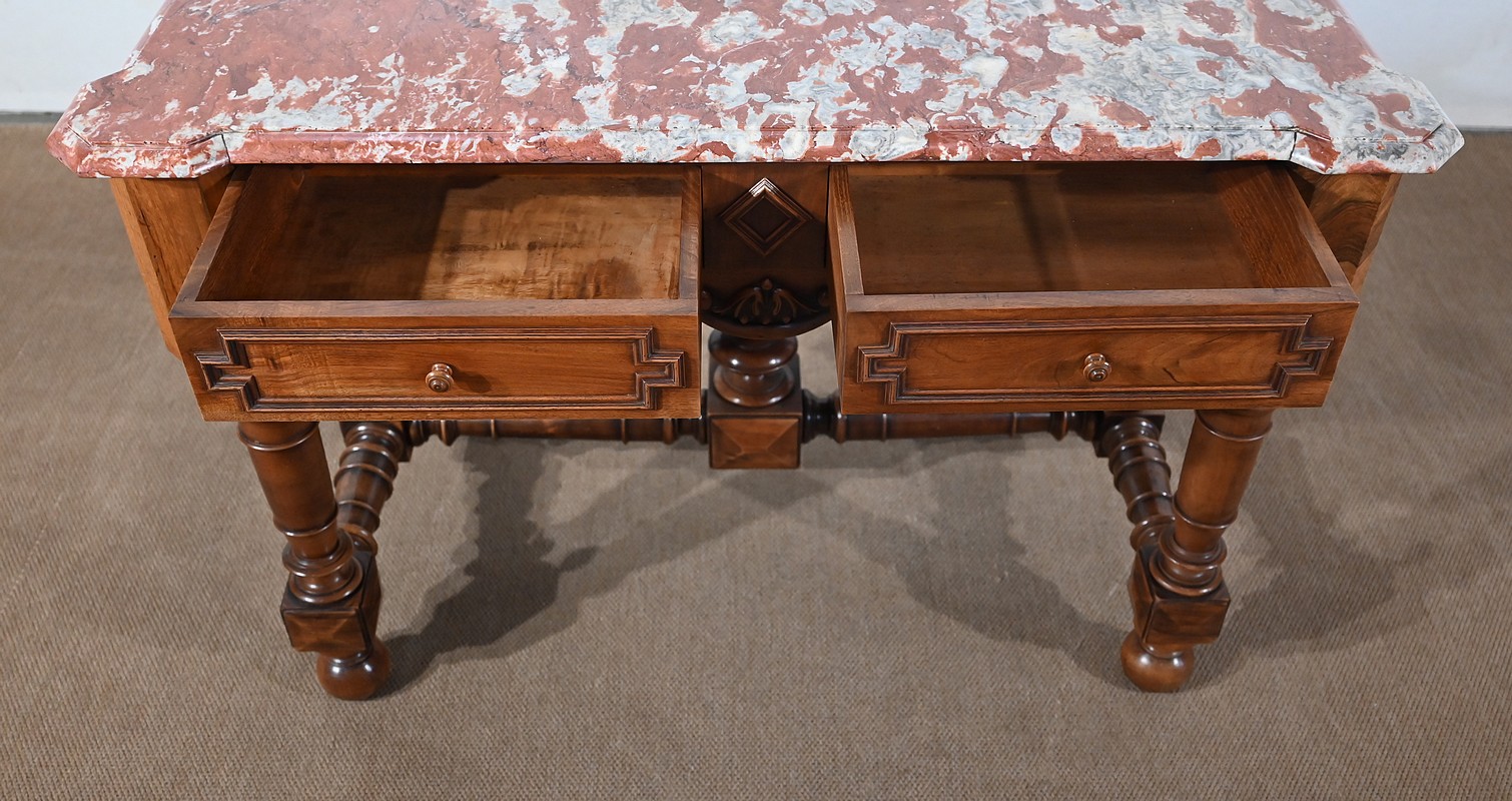 Table à Gibier en Noyer massif et Marbre Incarnat Turquin, goût Louis XIII- Début XXe