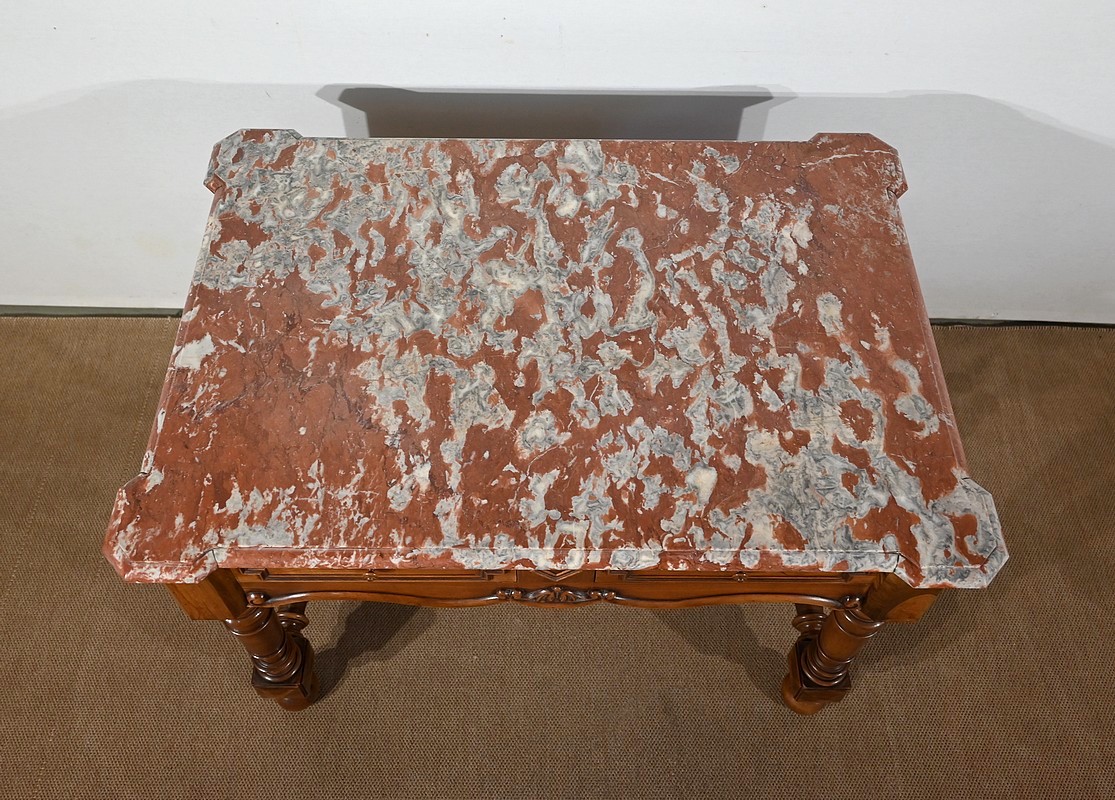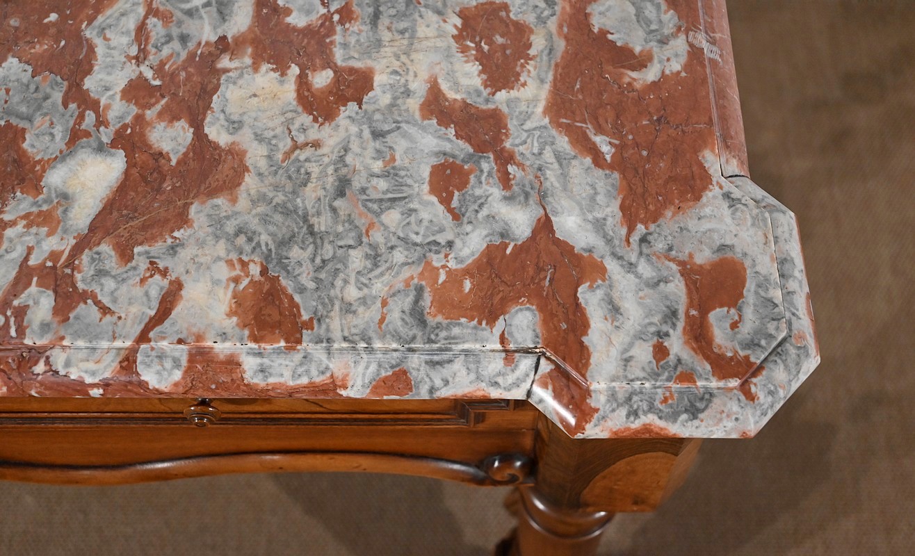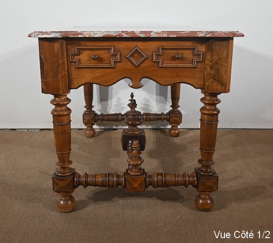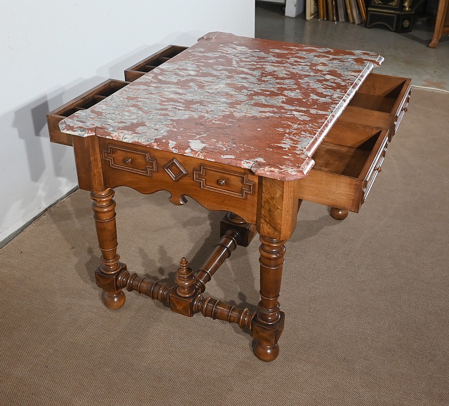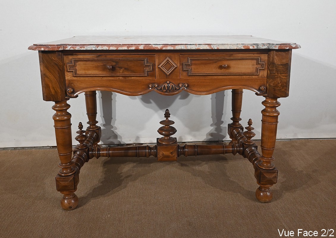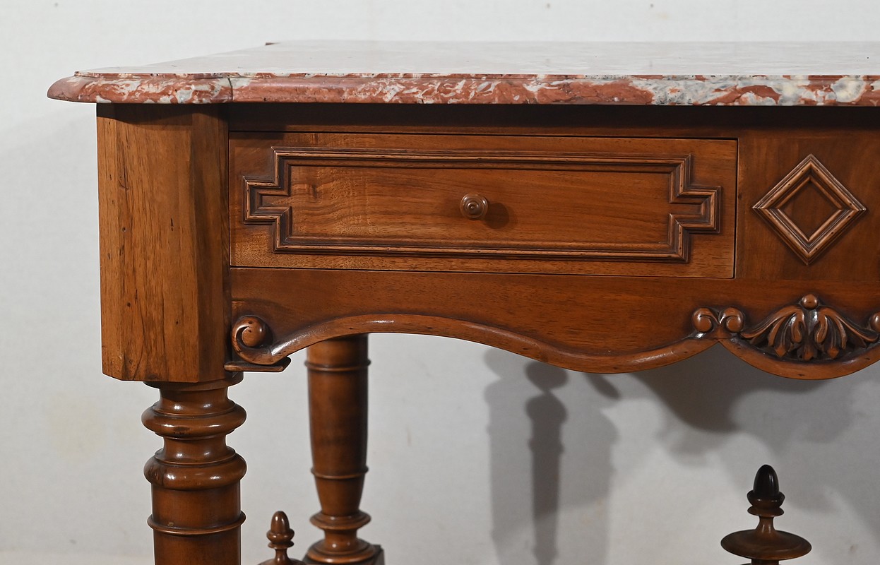 Table à Gibier en Noyer massif et Marbre Incarnat Turquin, goût Louis XIII- Début XXe