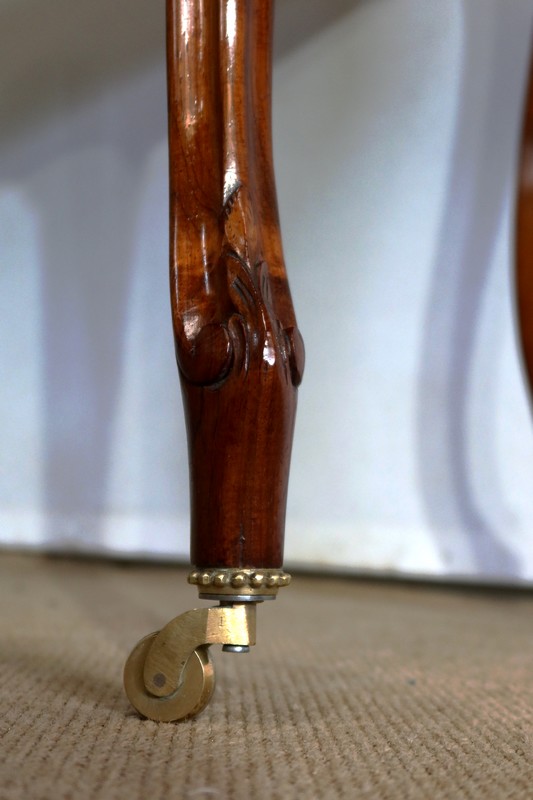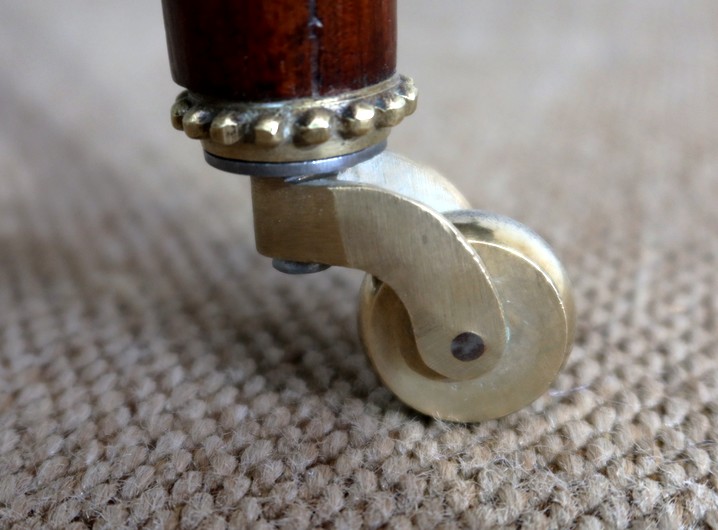 Ce meuble repose sur quatre pieds en palissandre massif, galbés, moulurés sur les deux faces d’une sculpture en feuilles d’acanthes en partie haute. Ils se terminent par un pied à volute muni de roulette en laiton.