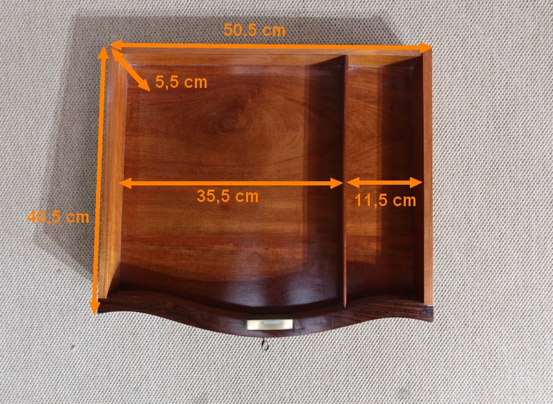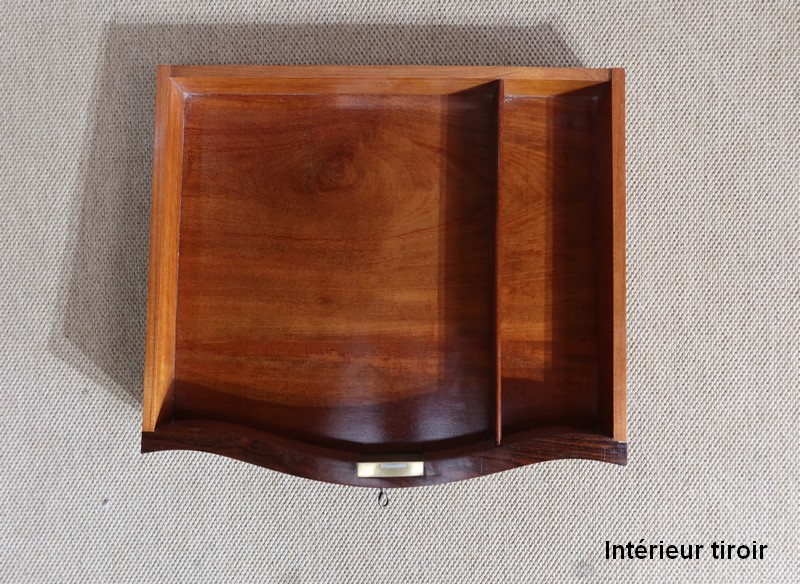 La ceinture, d’essence de bois identique, comporte les mêmes caractéristiques de placage. Elle est équipée d’un tiroir à découpe dans sa partie basse. Celui-ci s’ouvre avec une clé et se verrouille à l’aide d’une serrure d’origine en parfait état de fonctionnement. Son intérieur, ses côtés et sa séparation sont en acajou. Cet ouvrant est garni d’une butée amovible, afin de le retirer aisément.