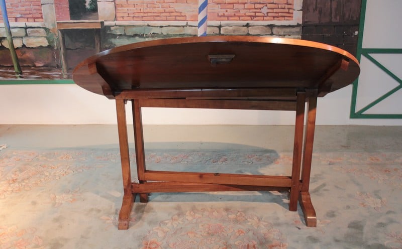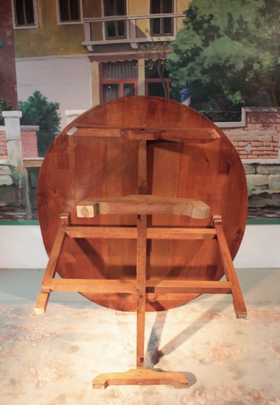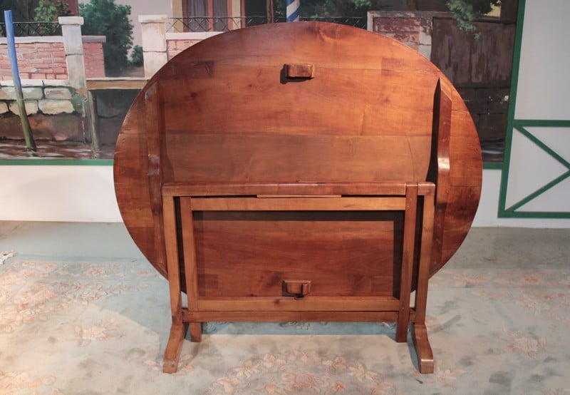 Son piètement se replie et permet au plateau de basculer afin d’être en position verticale pour faciliter son rangement.