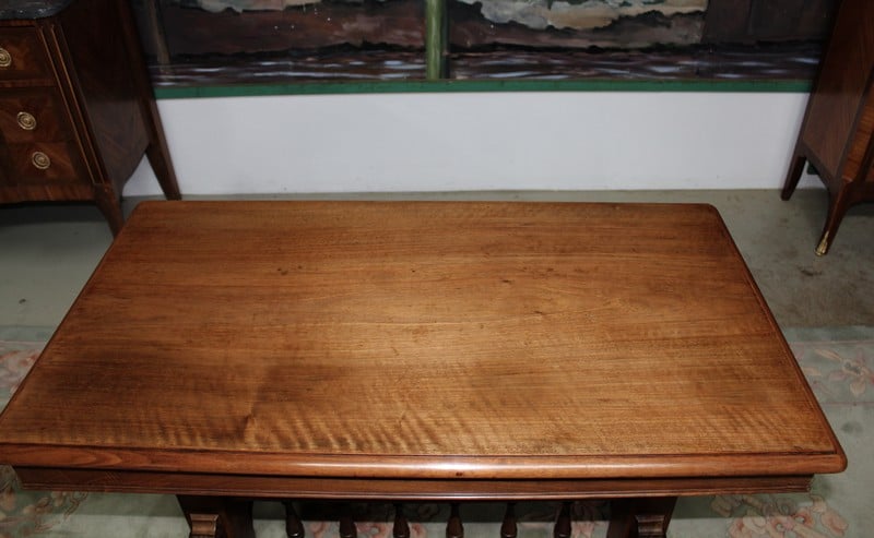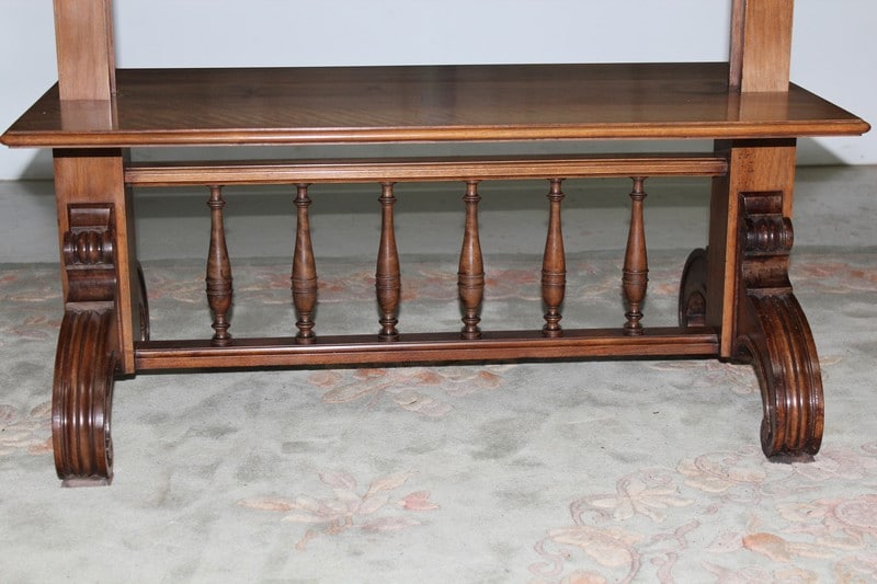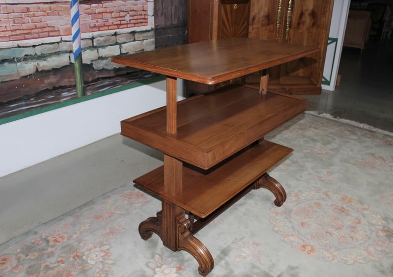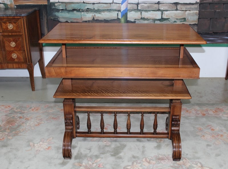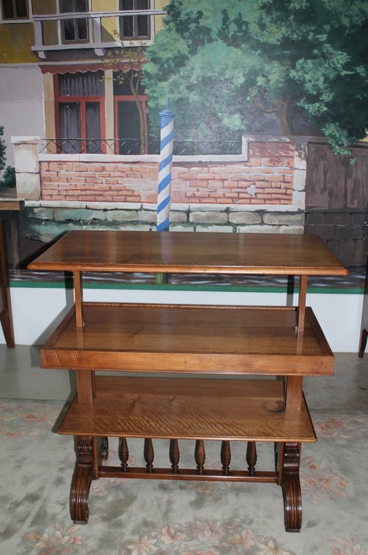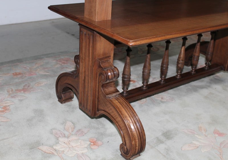 Table Desserte en noyer disposant de 3 plateaux en position déployée. Les montants cannelés en partie basse reposent par 2 consoles moulurées unies par une frise de fuseaux. Pochoir du fabricant ‘AMEUBLEMENT Aug. GODIN et Cie’ Époque 1900. Finition cirée.