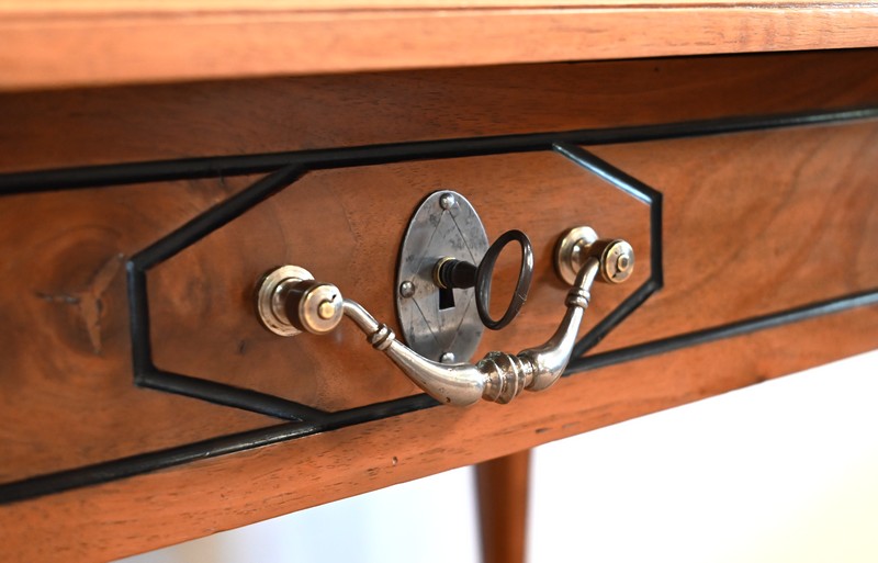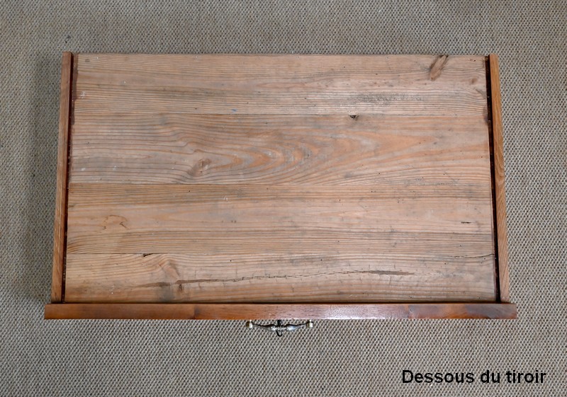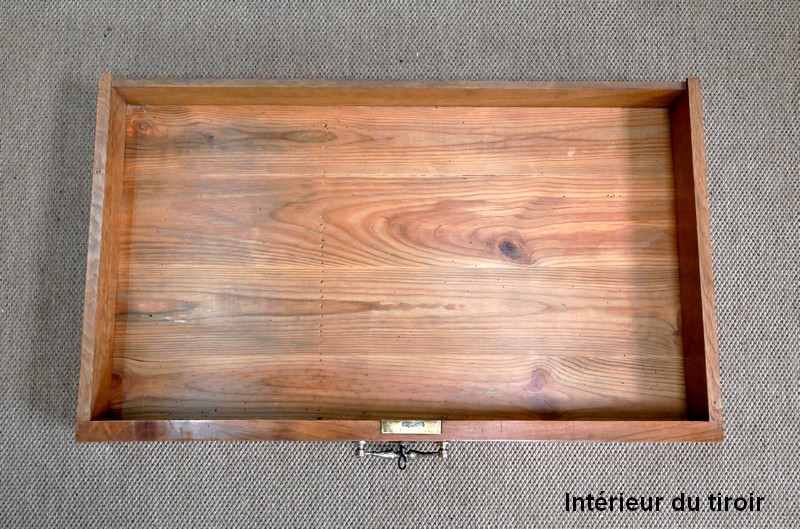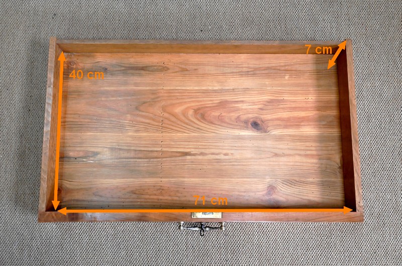 La façade comporte un tiroir habillé d’une poignée laiton et au centre une entrée avec clé qui actionne une serrure en parfait état de fonctionnement. Tous ces éléments sont d’origine.