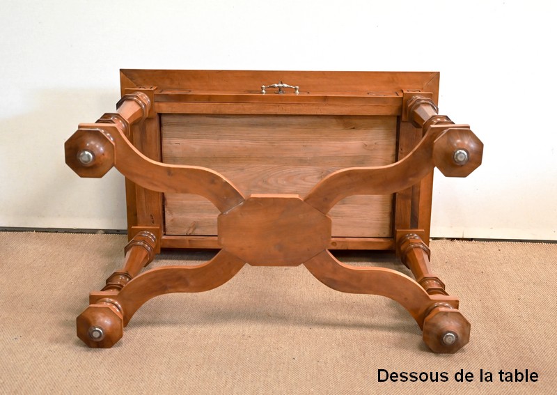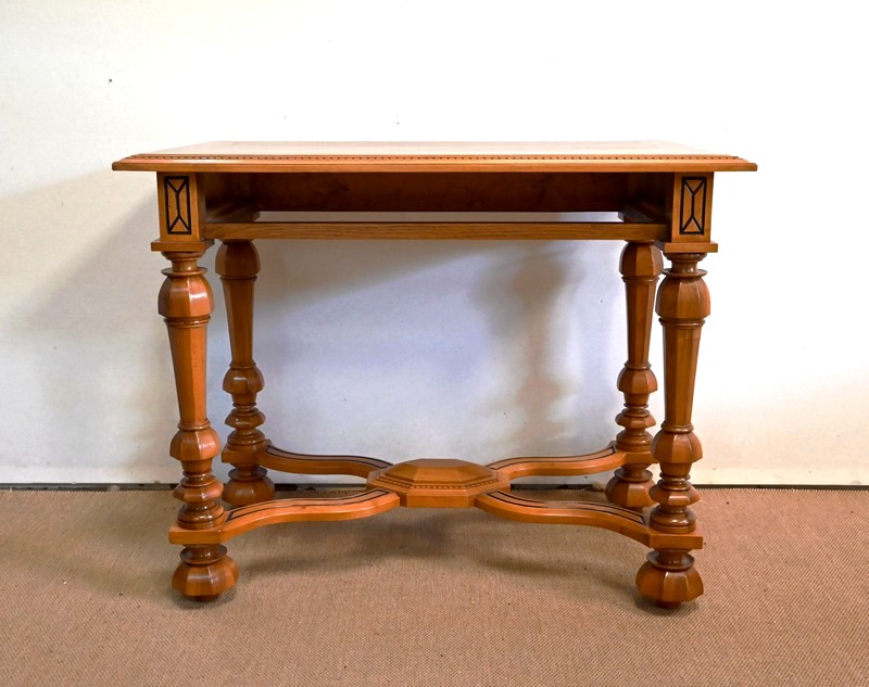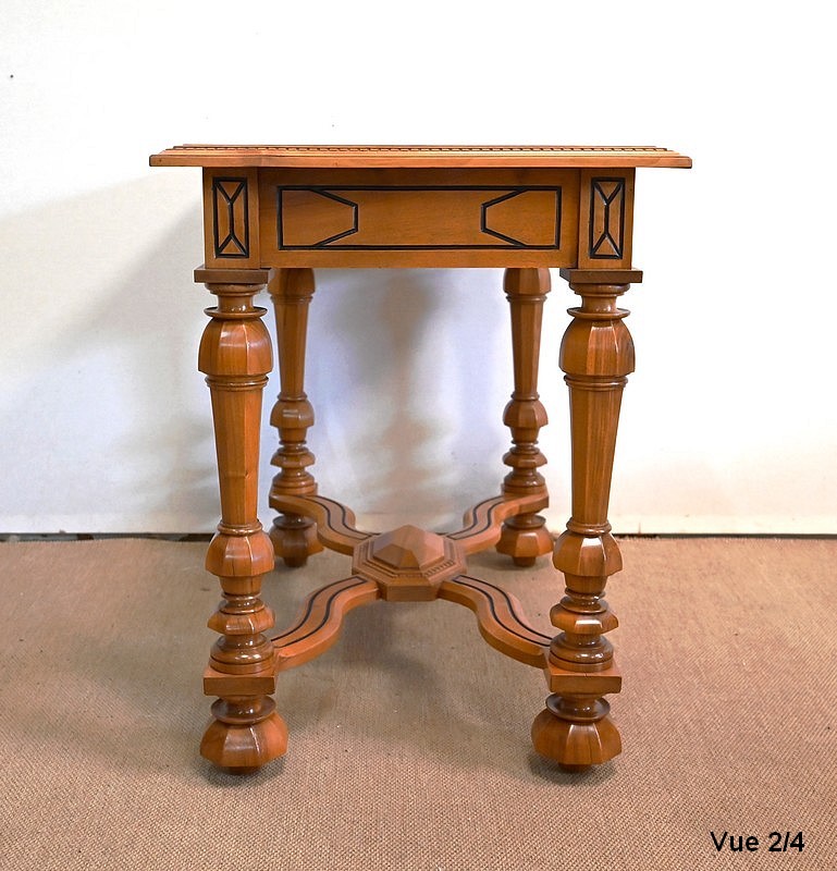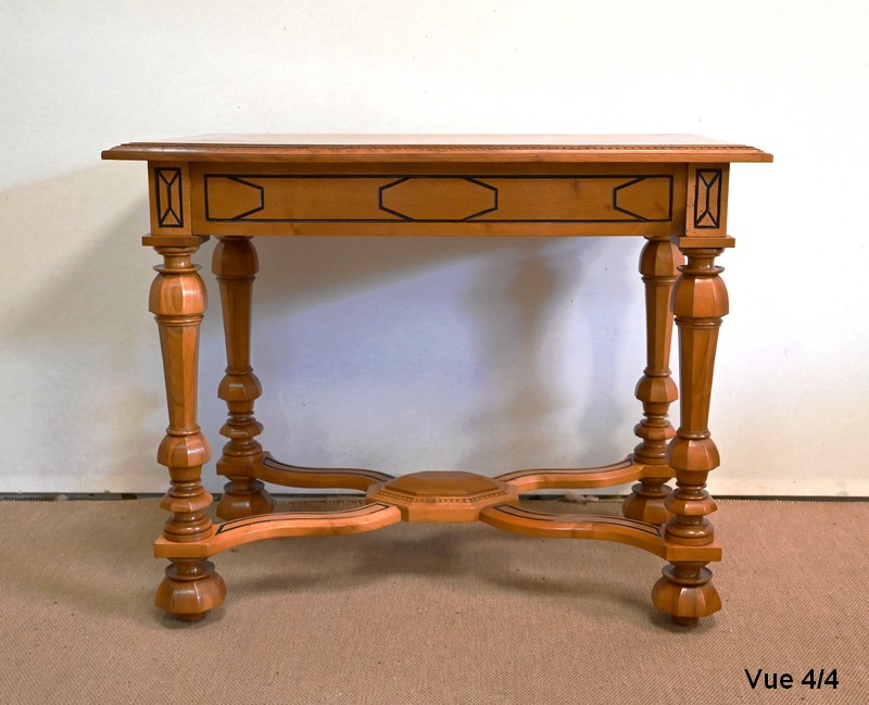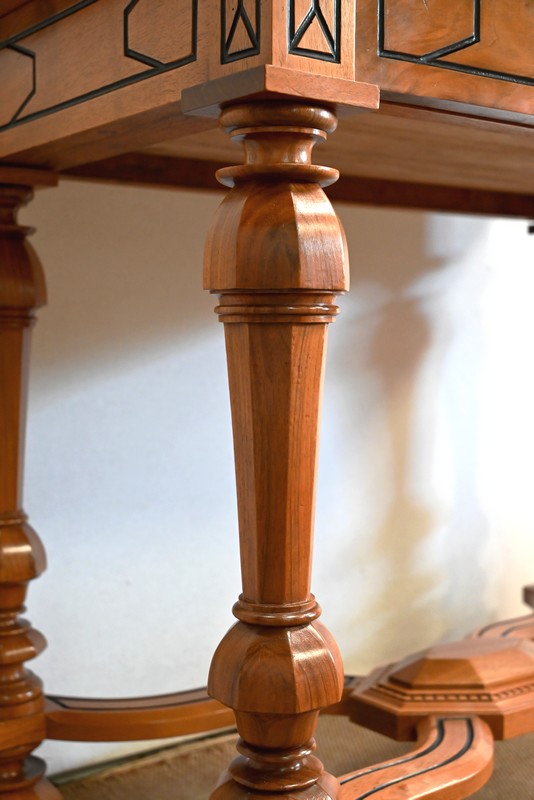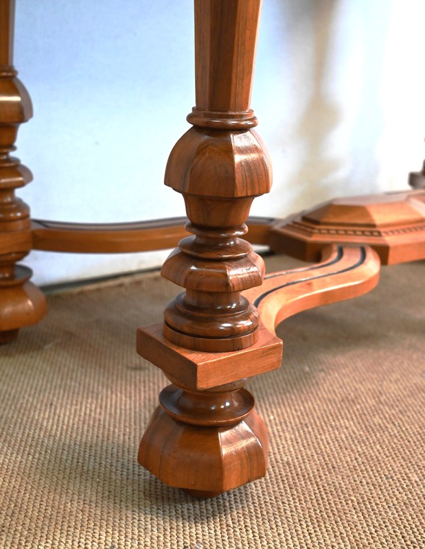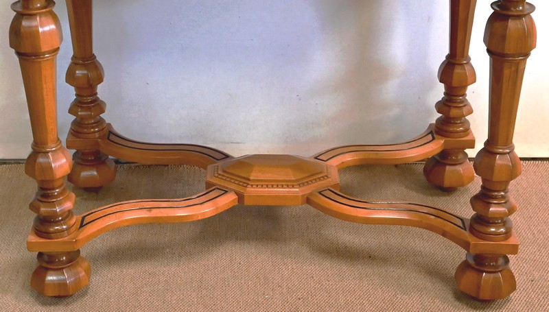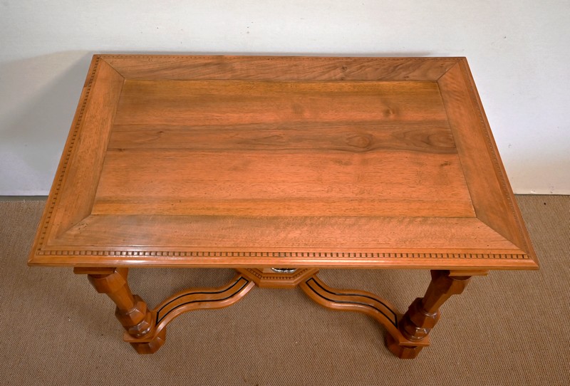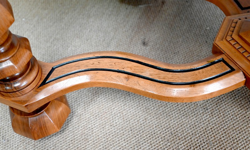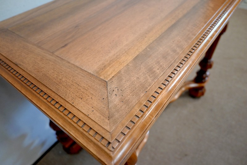 Cette table en noyer massif offre un dessus à encadrement à coupe d’onglet composé d’une seule planche en son centre. Son pourtour est mouluré et sculpté de petits motifs.