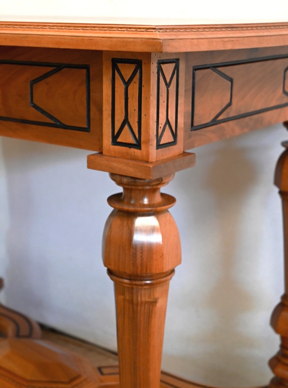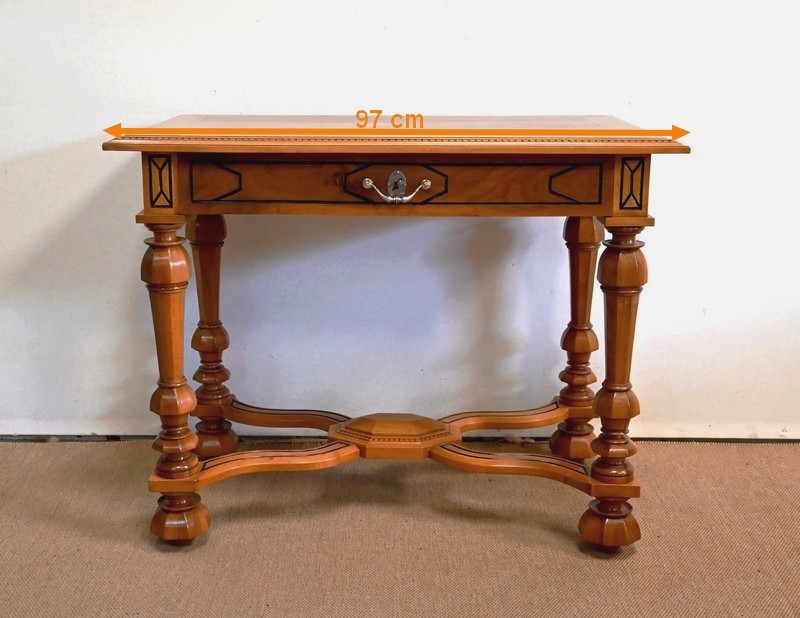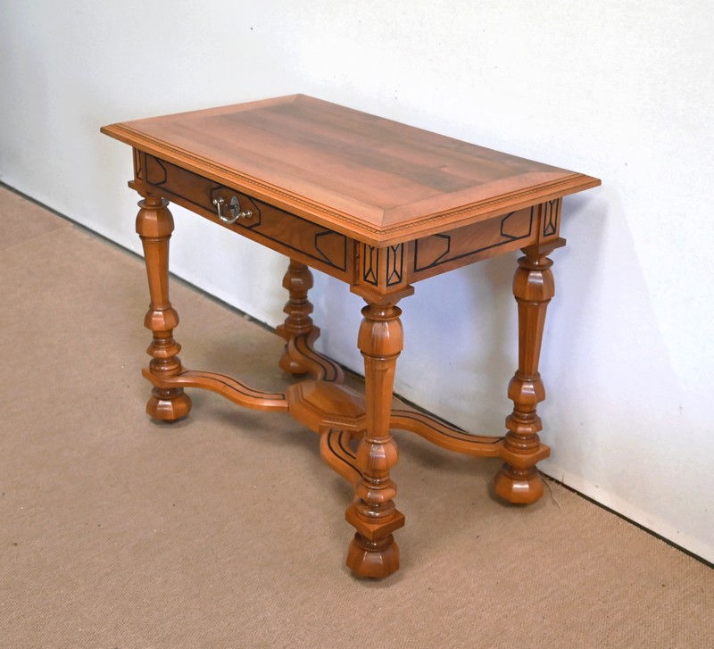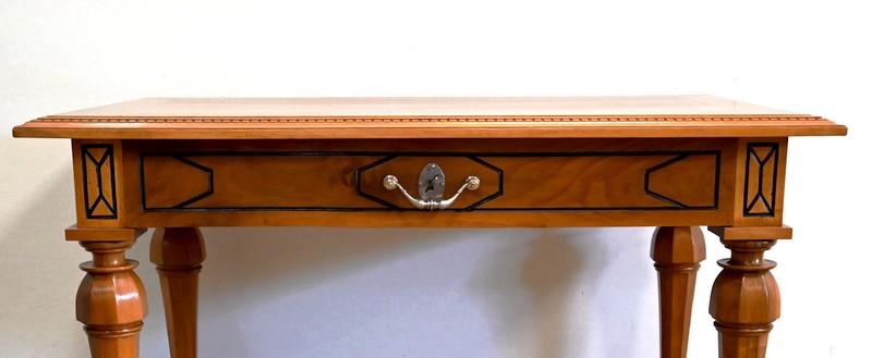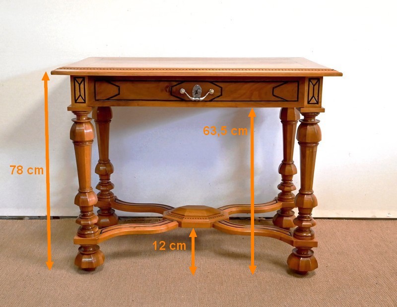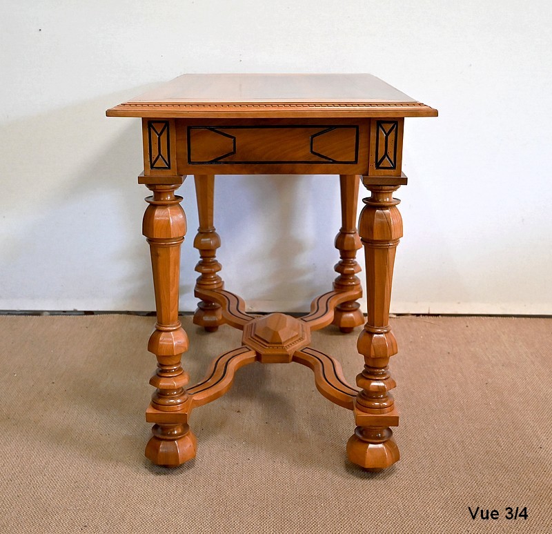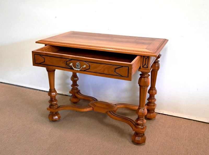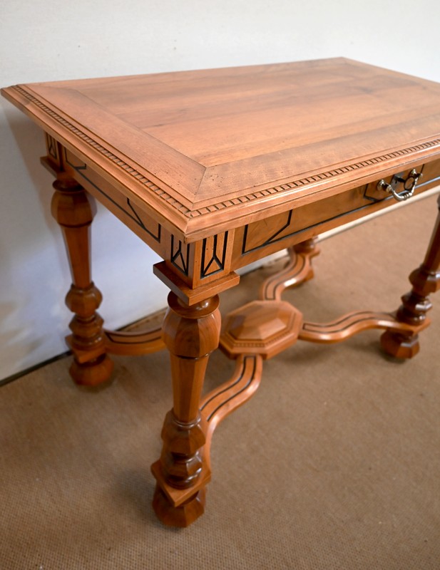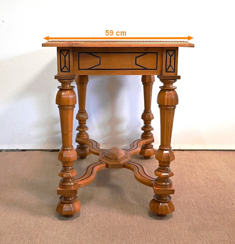 Cette table en noyer massif offre un dessus à encadrement à coupe d’onglet composé d’une seule planche en son centre. Son pourtour est mouluré et sculpté de petits motifs.