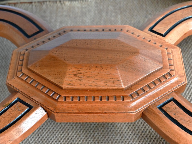 En partie basse, une entretoise en découpe relie ce piétement. Celle-ci est ornée en son centre d’un élément rappelant les moulurations et les pans coupés évoqués précédemment.