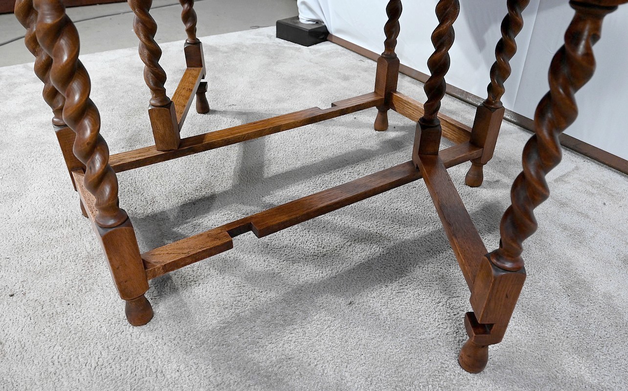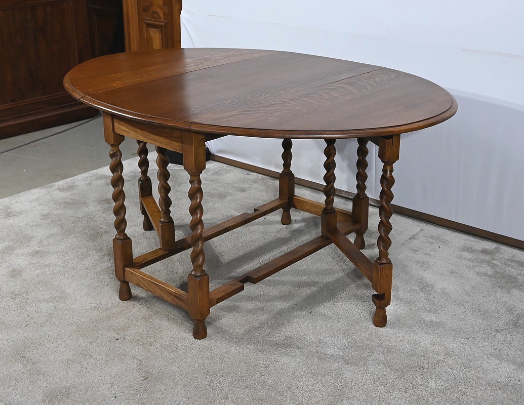 Cette table ovale et fonctionnelle est composée d’un ensemble de pieds torses reliés par des traverses. Une structure rectangulaire constitue le piétement fixe de quatre pieds. S’ajoute des pieds mobiles qui pivotent pour maintenir ouverts et supporter les abattants qui agrandissent la taille de cette table. Son point fort ? Sa fonctionnalité : Table Console, Table demi-lune ou Table de salon pouvant accueillir six personnes, ce meuble est indispensable pour un espace réduit.