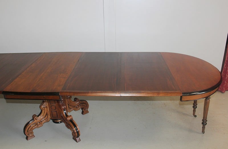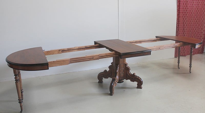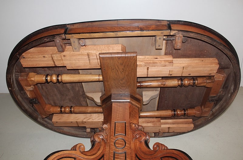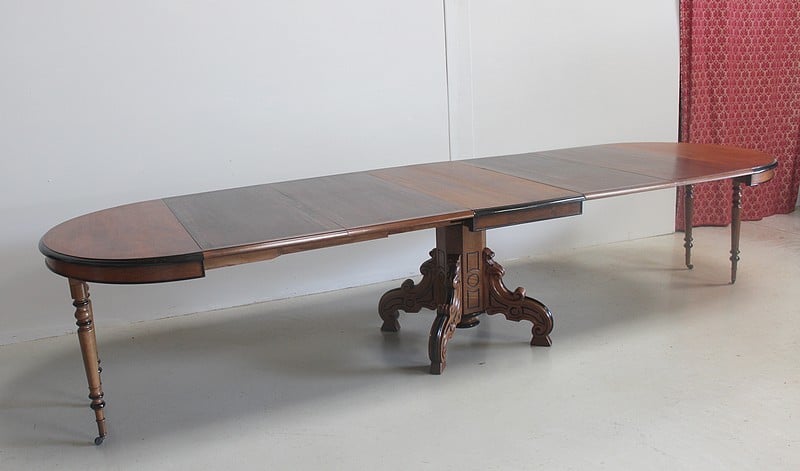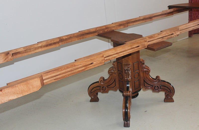 Elle possède 4 allonges supplémentaires en bois secondaire d’environ 50cm, lui permettant d’atteindre une longueur totale de 358cm pour un chemin de table de 115cm, soit pour 16 personnes.