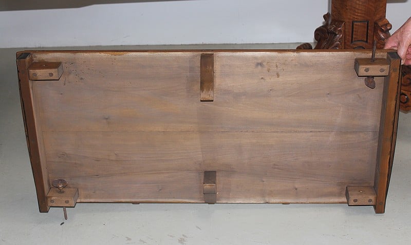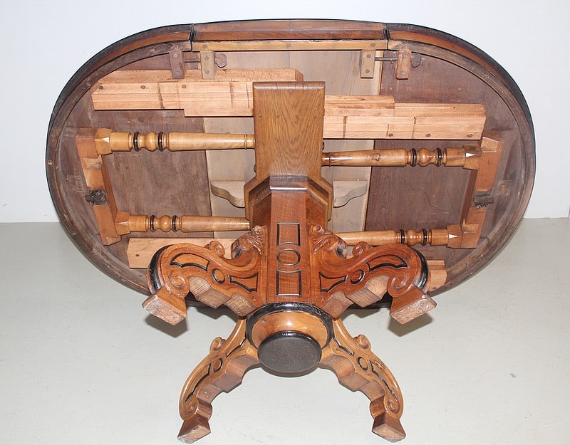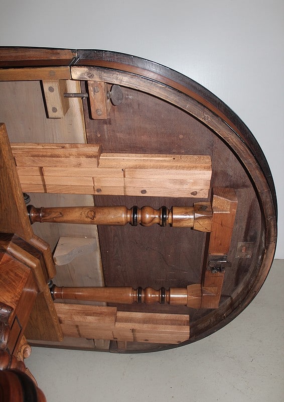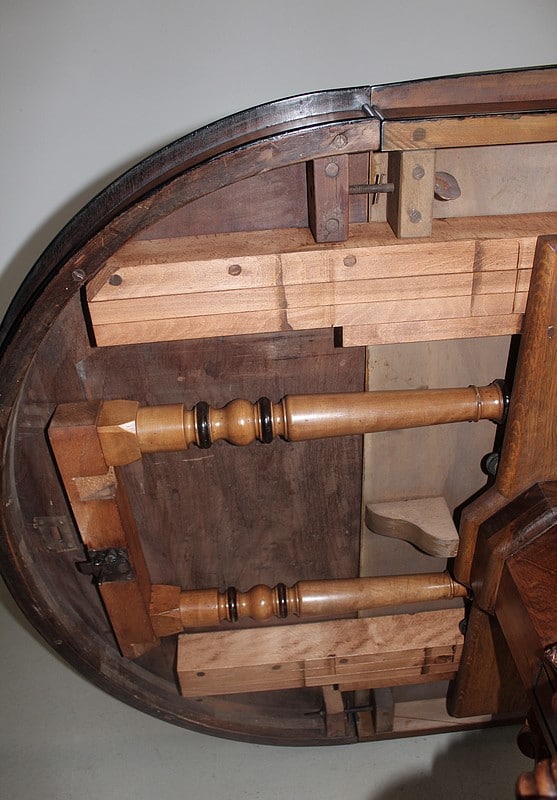 Le plateau est soutenu, dans ce cas, par une paire de pieds tournés rétractables à chaque extrémité.