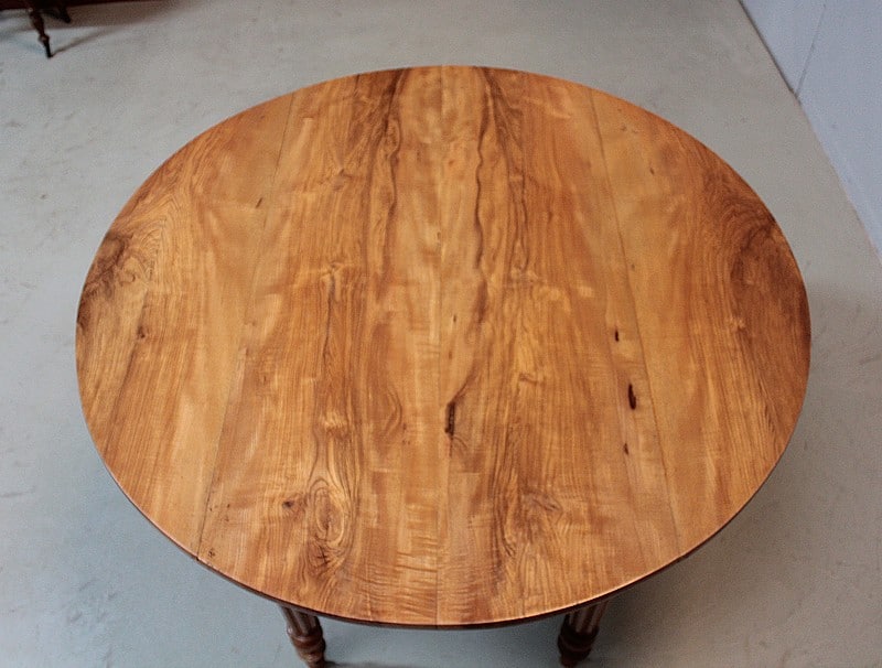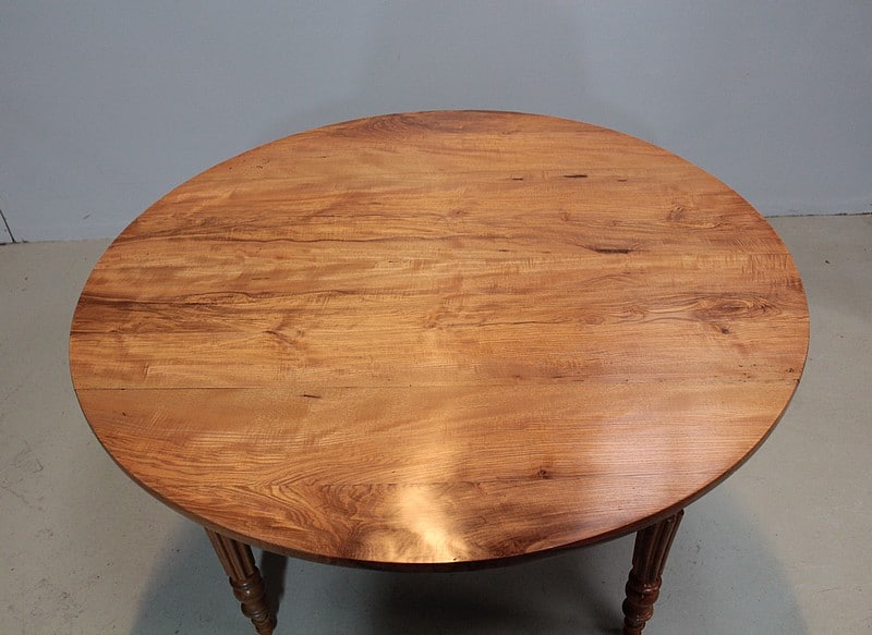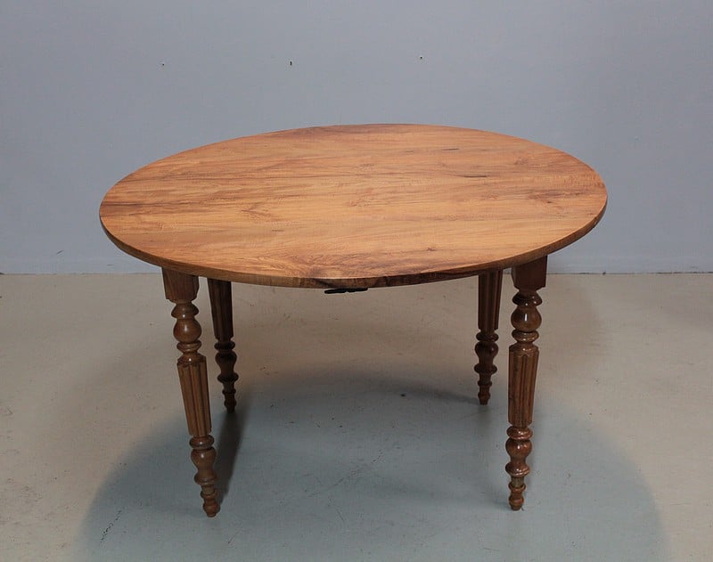 Table Louis-Philippe en frêne très blond mesurant 118cm X 114cm et reposant sur 4 pieds tournés.