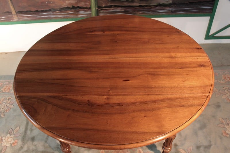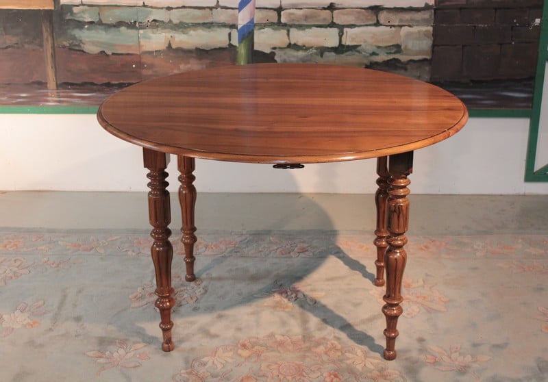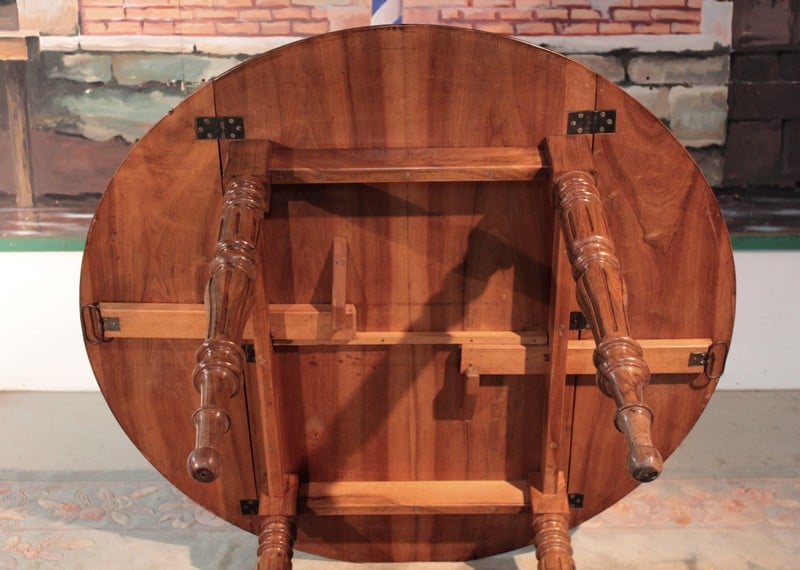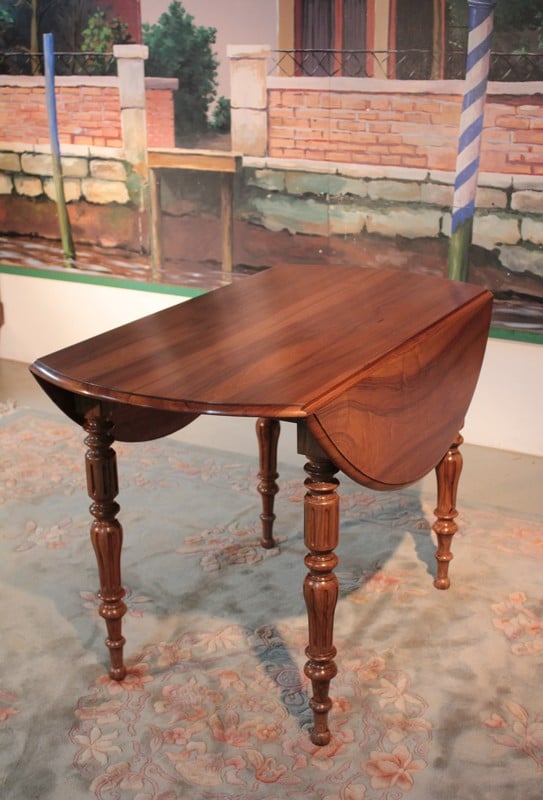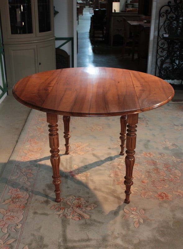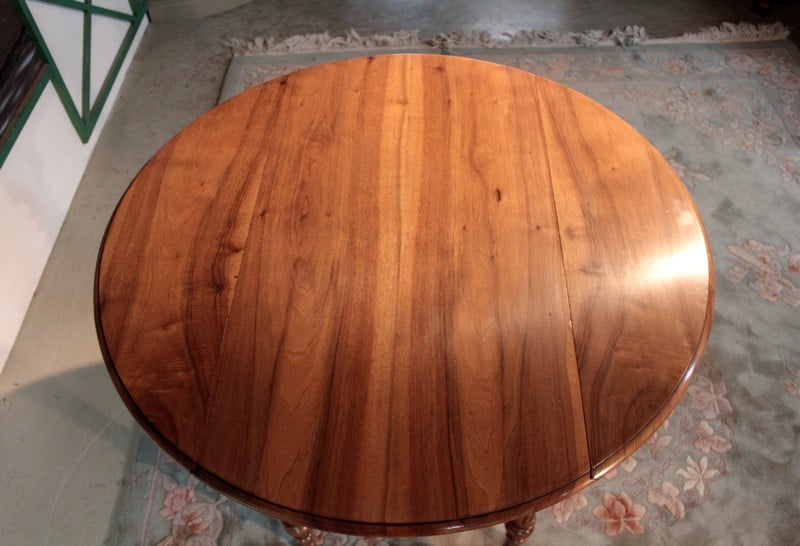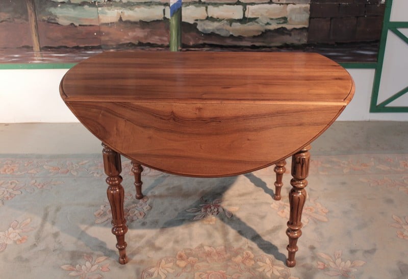 Petite table Louis-Philippe à abattants en noyer. Son plateau est composé de 4 planches et elle repose sur 4 pieds tournés. Lorsque ses abattants sont repliés, elle peut être placée contre un mur, sa profondeur est alors de 60cm. Seconde moitié du XIXe