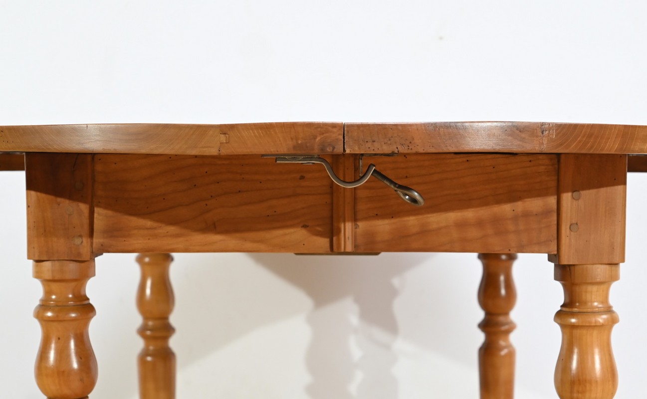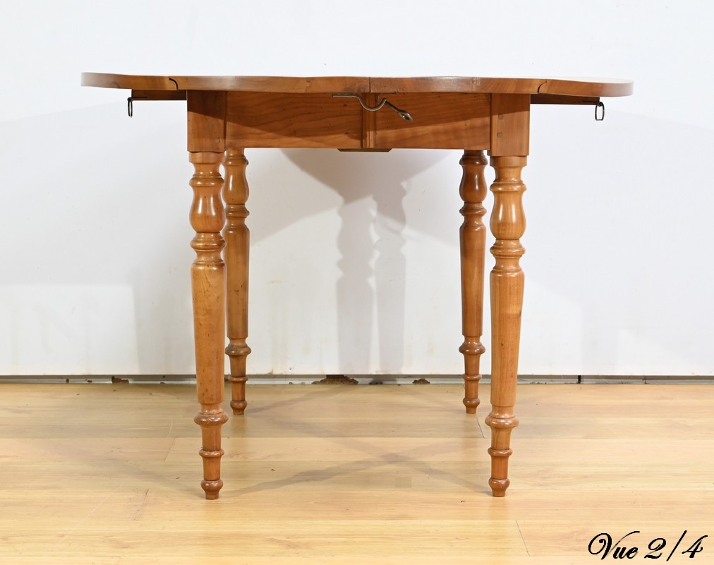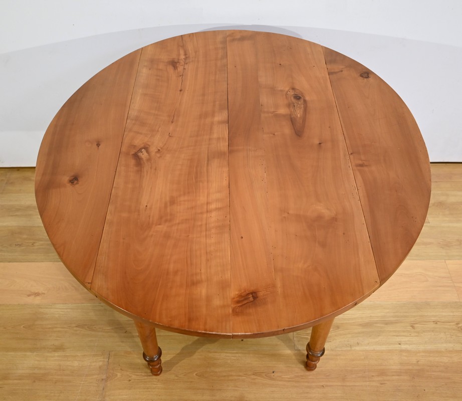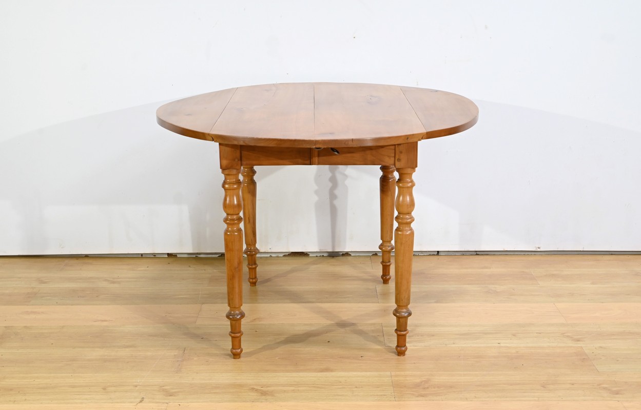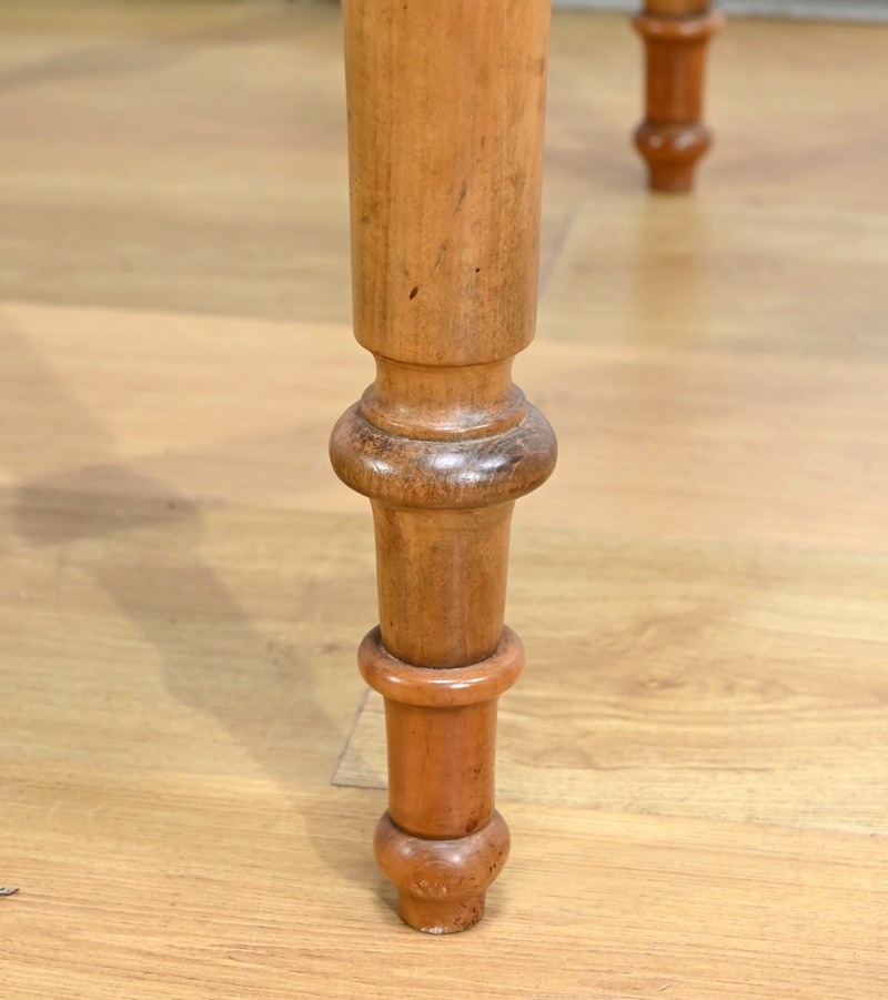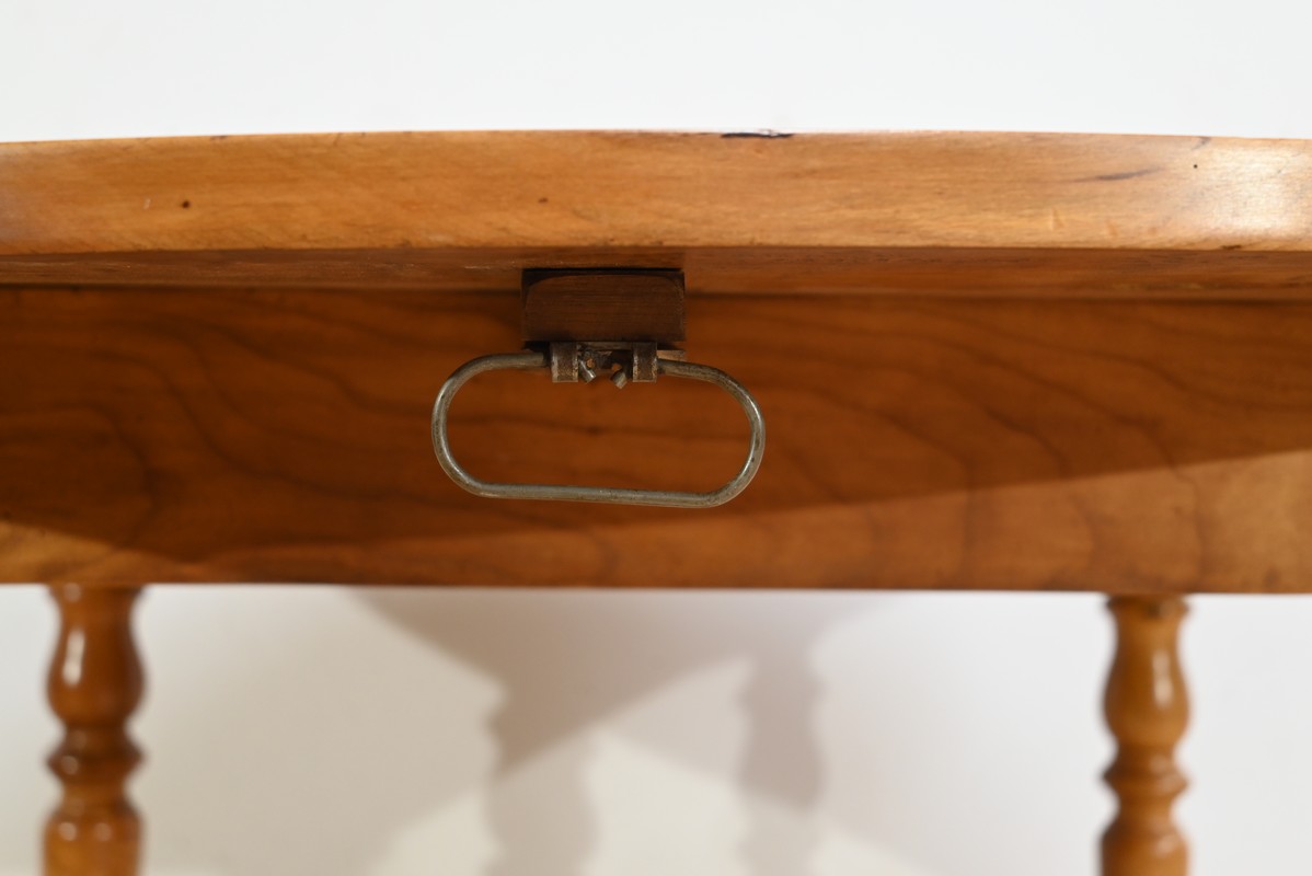 Cette table légèrement ovale repose sur quatre pieds tournés à étranglement