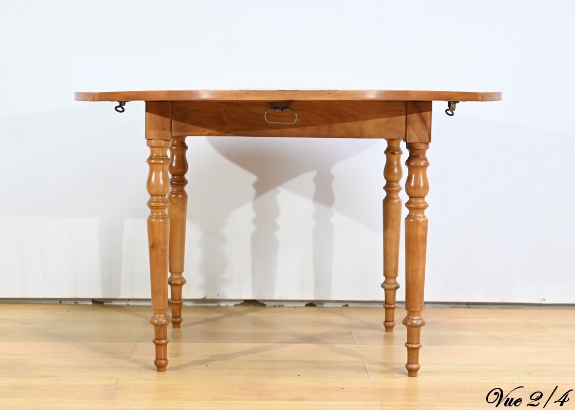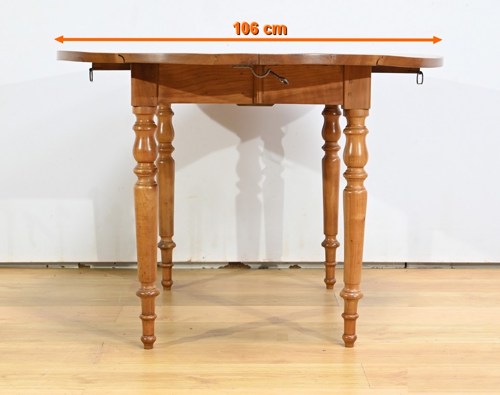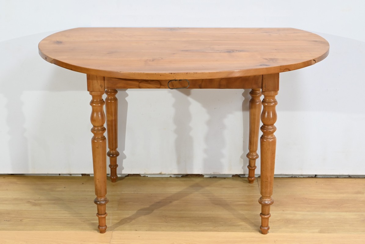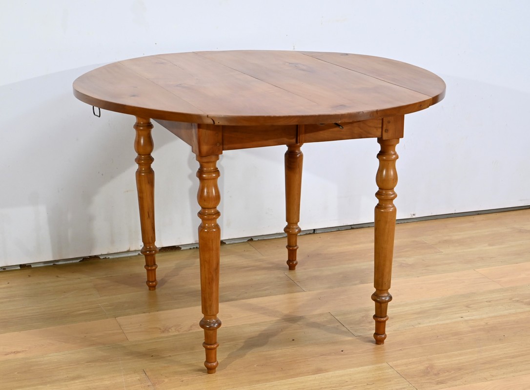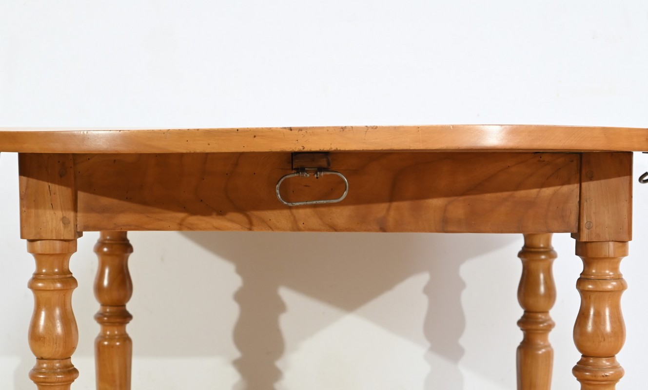 Cette table légèrement ovale repose sur quatre pieds tournés à étranglement