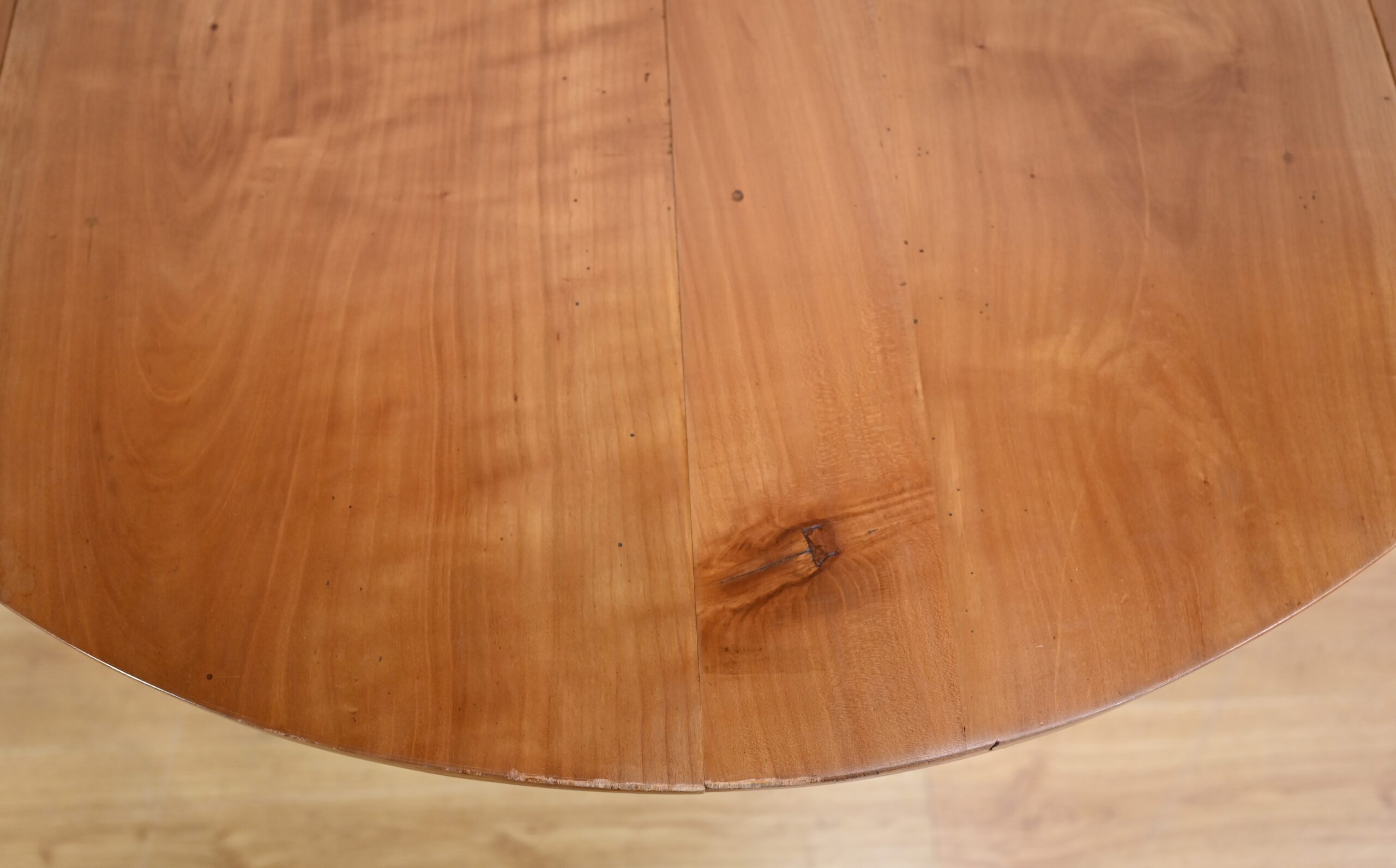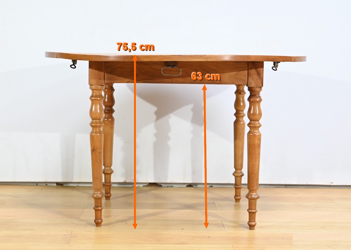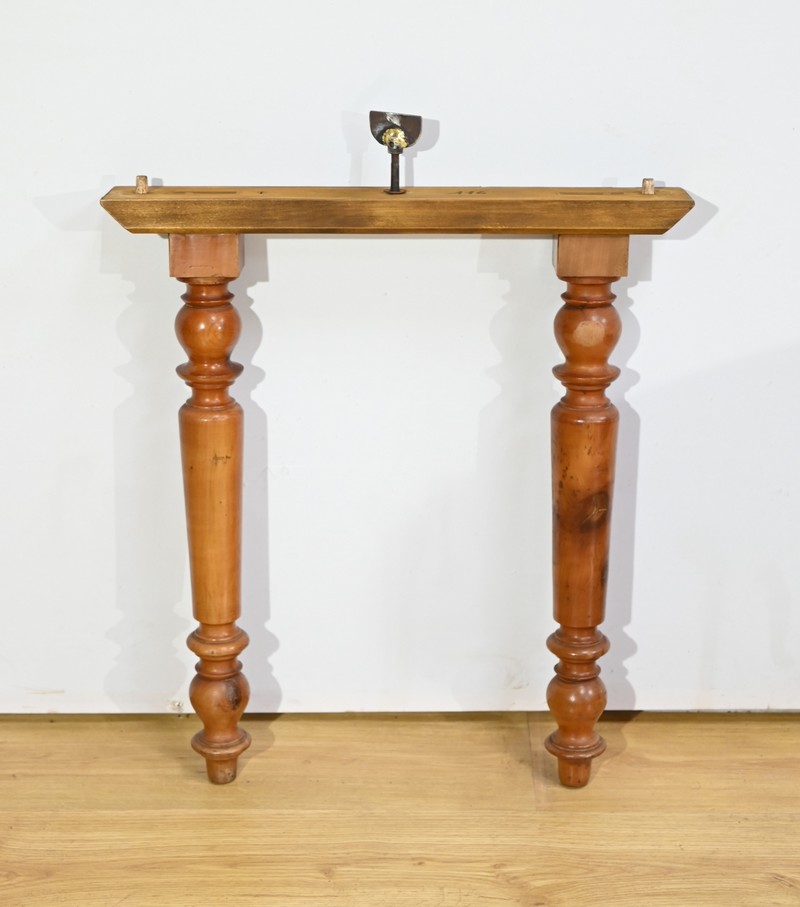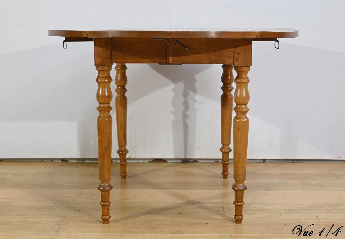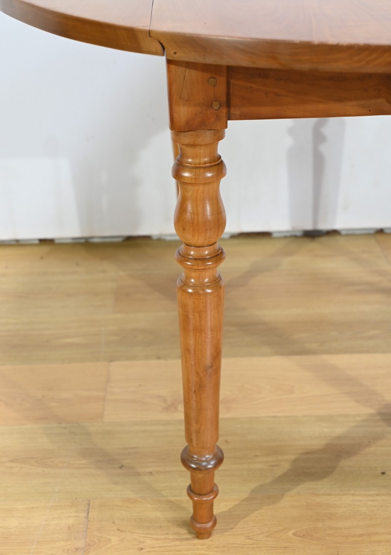 Cette table légèrement ovale repose sur quatre pieds tournés à étranglement