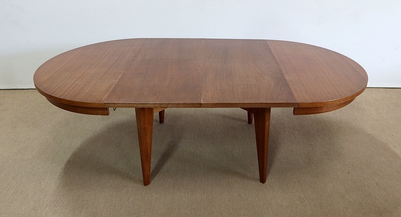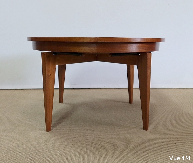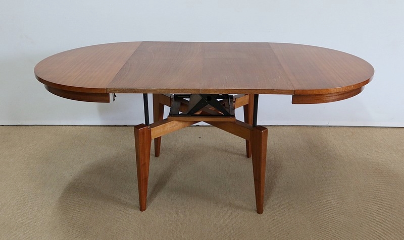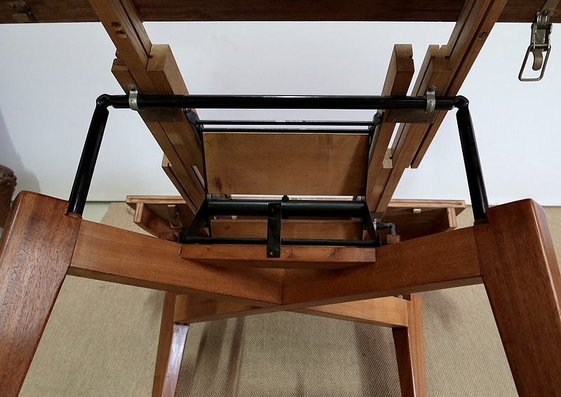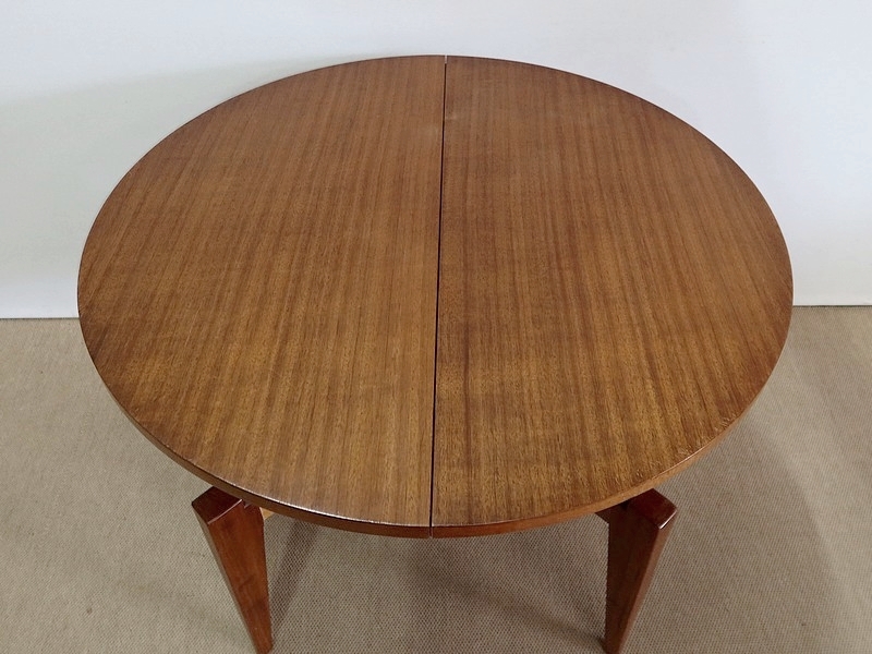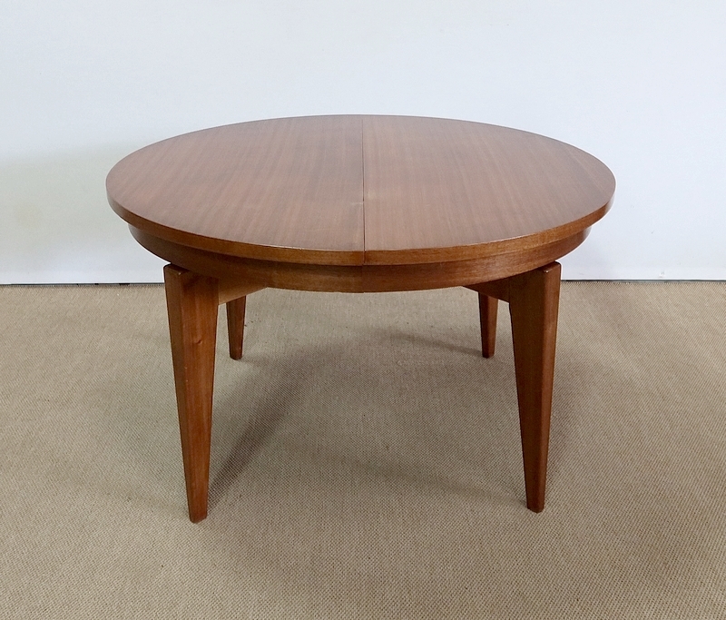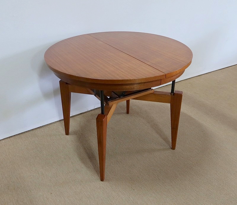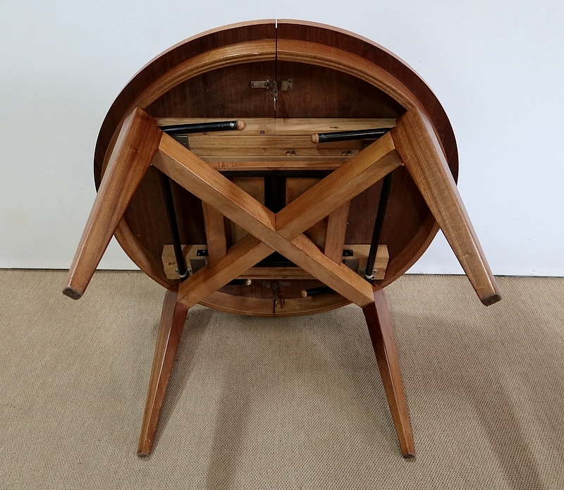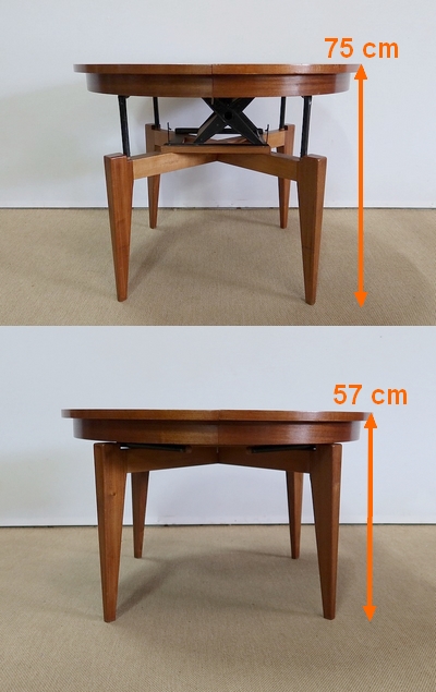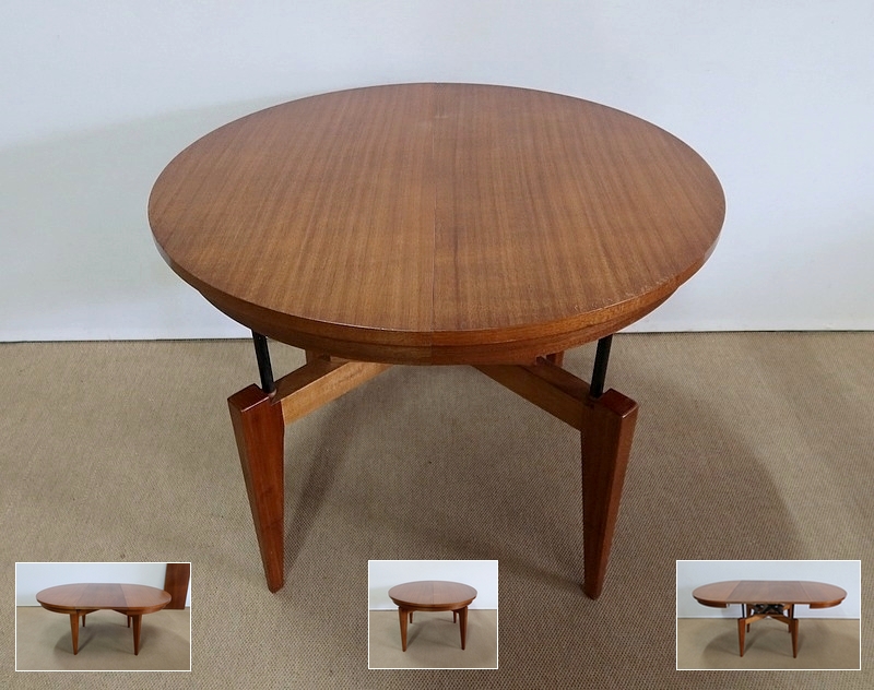 Cette table ronde en acajou massif et placage d’acajou comporte par son système trois possibilités.