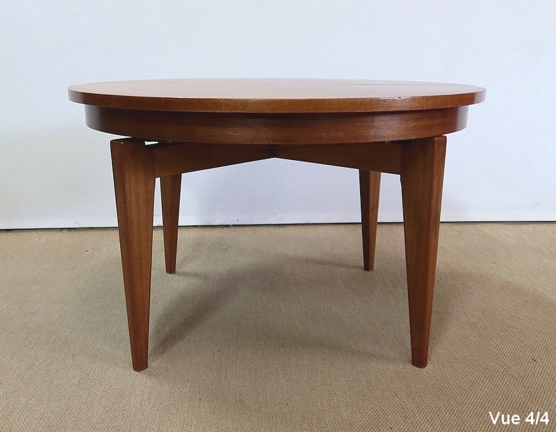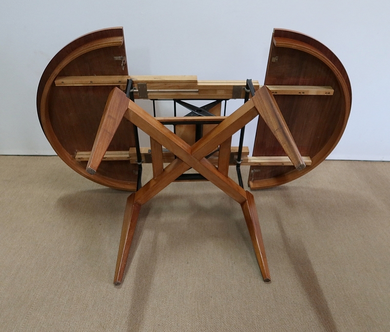Son dessus circulaire possède une fine ceinture. Son piétement est composé de quatre pieds gainés en acajou massif, reliés par une croix de saint André.