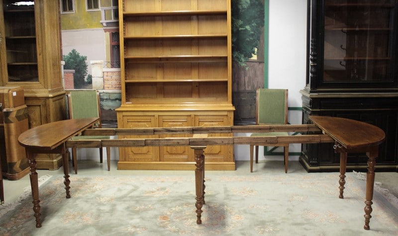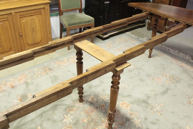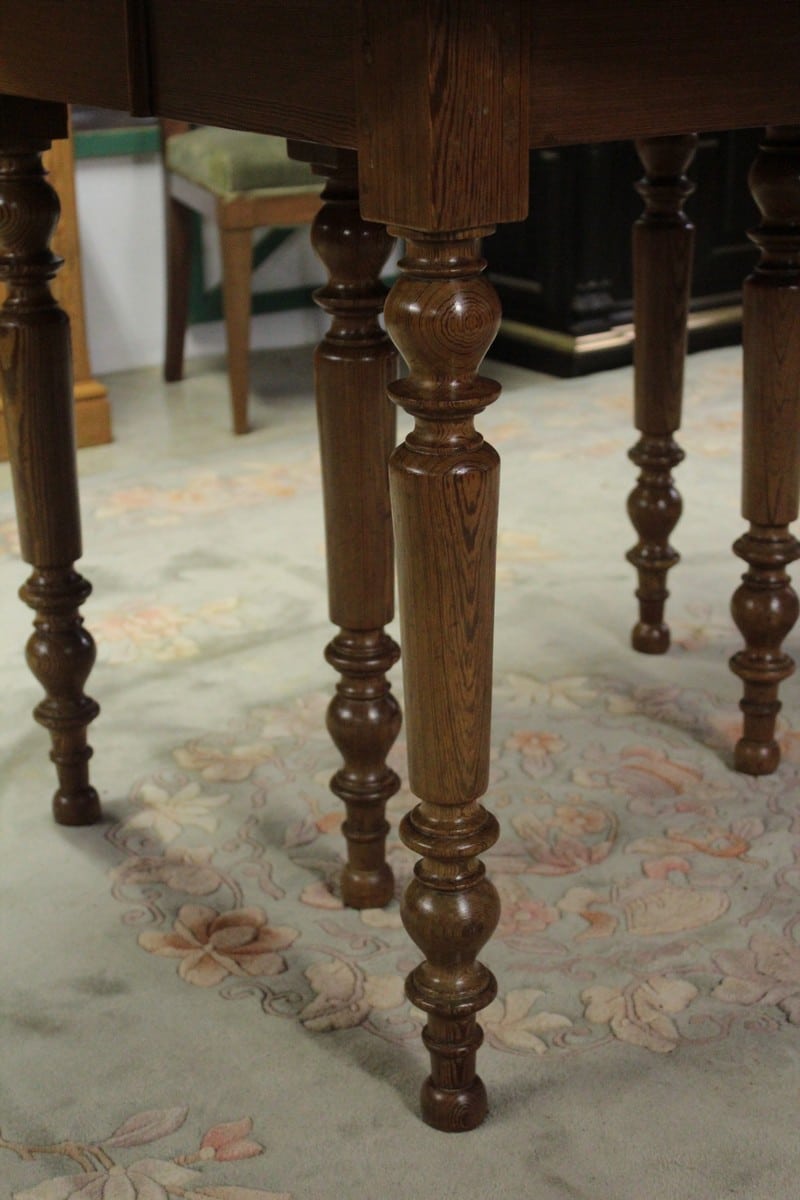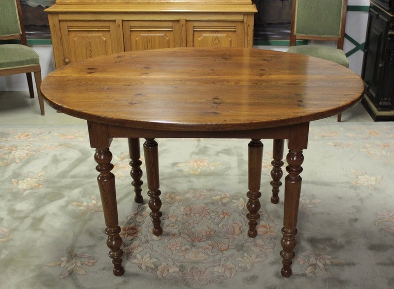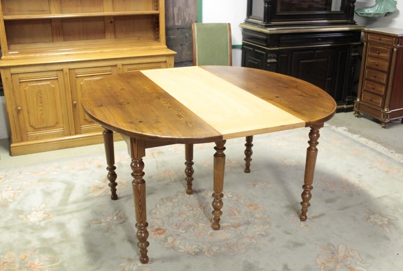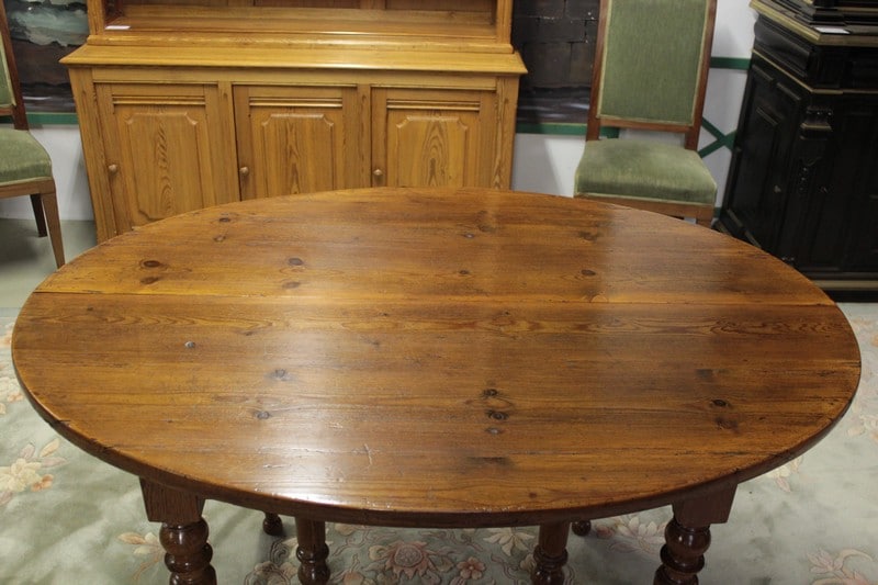 Table ovale en pitchpin reposant sur 6 pieds tournés et disposant de 4 allonges de 42 cm lui permettant d’atteindre une dimension totale de 260cm X 127cm.