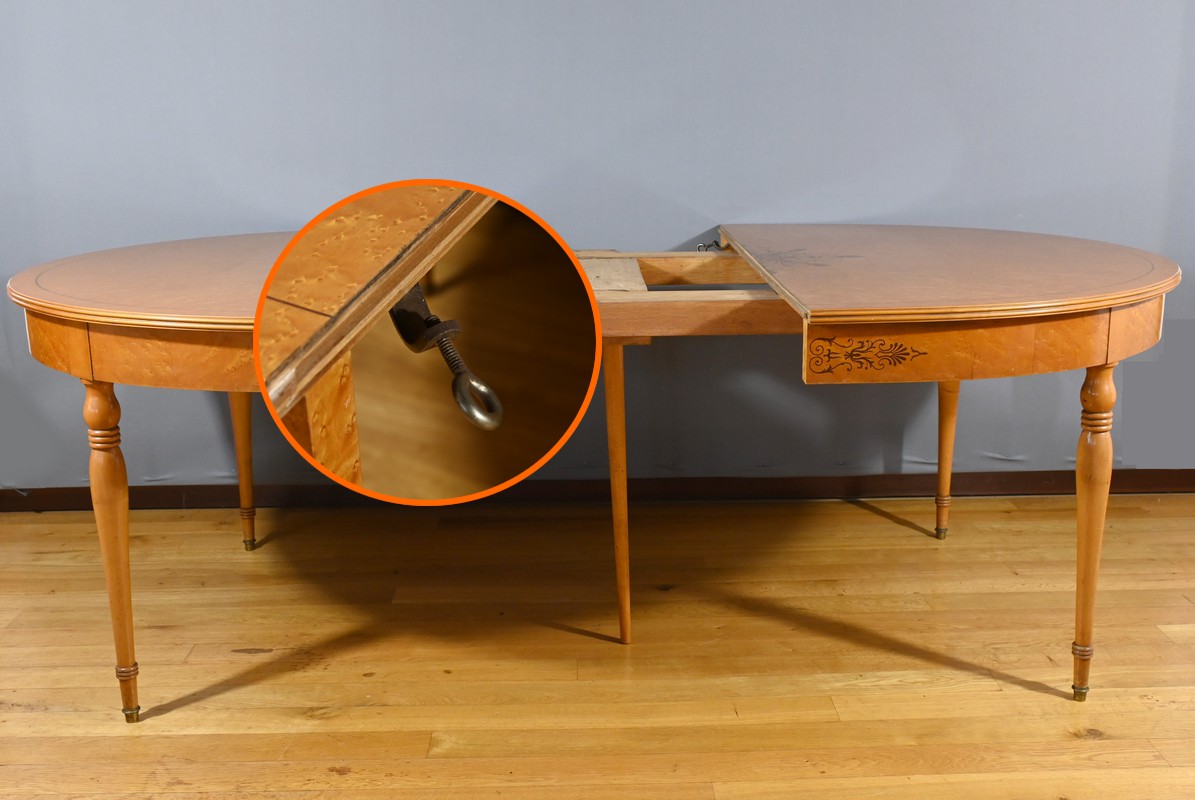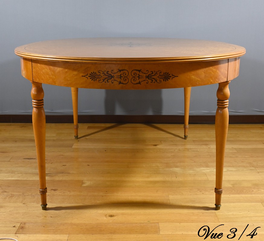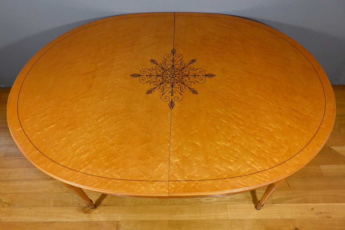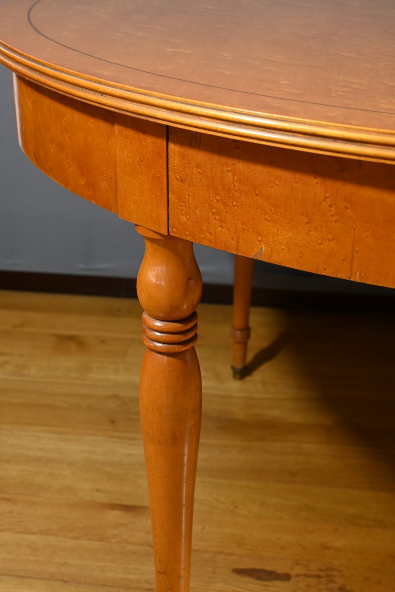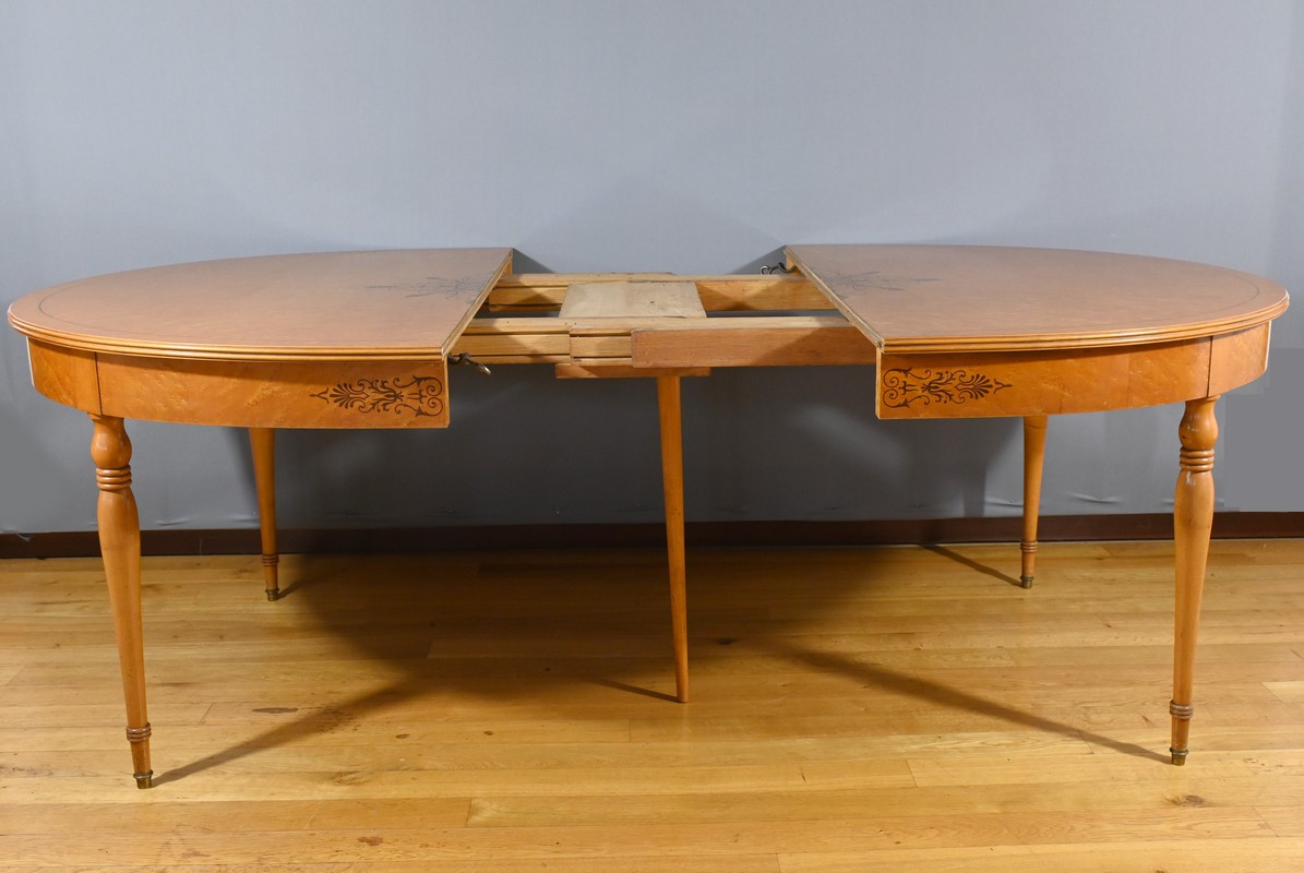 Cette table en érable moucheté évolutive, de style Charles X et datant du milieu du XXe siècle, est une pièce de mobilier remarquable.