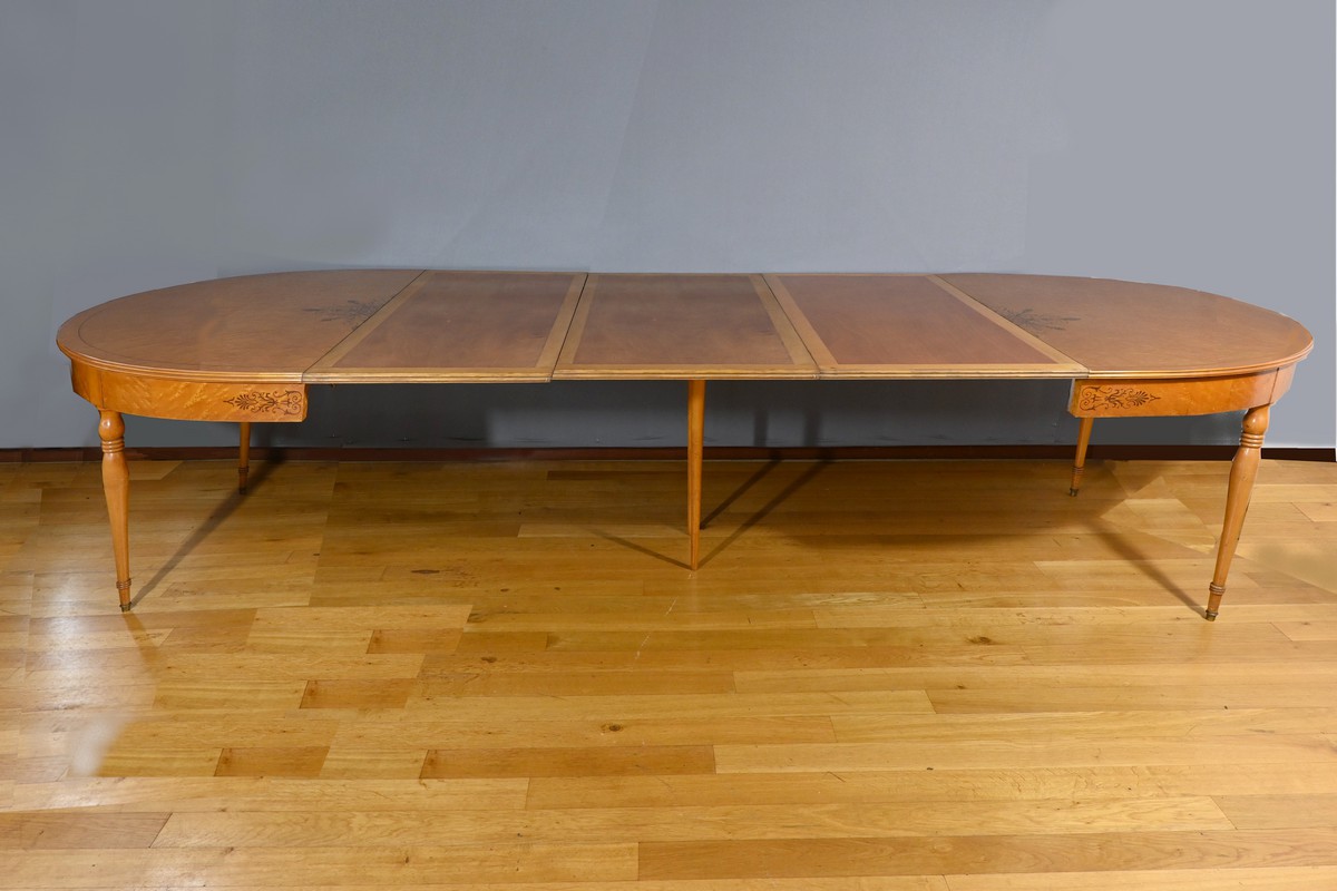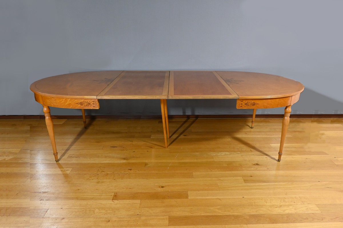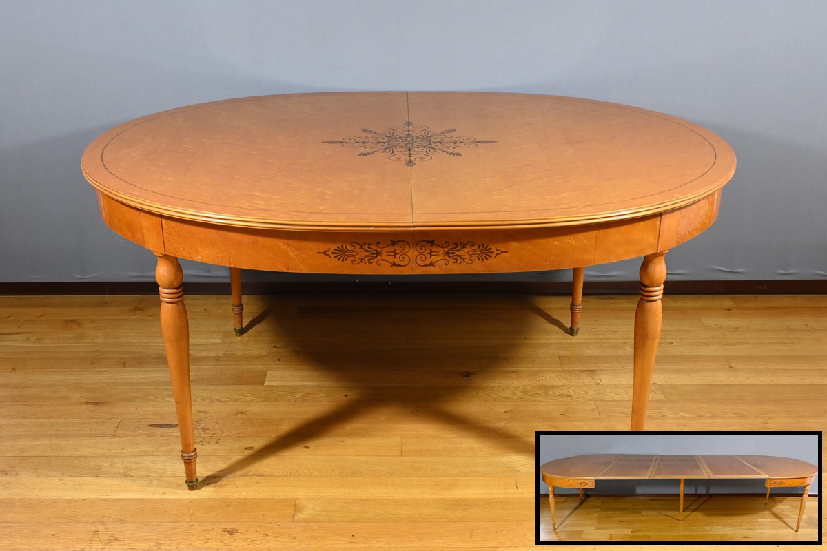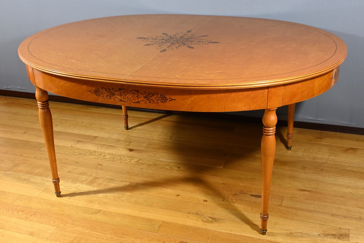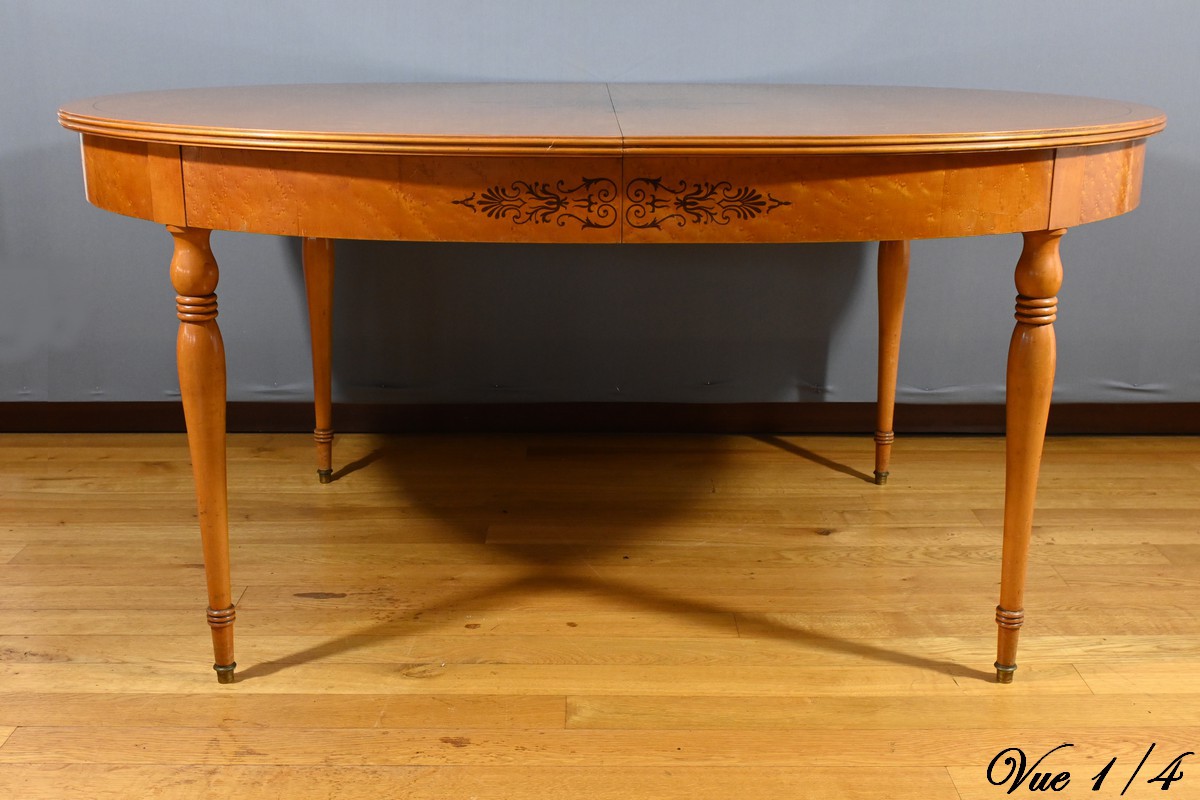 Cette table en érable moucheté évolutive, de style Charles X et datant du milieu du XXe siècle, est une pièce de mobilier remarquable.