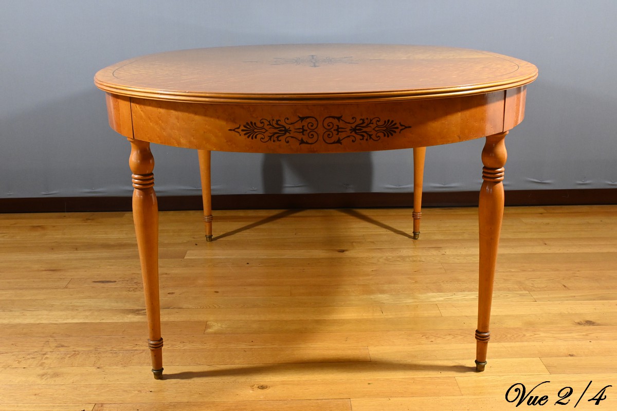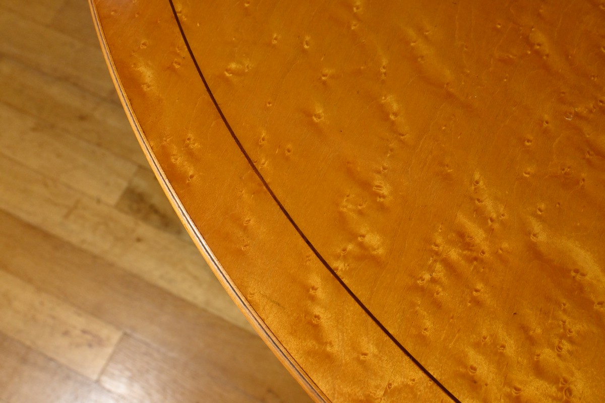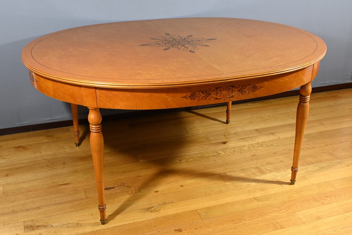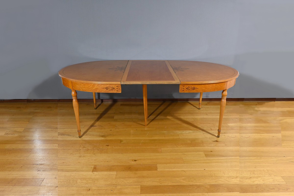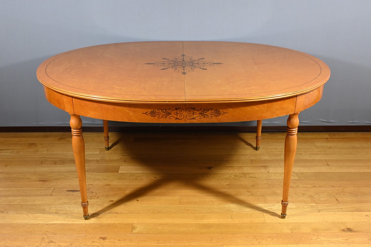 Cette table en érable moucheté évolutive, de style Charles X et datant du milieu du XXe siècle, est une pièce de mobilier remarquable.