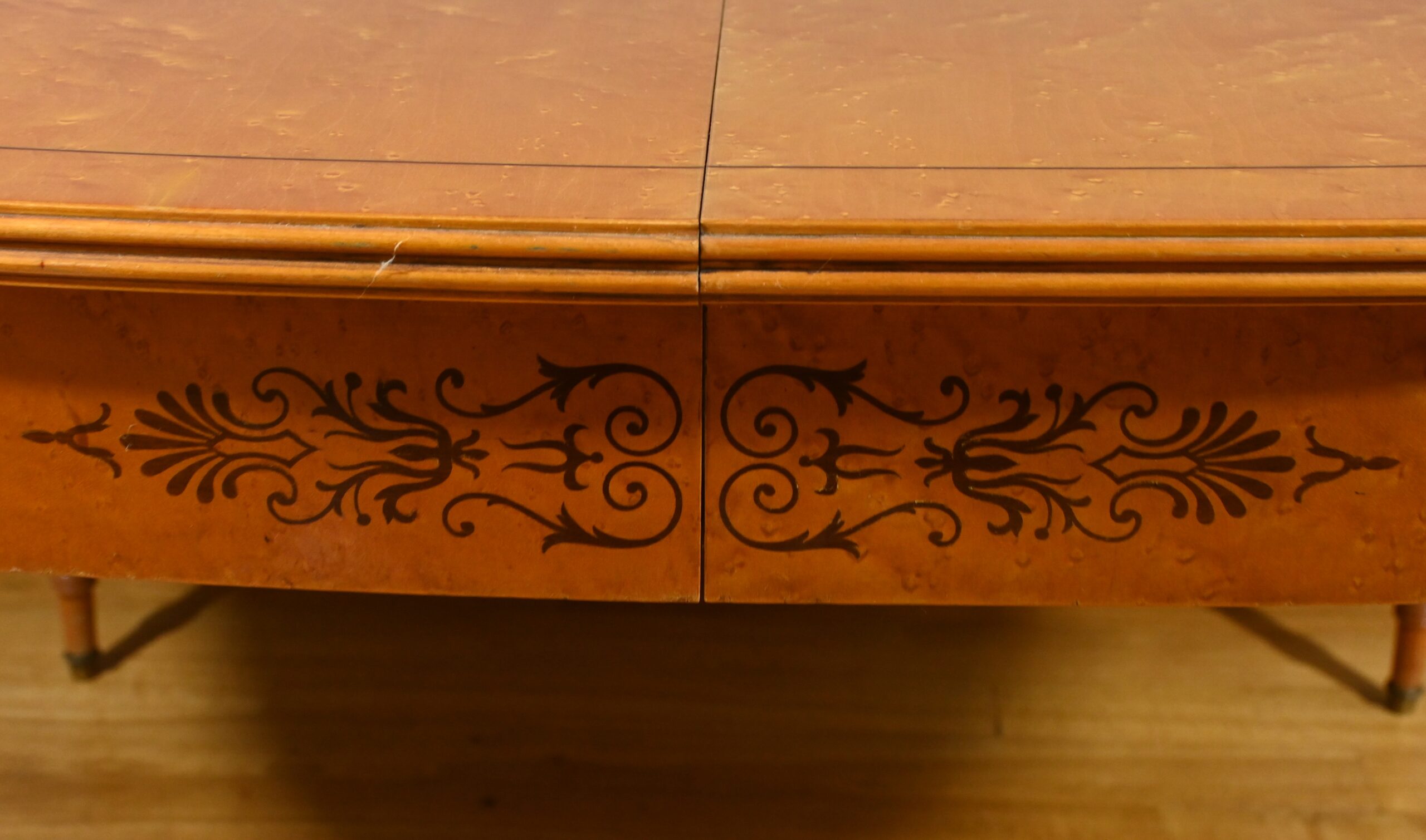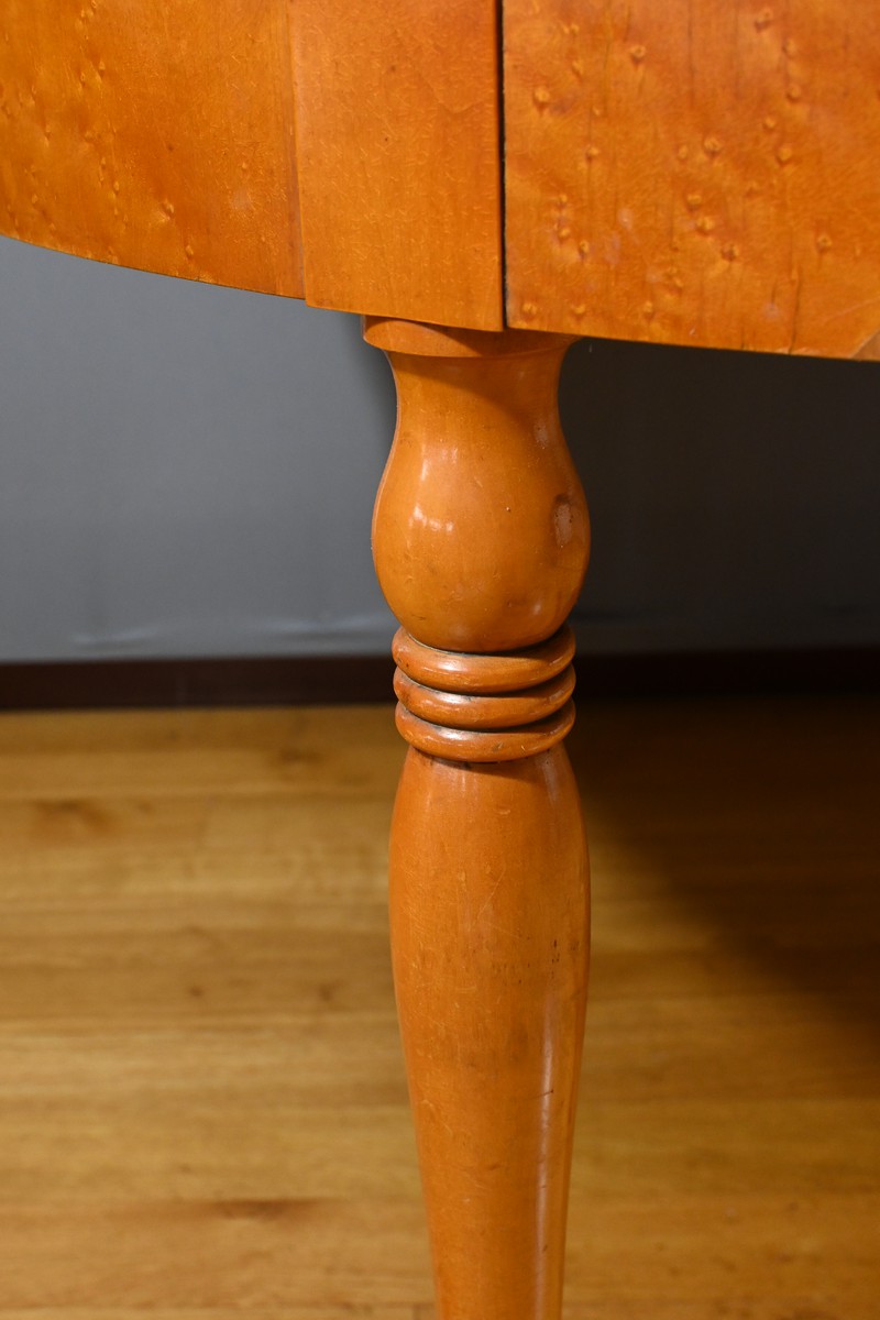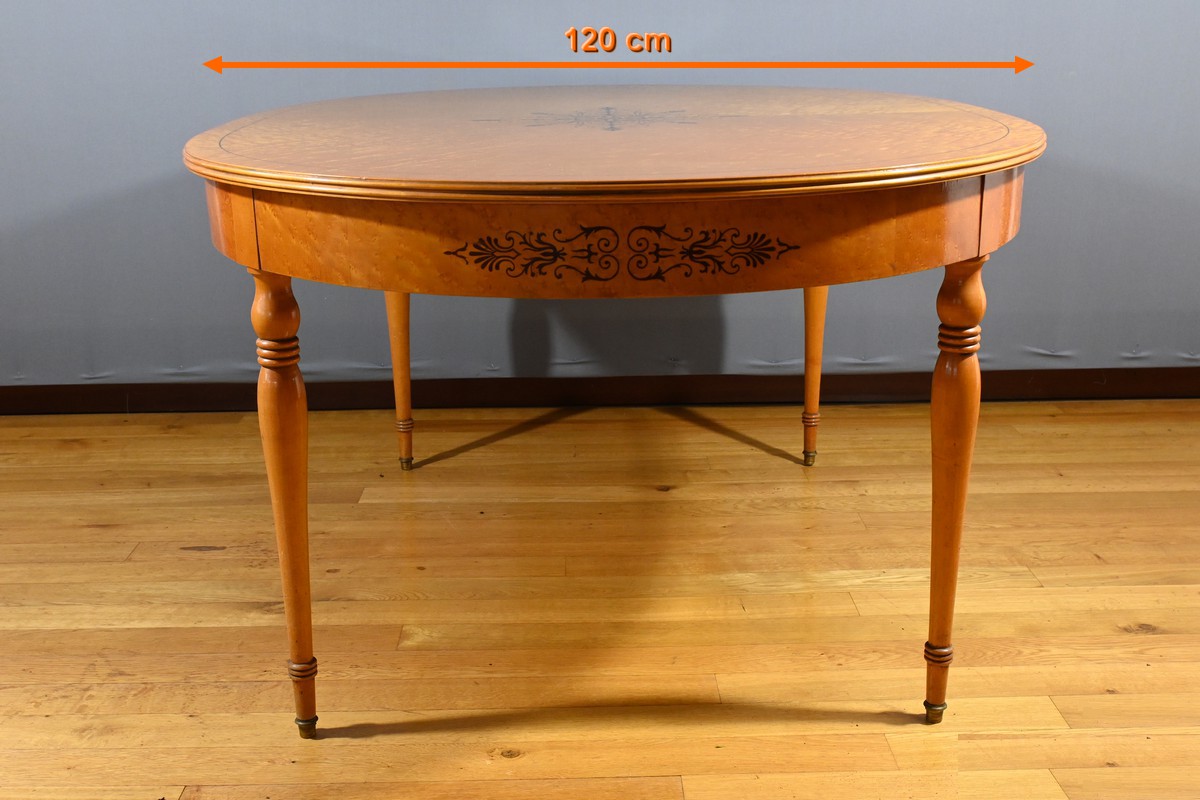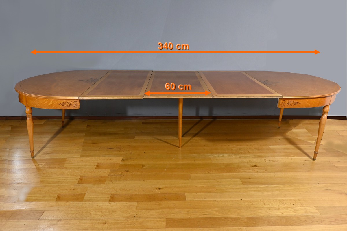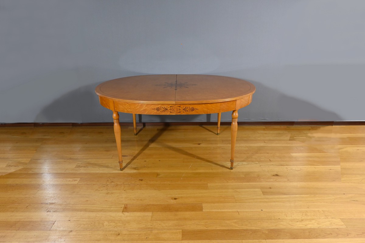 Cette table en érable moucheté évolutive, de style Charles X et datant du milieu du XXe siècle, est une pièce de mobilier remarquable.