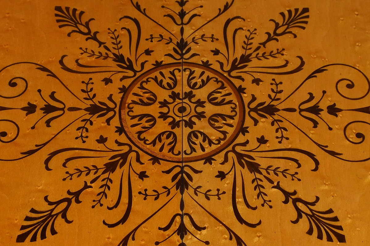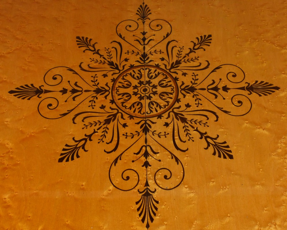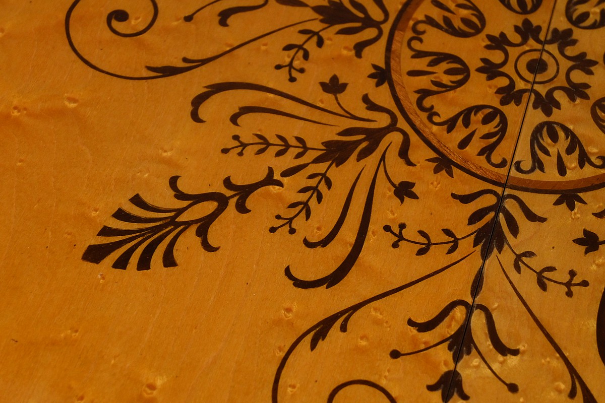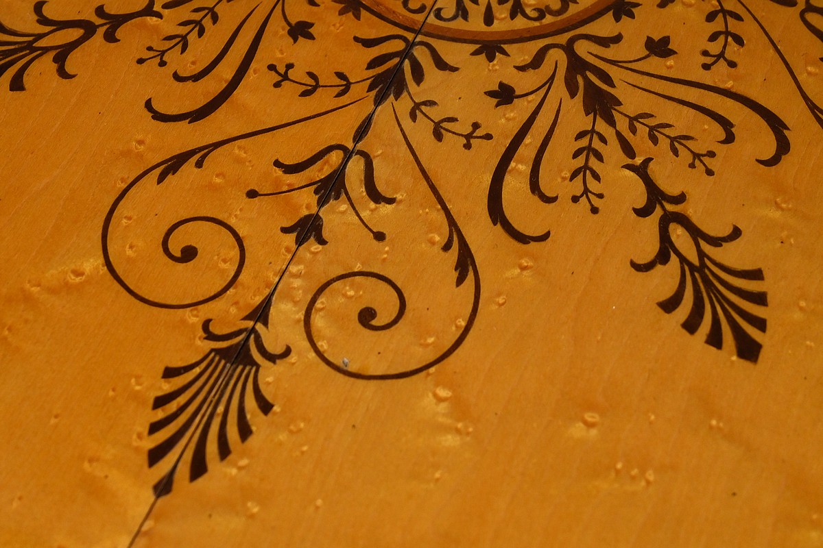 De forme ovale, elle présente un plateau décoré de rinceaux, volutes, palmettes et médaillon incrusté en palissandre, ajoutant une touche d’élégance et de raffinement.