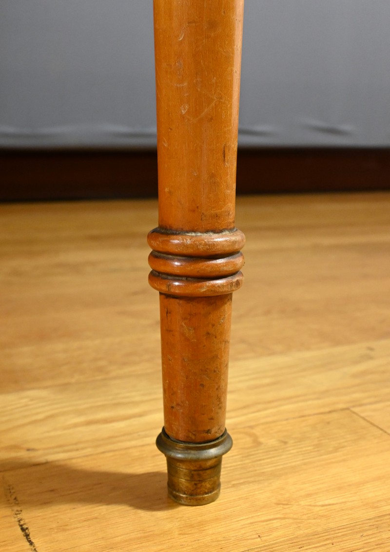 La ceinture, également ouvragée de filets identiques, repose sur quatre pieds tournés, à étranglement et renflés, se terminant par des sabots en bronze.