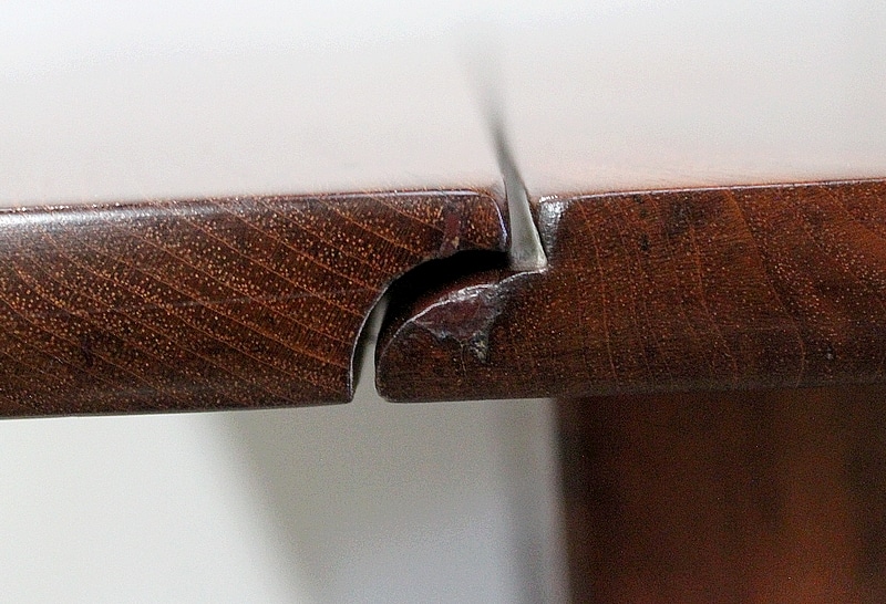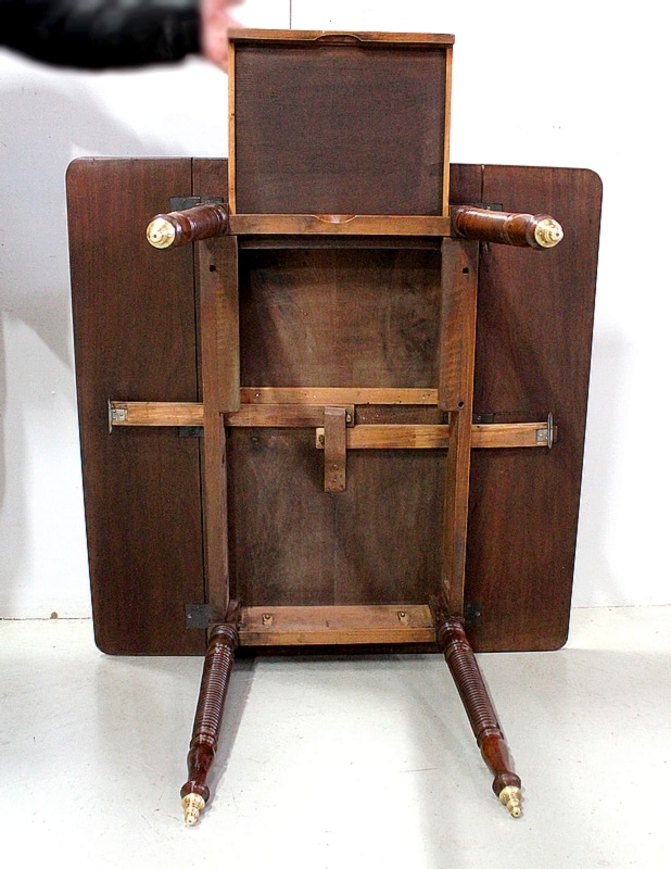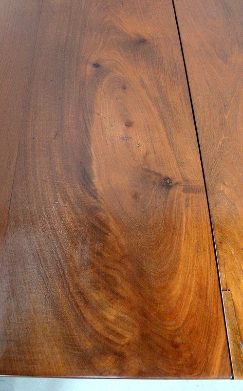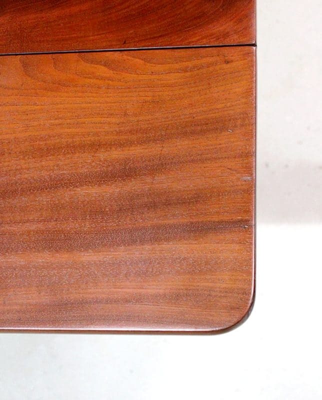 Le dessus hors volets est constitué de deux planches à débords. L’ensemble du plateau est composé d’un Acajou dit ‘Déployé’, offrant ainsi une Symétrique visuelle Parfaite dans les dessins du Bois.