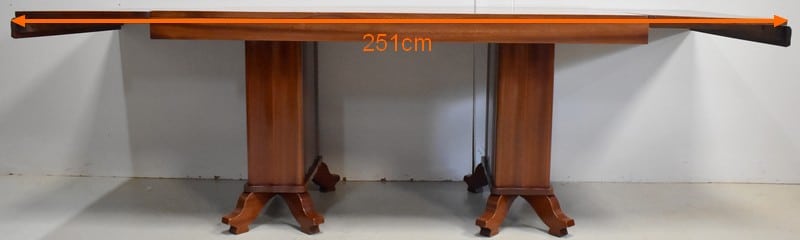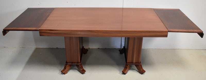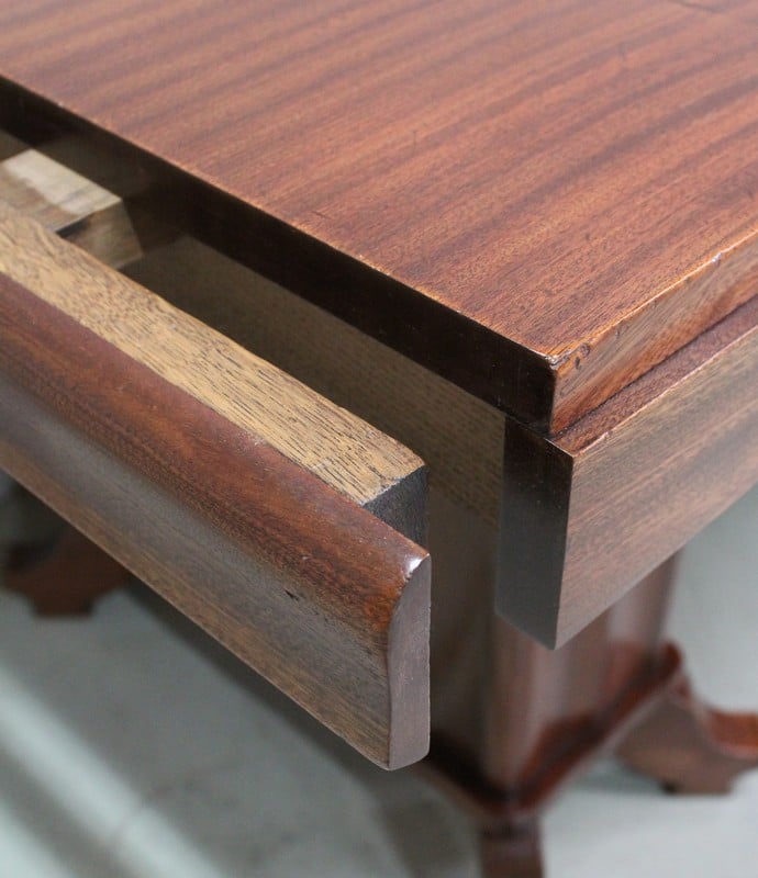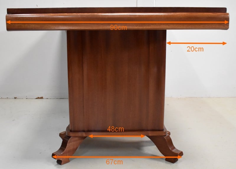 La ceinture de cette Table est en Acajou massif, tout comme les deux Blocs sur lesquels elle repose. Chacun de ces supports est lui même terminé par quatre pieds découpés. On notera la paradoxale alliance de ces Blocs de pieds Massifs inspirant la Robustesse, et de leurs lignes discrètement incurvées apportant de la Finesse à l’ensemble.