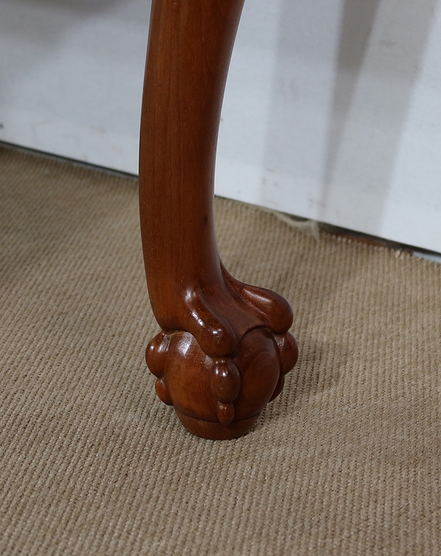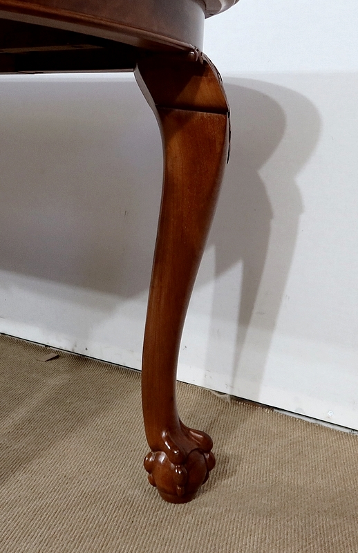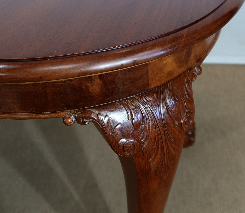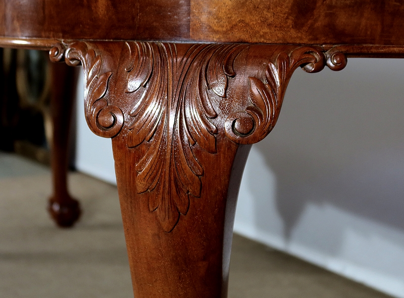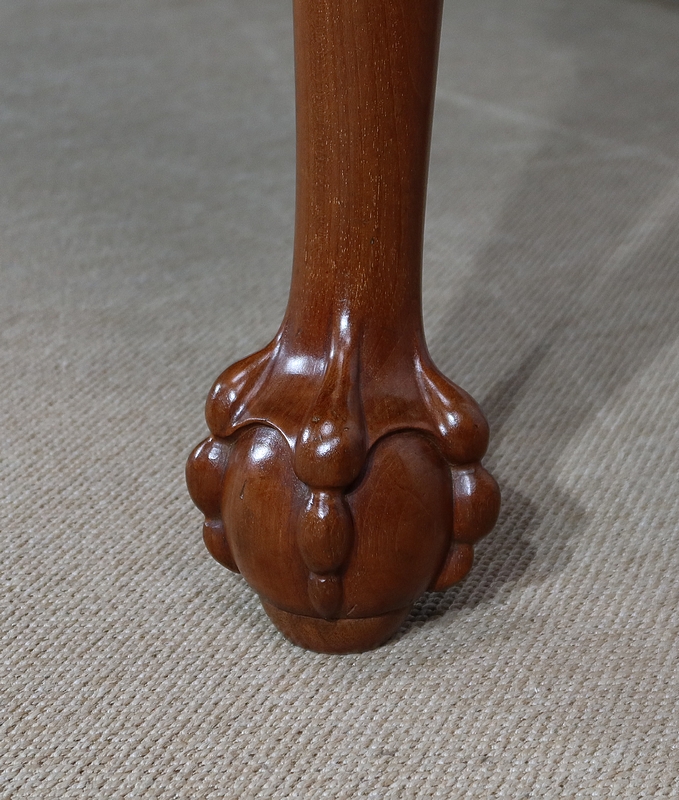Cette table originale repose sur quatre pieds en cabriole en acajou massif, se terminant par une boule enserrée dans des griffes stylisées. Le dessus à bosse est sculpté de rosaces et de feuilles d’acanthe.