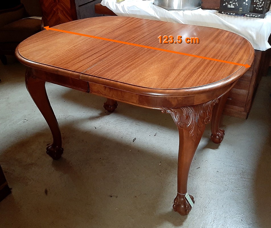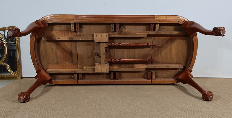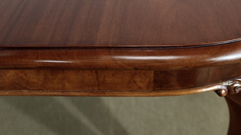 Cette table est sommée d’un dessus en acajou massif avec extrémités en forme d’anses de panier. Notons la présence d’un pourtour en bec de corbin avec moulure à gorge par-dessous. Ce dessus se compose de deux éléments en extérieurs d’une seule planche et deux allonges semi-fixe d’une seule planche également.