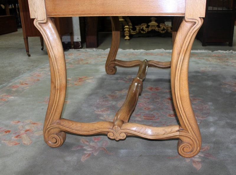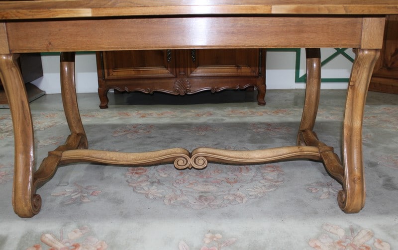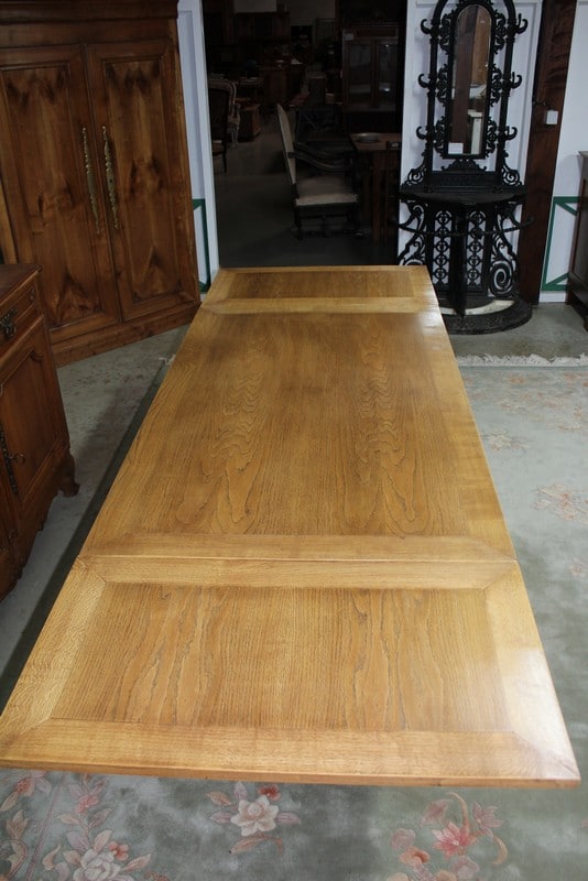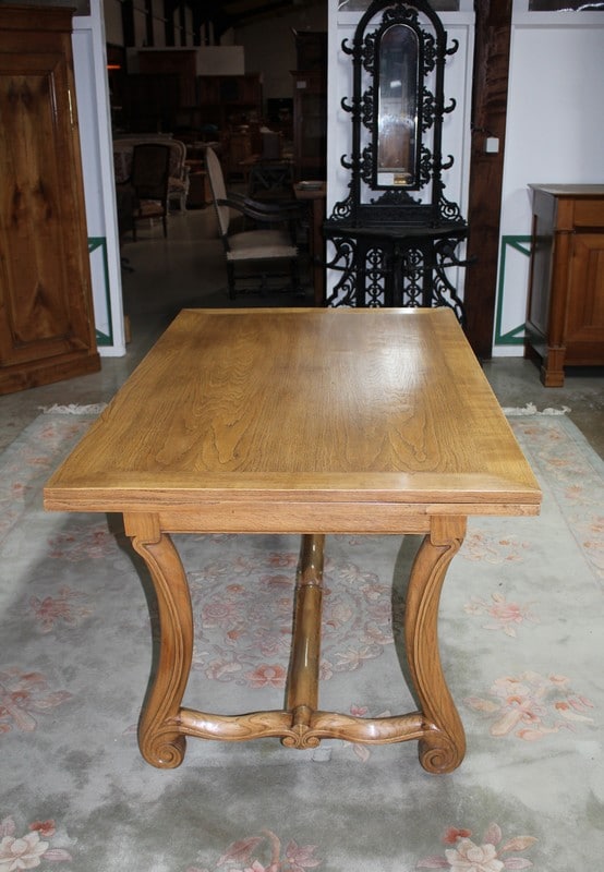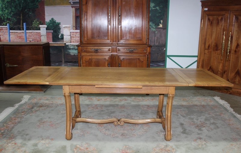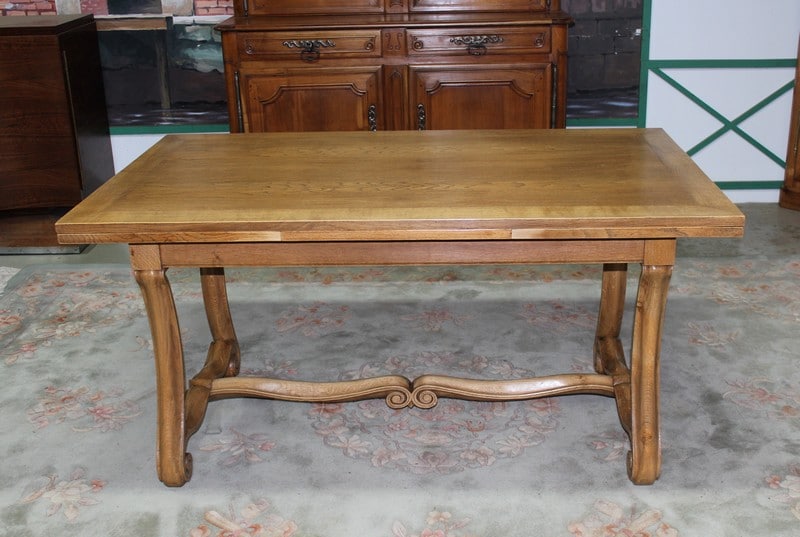 Table rectangulaire en chêne clair dans l’esprit Renaissance. Elle mesure, fermée, 150cm X 90cm pour une hauteur de 75cm. Avec 2 tirettes sa dimension est alors de 250cm X 90cm.